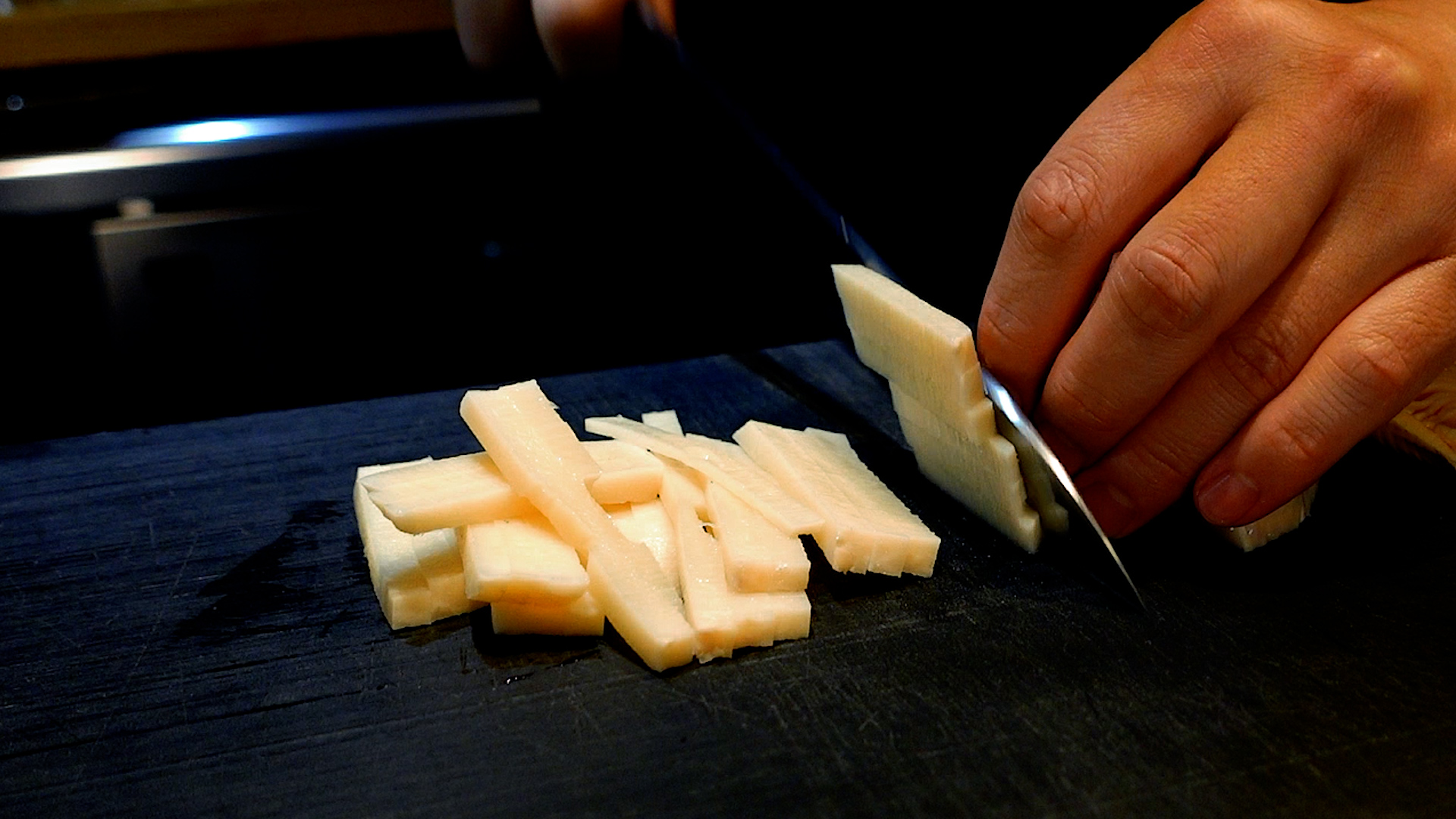 ゆでたけのこ(下処理済み)は細切りにし、ボウルに入れる。