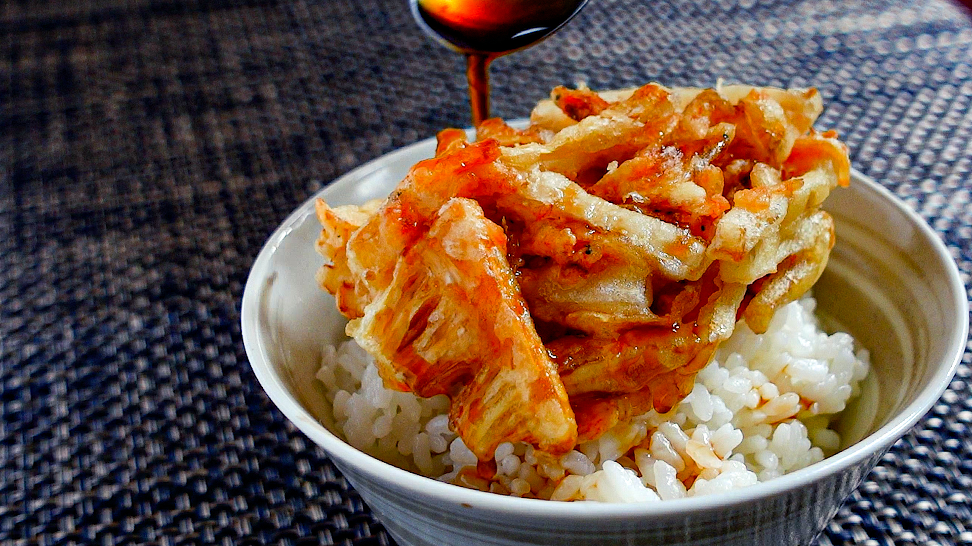 温かいごはんにかき揚げをのせ、天つゆをかける。