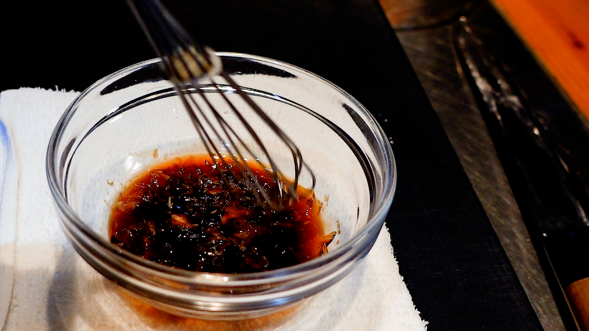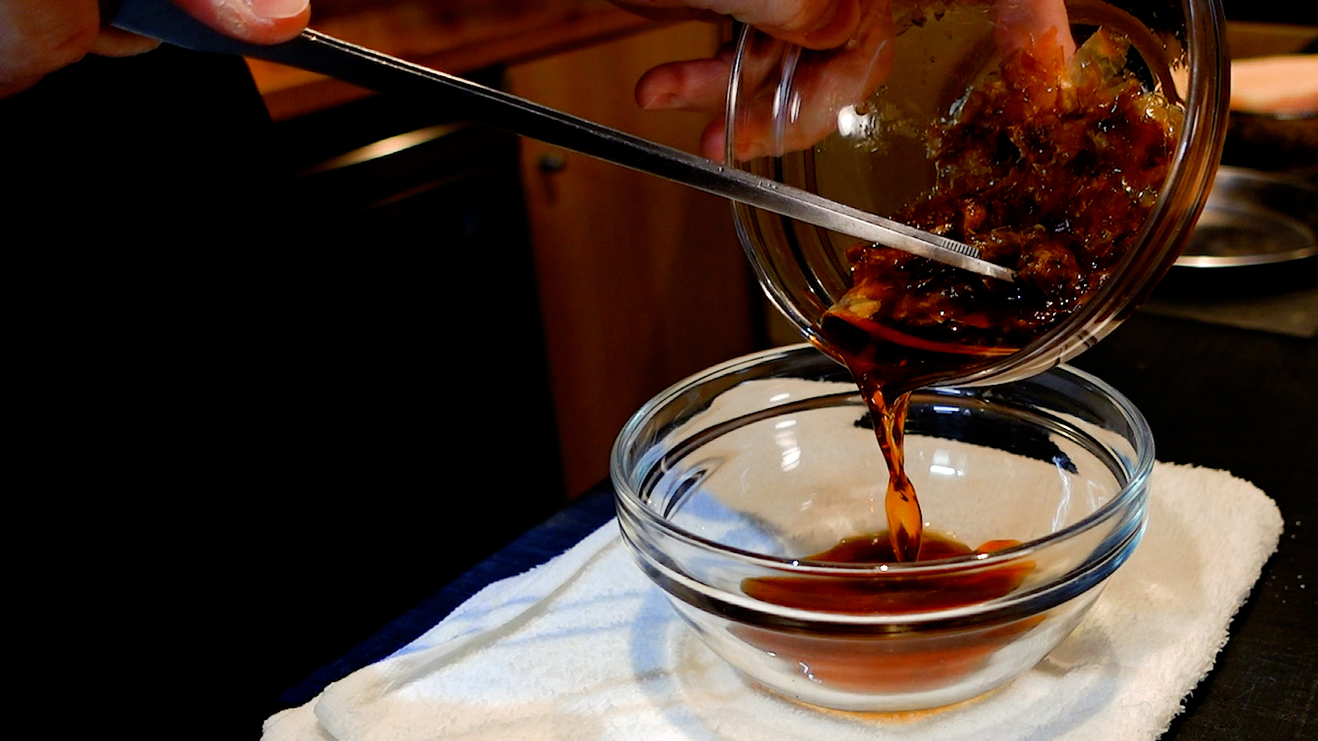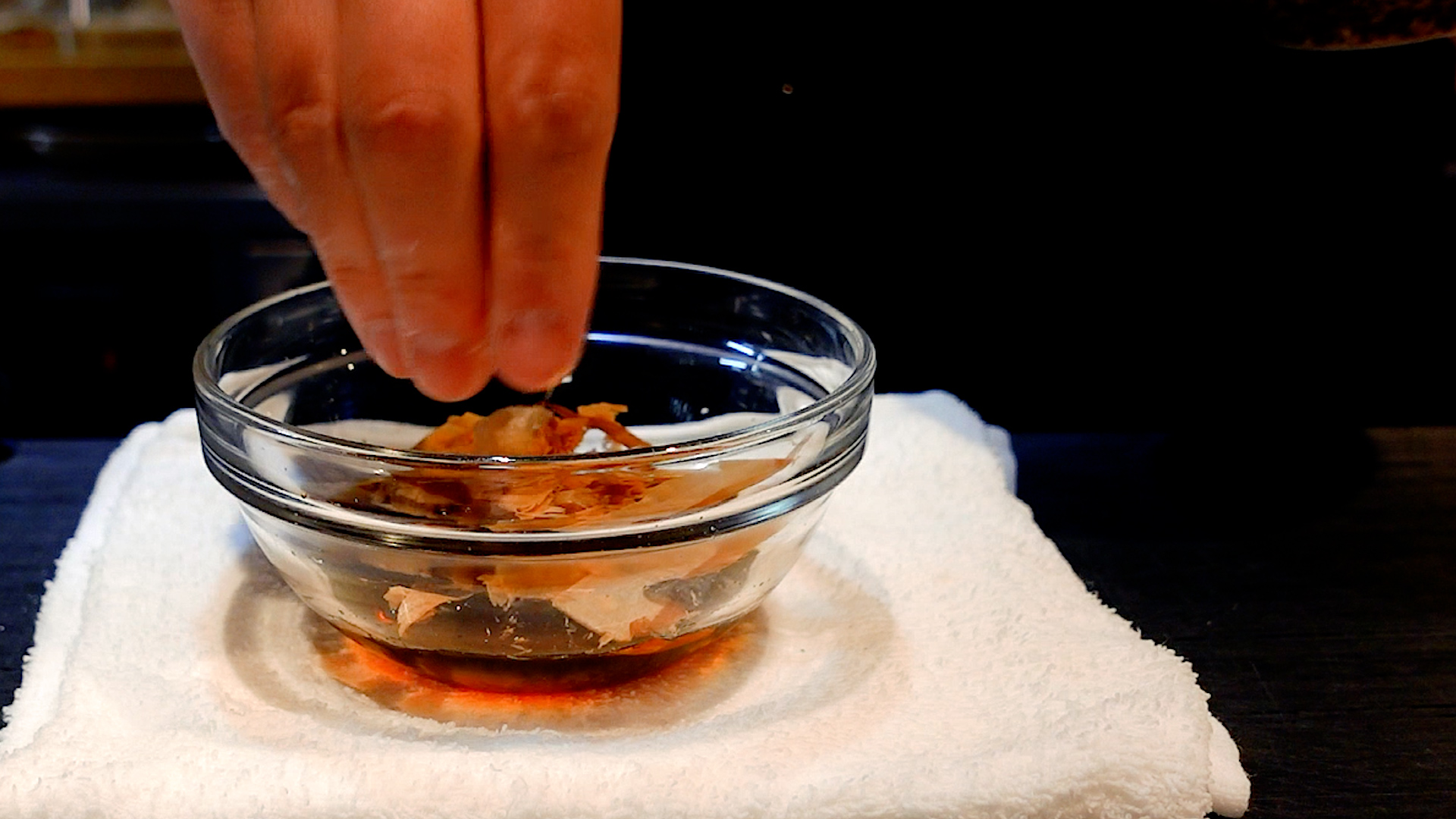 ◆醤油 大さじ2、砂糖 小さじ1、水 大さじ1を加え混ぜ合わせる。かつお節を加えなじませ1分おき、こす。