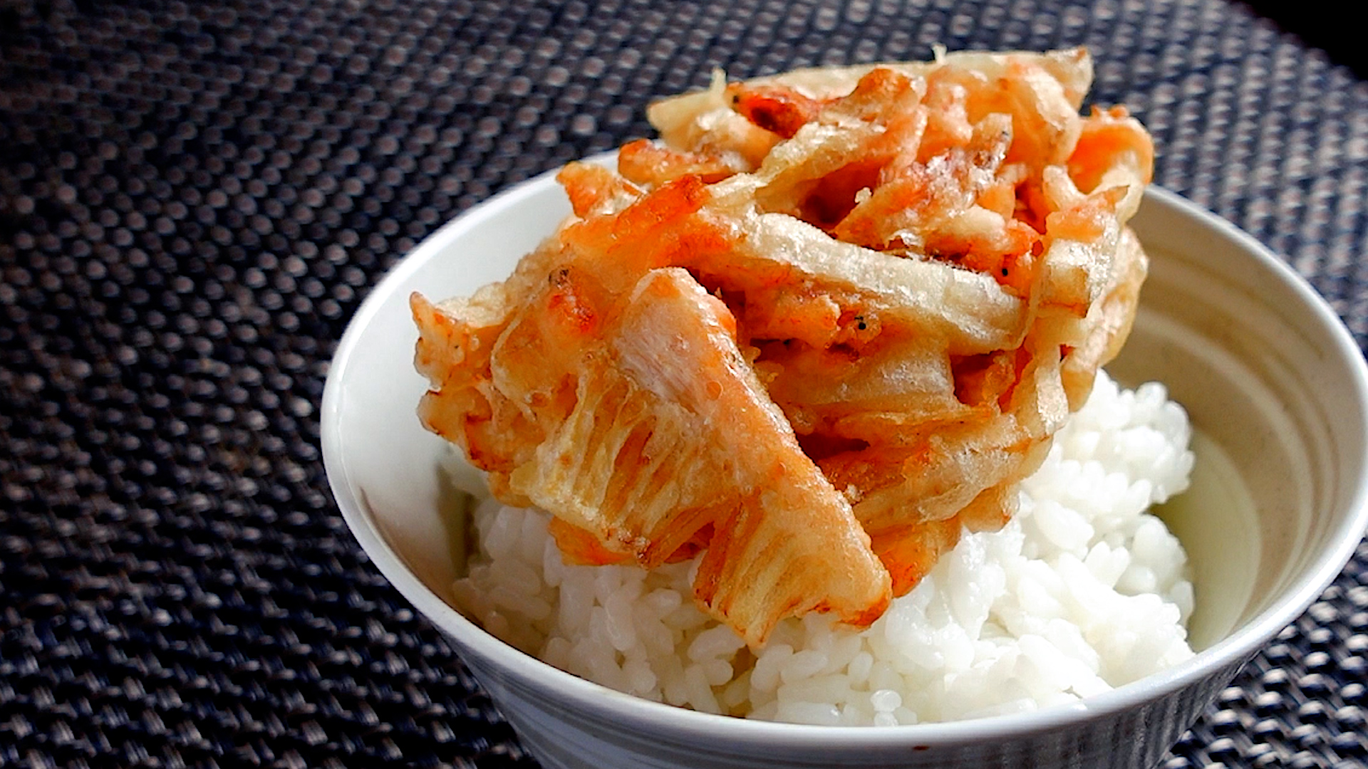 サクッ!と仕上げるプロの技【タケノコと海老のかき揚げ丼】市販の天ぷら粉に簡単天つゆでお店の味を実現レシピ。春の味覚、筍の風味に海老のうま味と香りを、どうぞ。