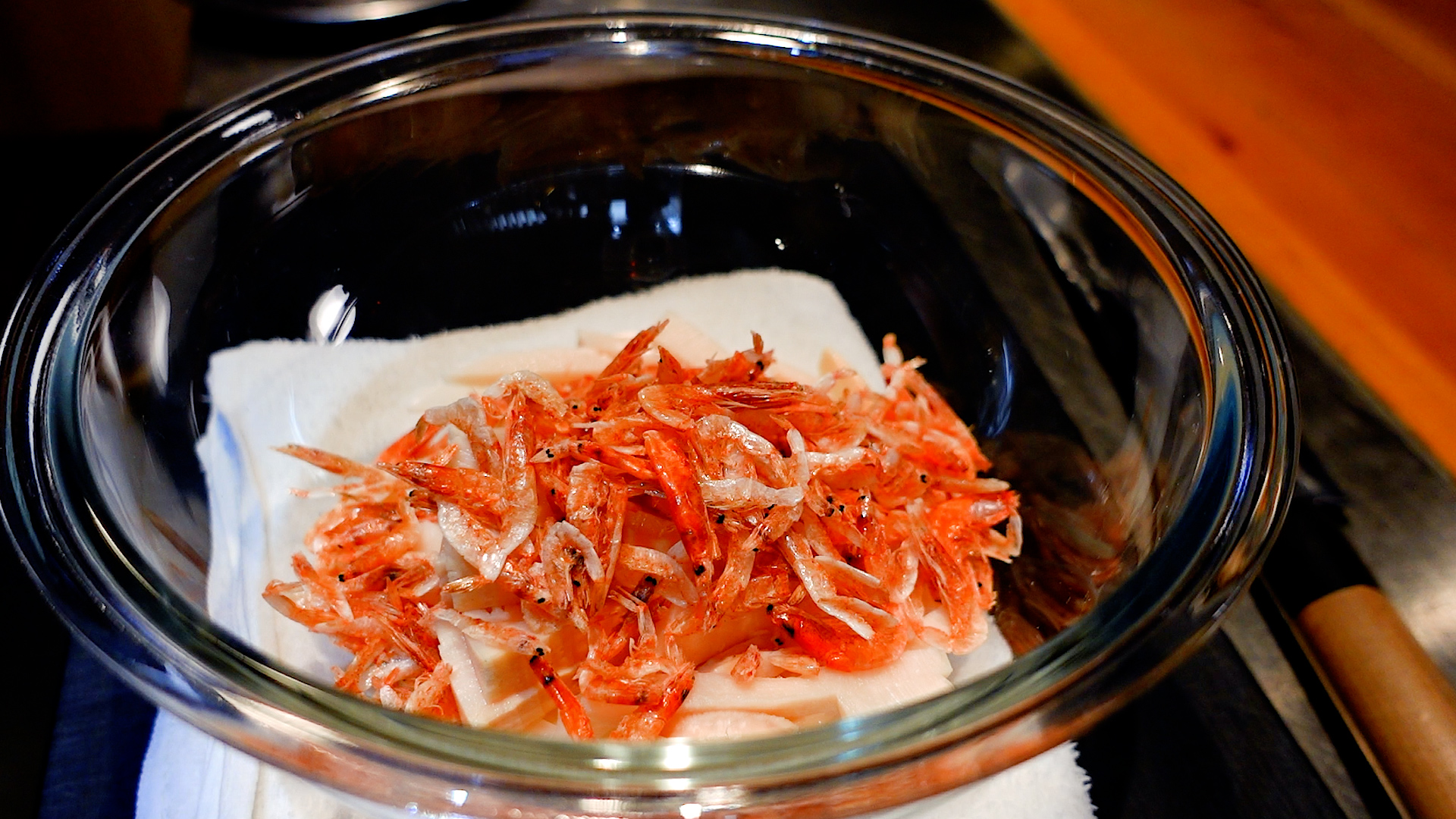 ボウルに干し海老を加え、薄力粉をまぶし混ぜ合わせる。