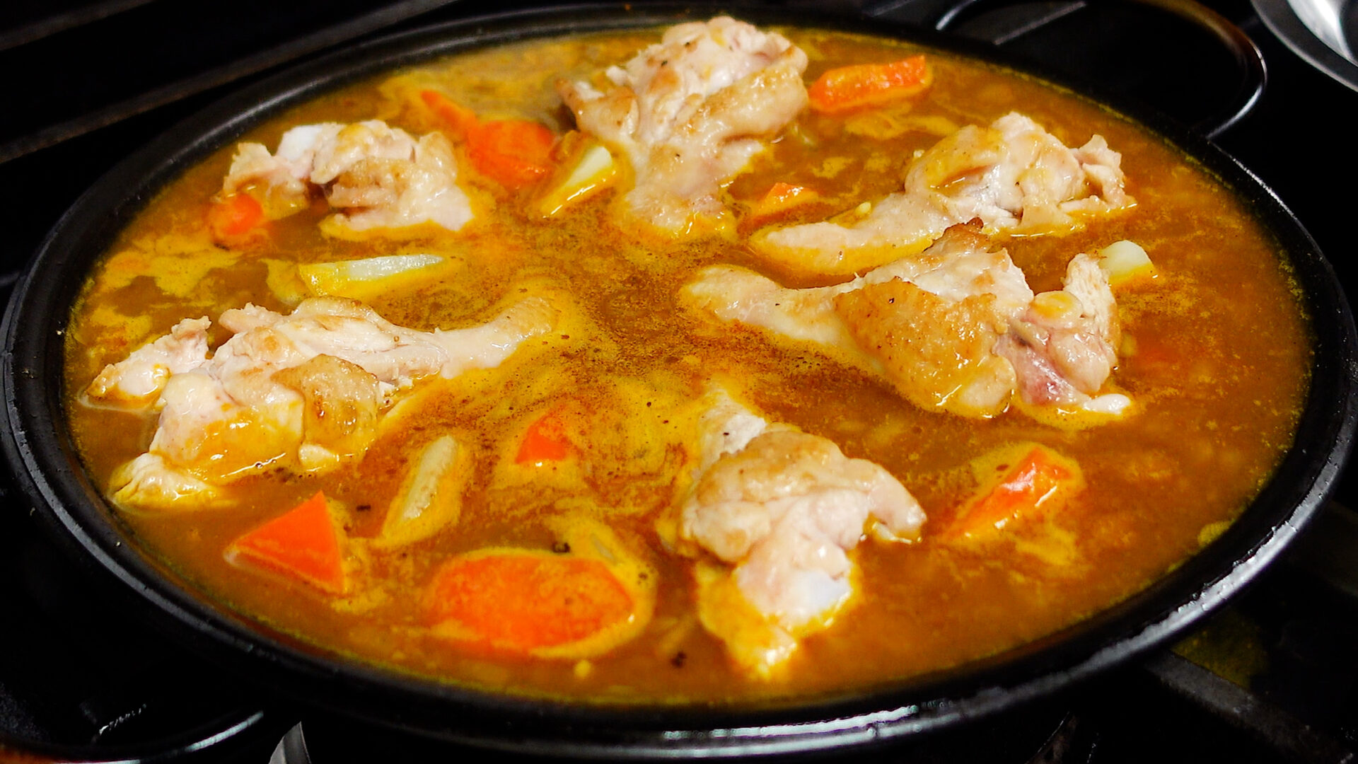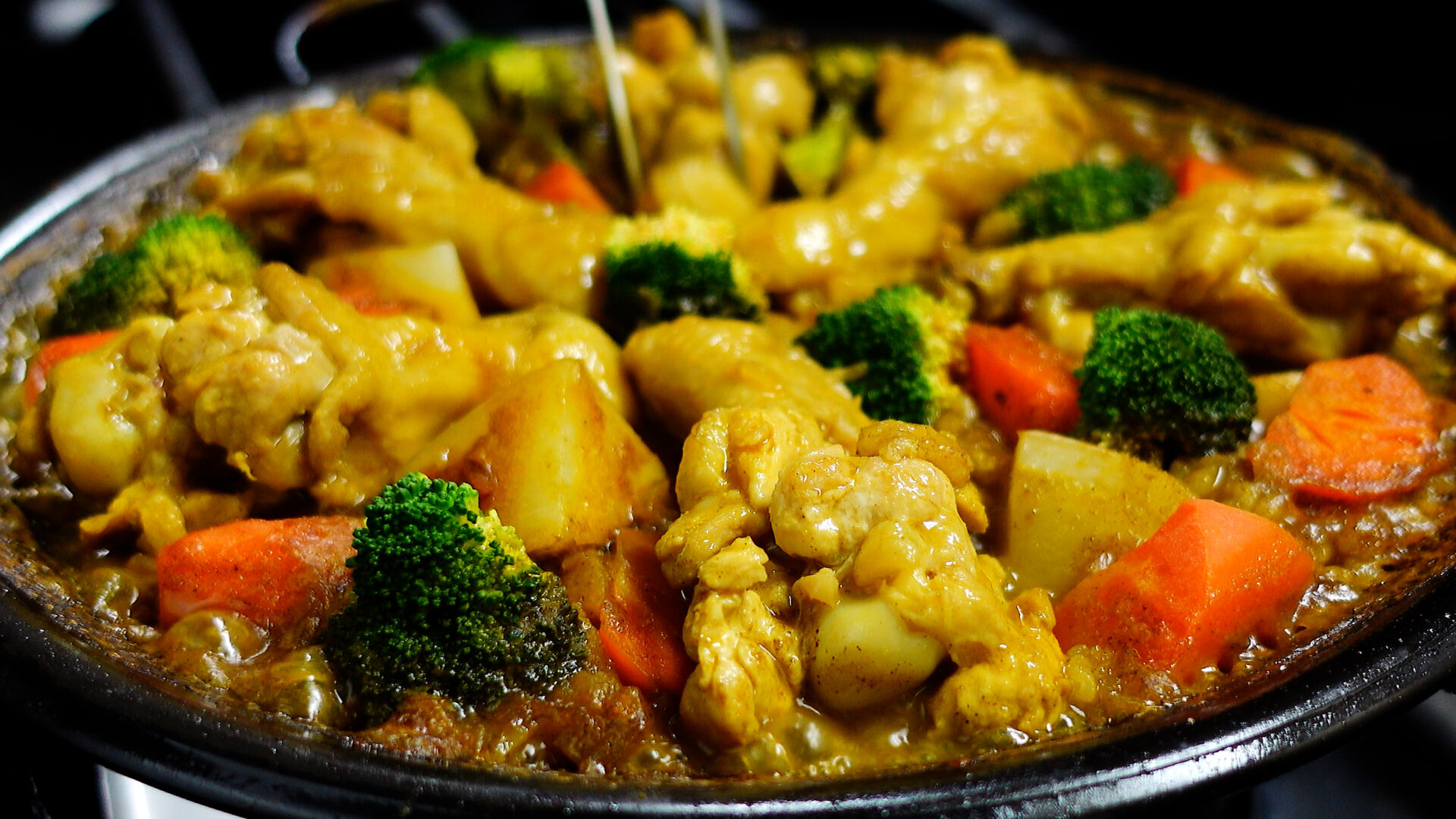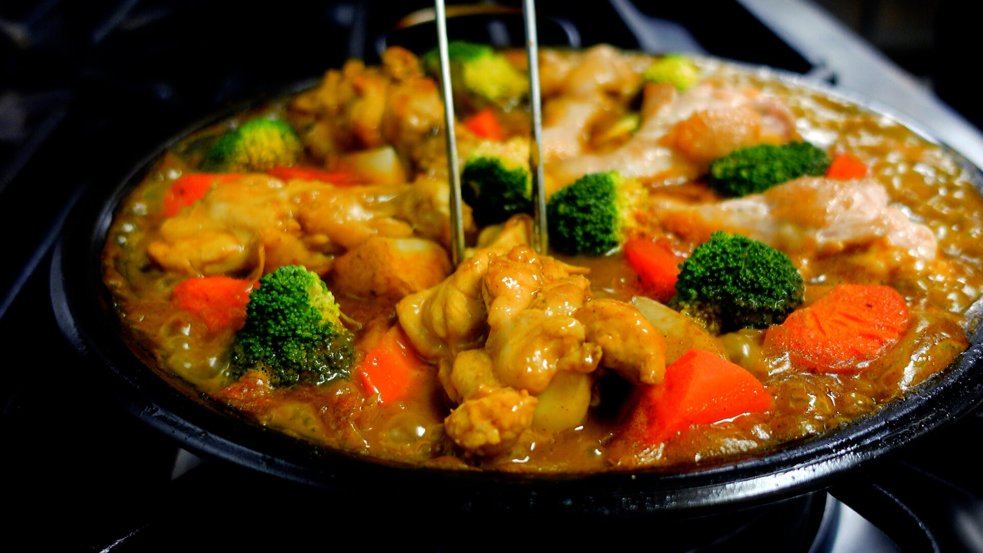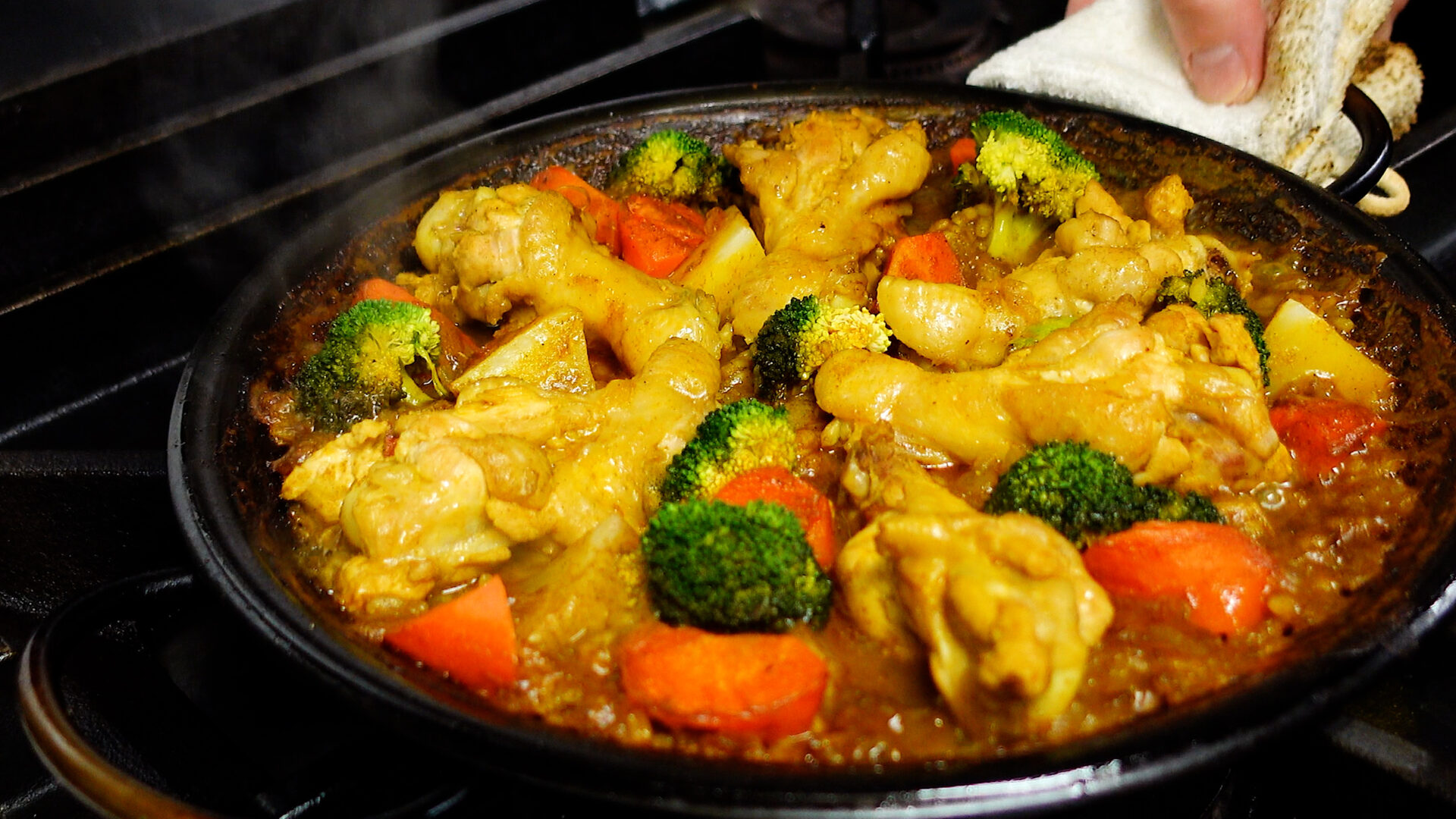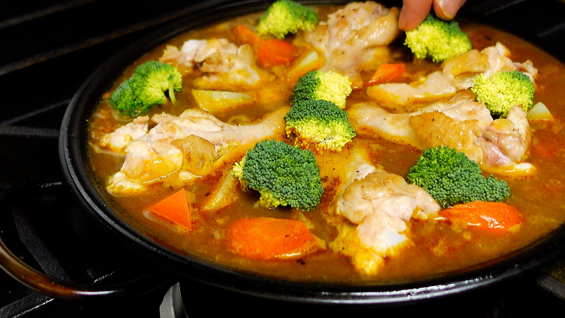 じゃがいも、にんじん、手羽元、ブロッコリーをのせ、フツフツとしてきたら弱火にし、20分~25分ほど煮詰める(途中、手羽元を2~3回ひっくり返す)。