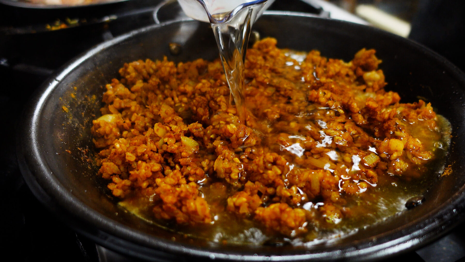 いい香りがしてきたら水、鶏ガラスープの素を加えヘラで混ぜ、米を平らに広げる。