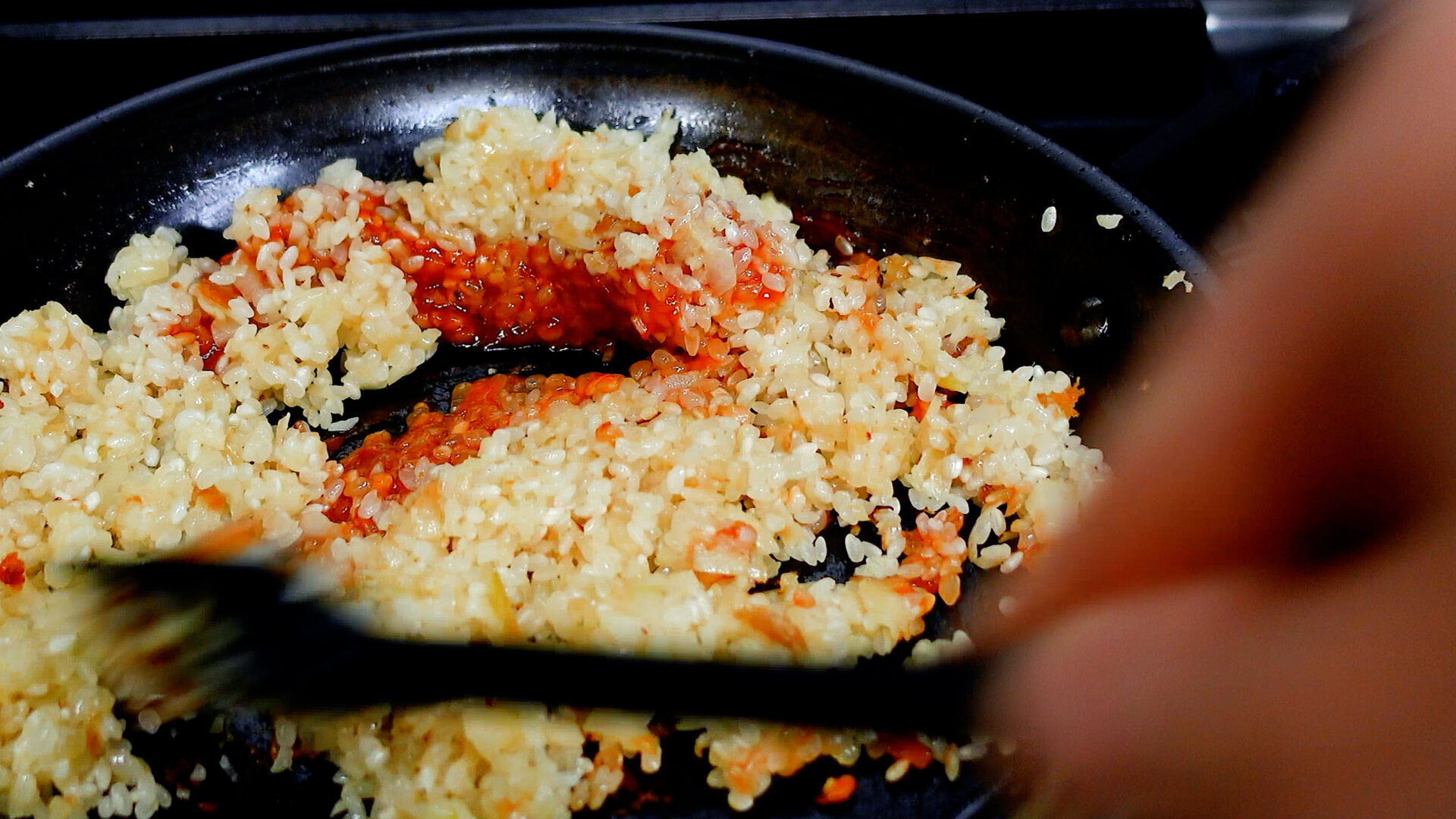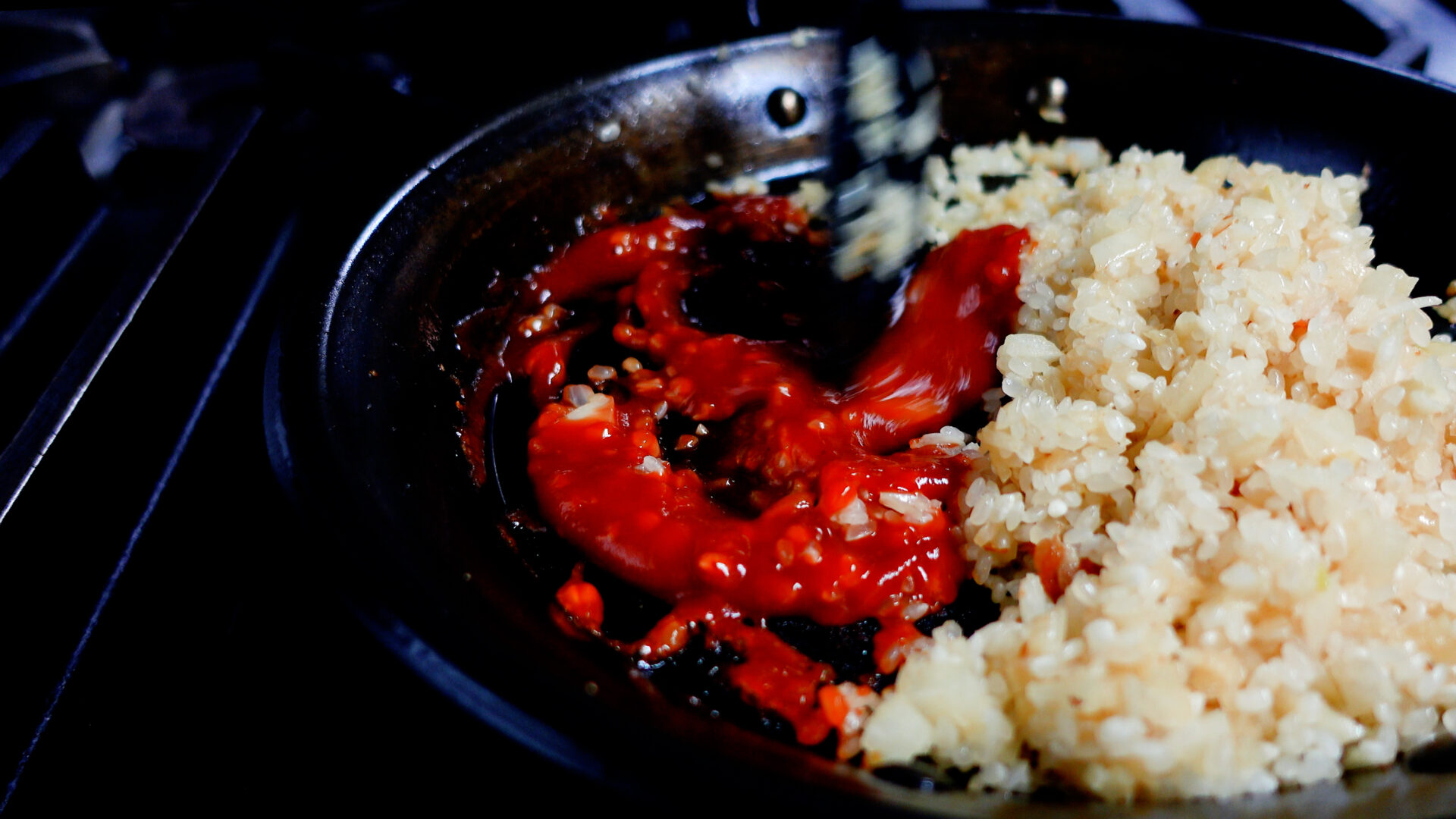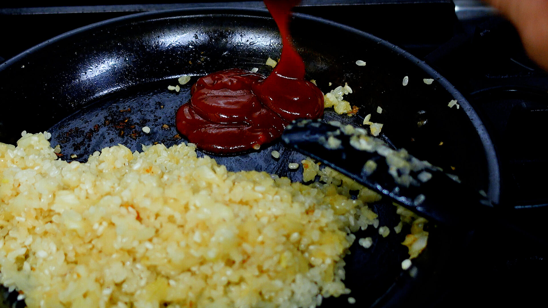 スペースをあけケチャップを加え、かるく煮詰めてから米と合わせる。