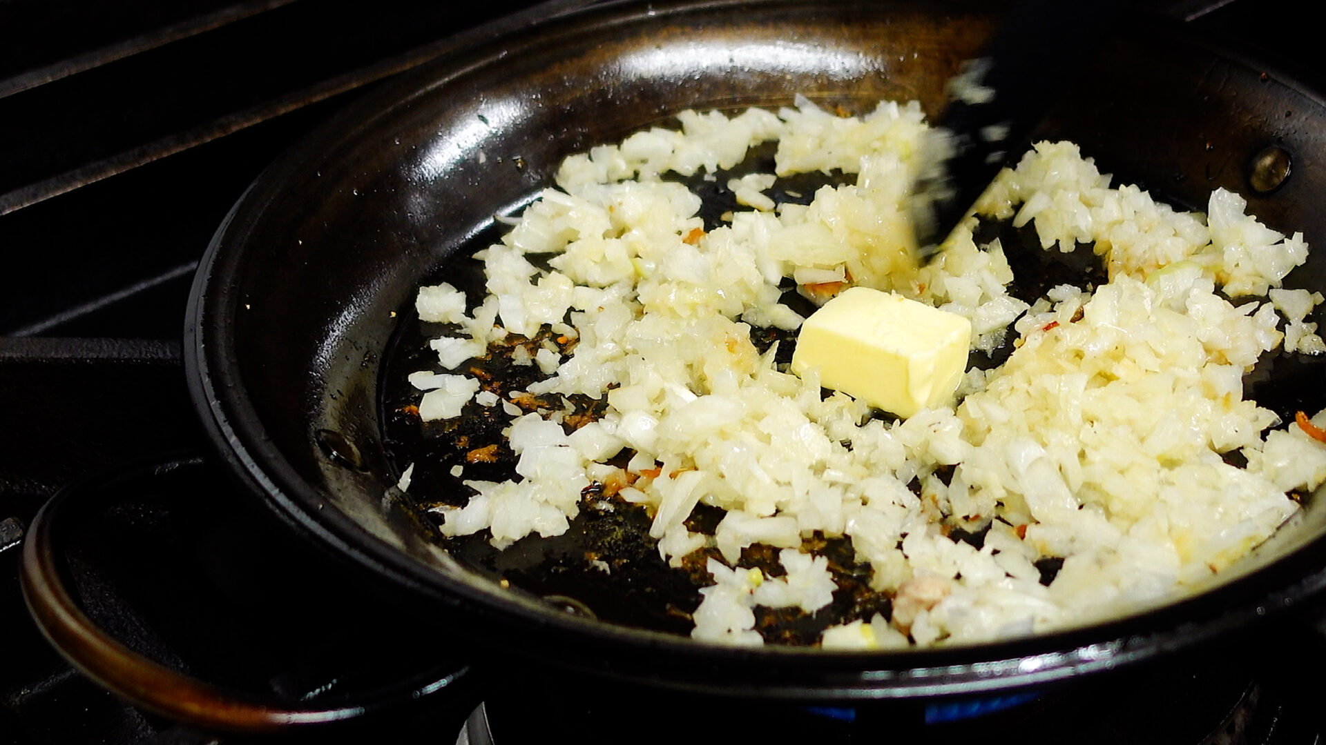 バターを加え玉ねぎが茶色く色づくまで炒める。