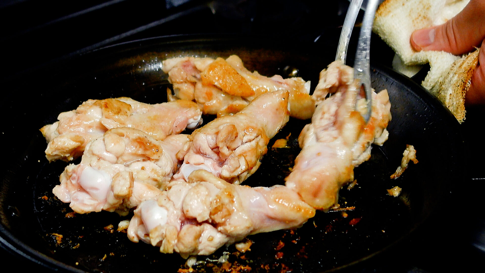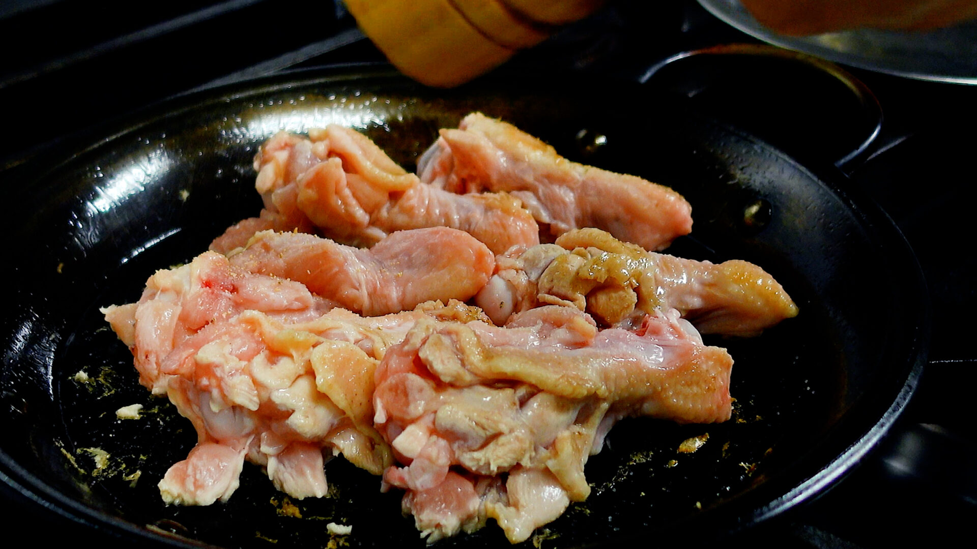 💡この段階では火を通すのではなく、焼き目をつけうまみを引き出すのが目的。パエリアパンに残る鶏肉の焦げや油がうまみになります!
