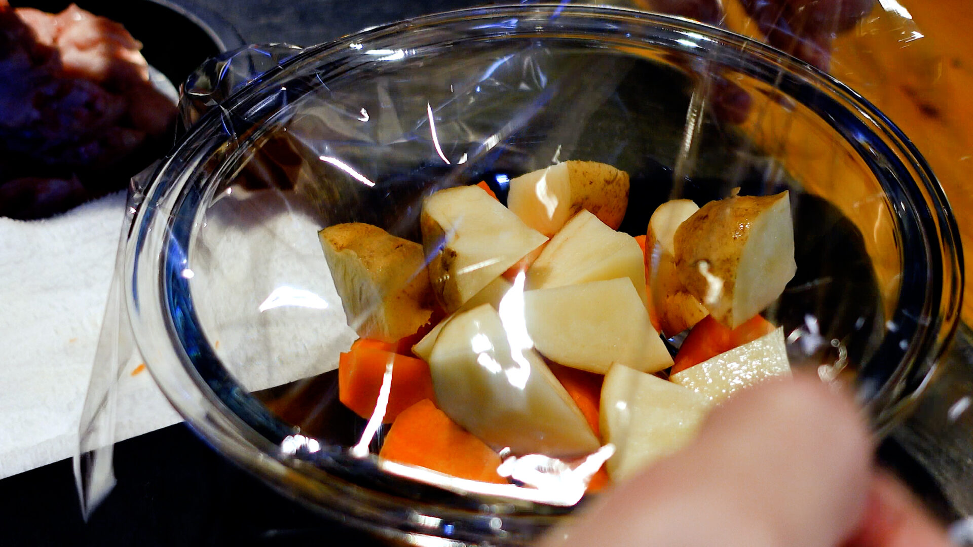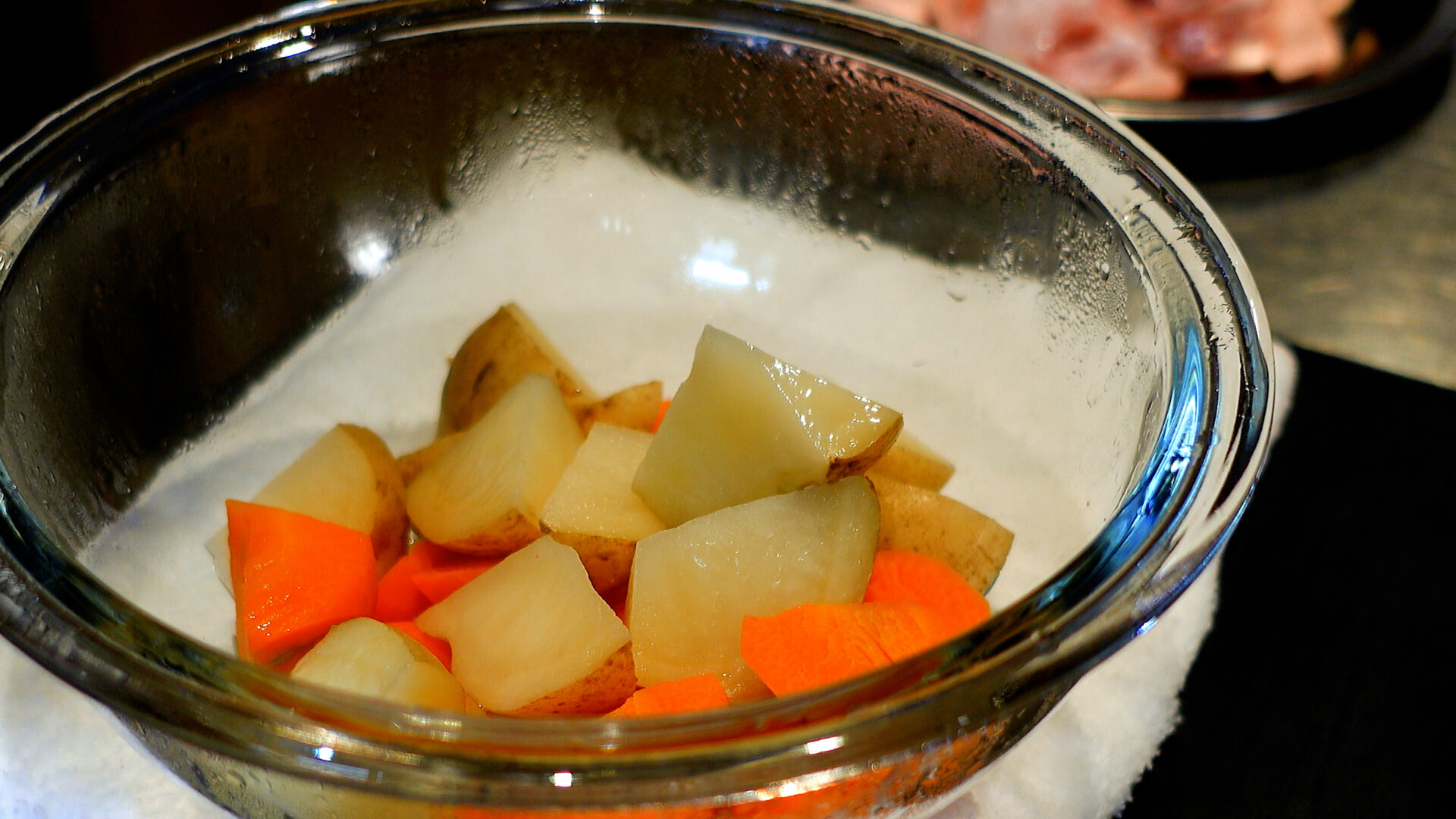 にんじんは乱切り、じゃがいもは皮付きのまま乱切りにする。耐熱容器に入れラップをし、電子レンジで加熱する(串がすこし刺さる程度でOK)。