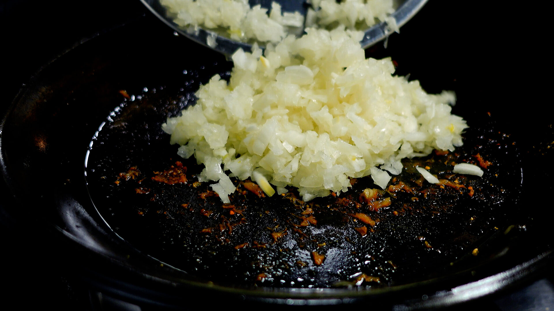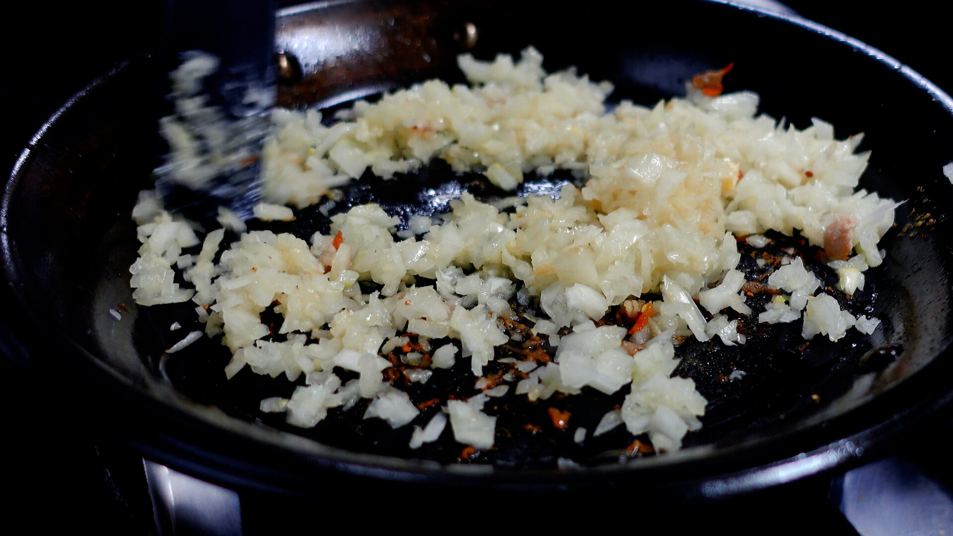 パエリアパンは洗わずに、にんにく、玉ねぎ、オリーブ油 大さじ1を入れ中火にかけ、焦げを削るように炒める。