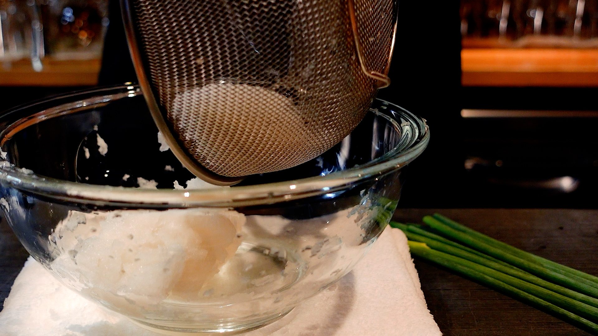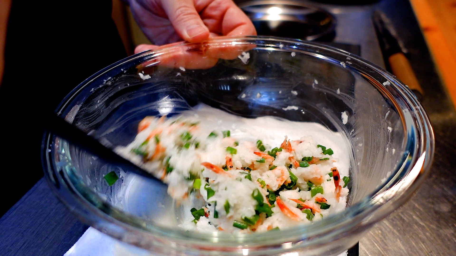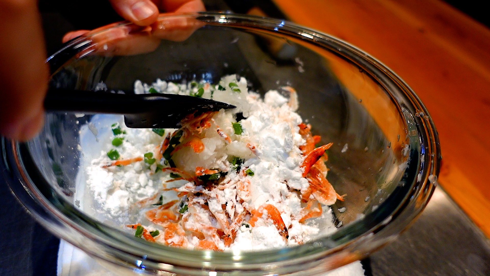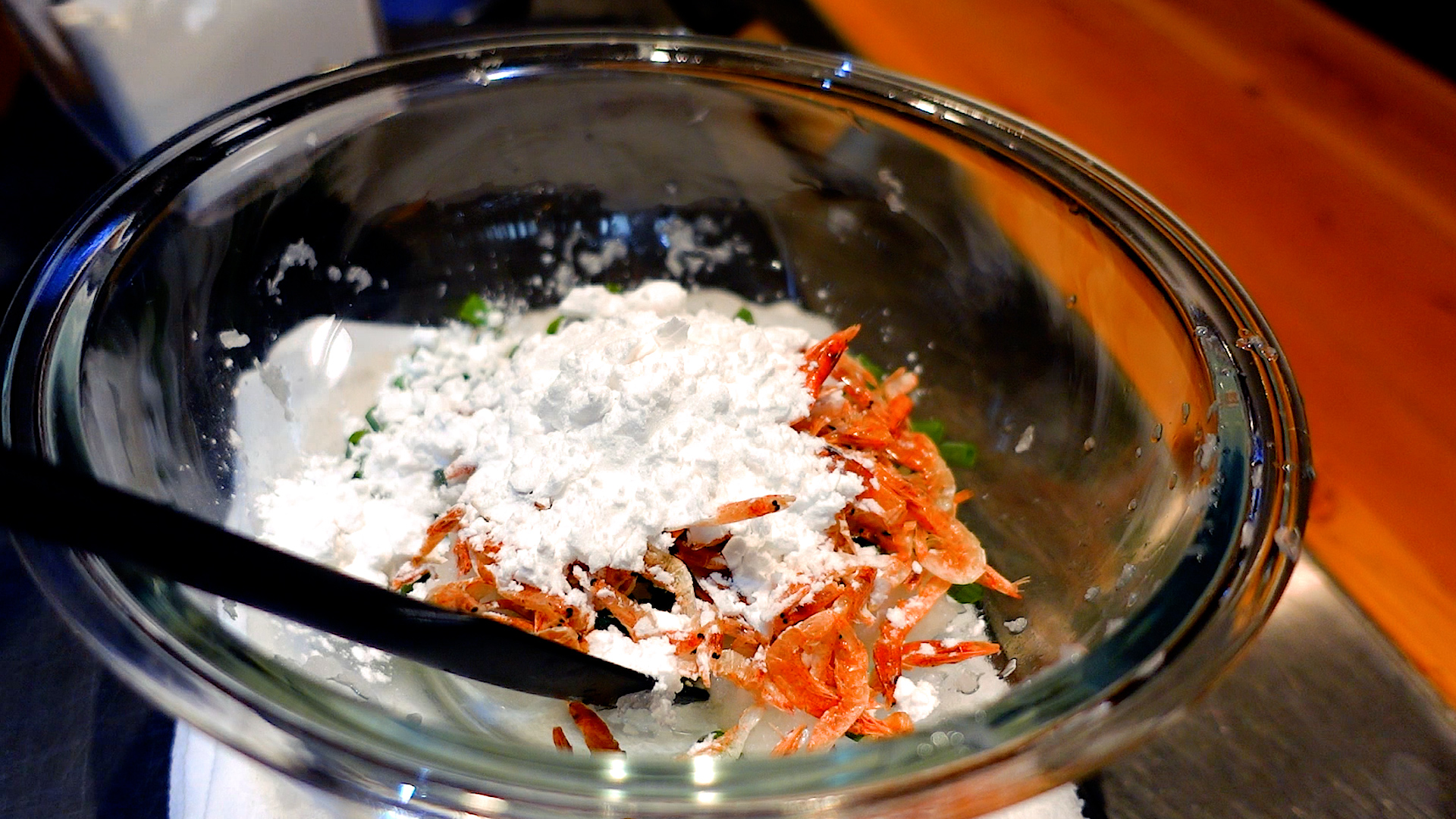 ボウルに大根おろし、青ネギ、干しエビ、◆片栗粉 大さじ3、鶏ガラスープの素 小さじ1/2を加えヘラでよく混ぜ合わせる。