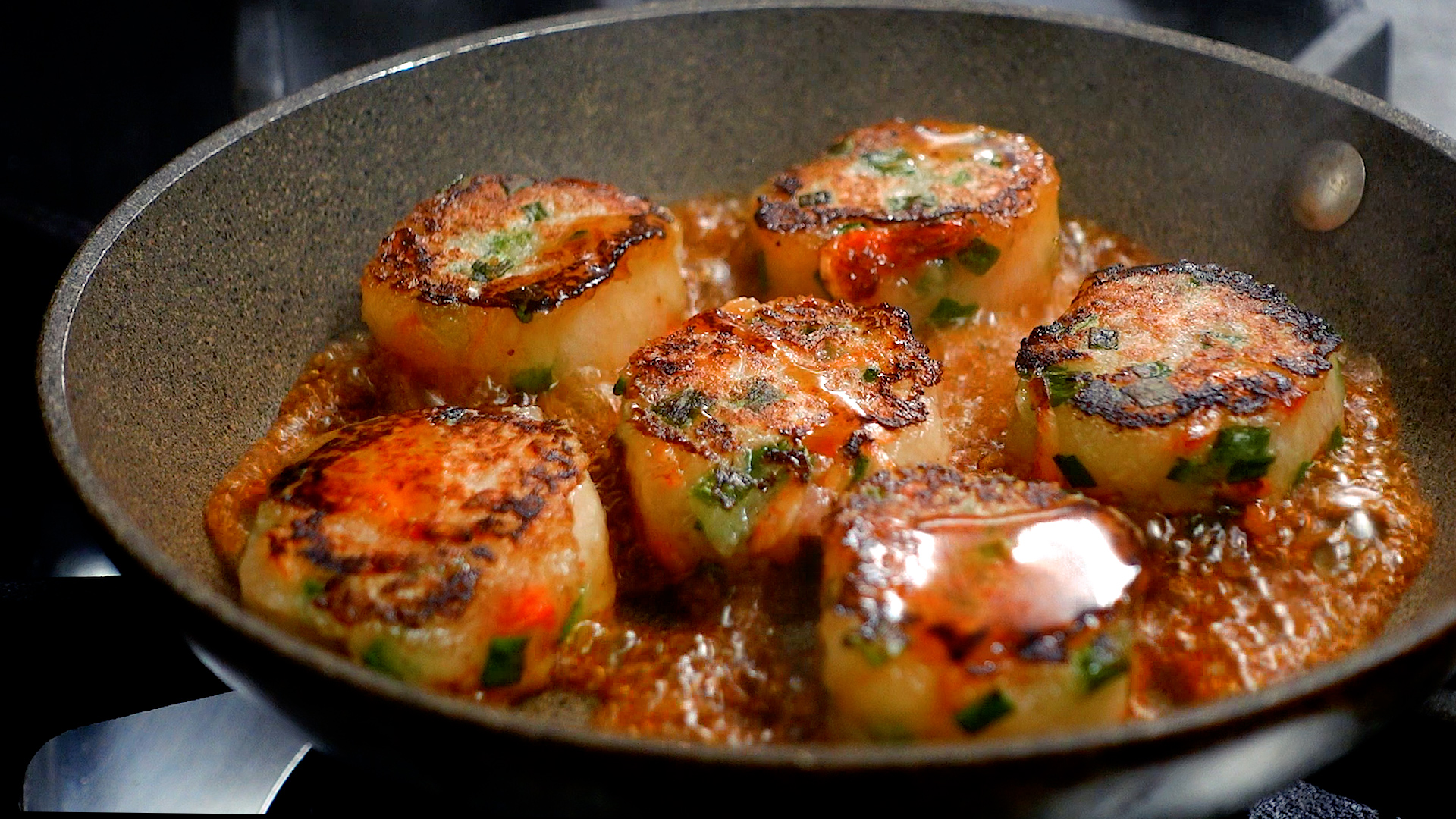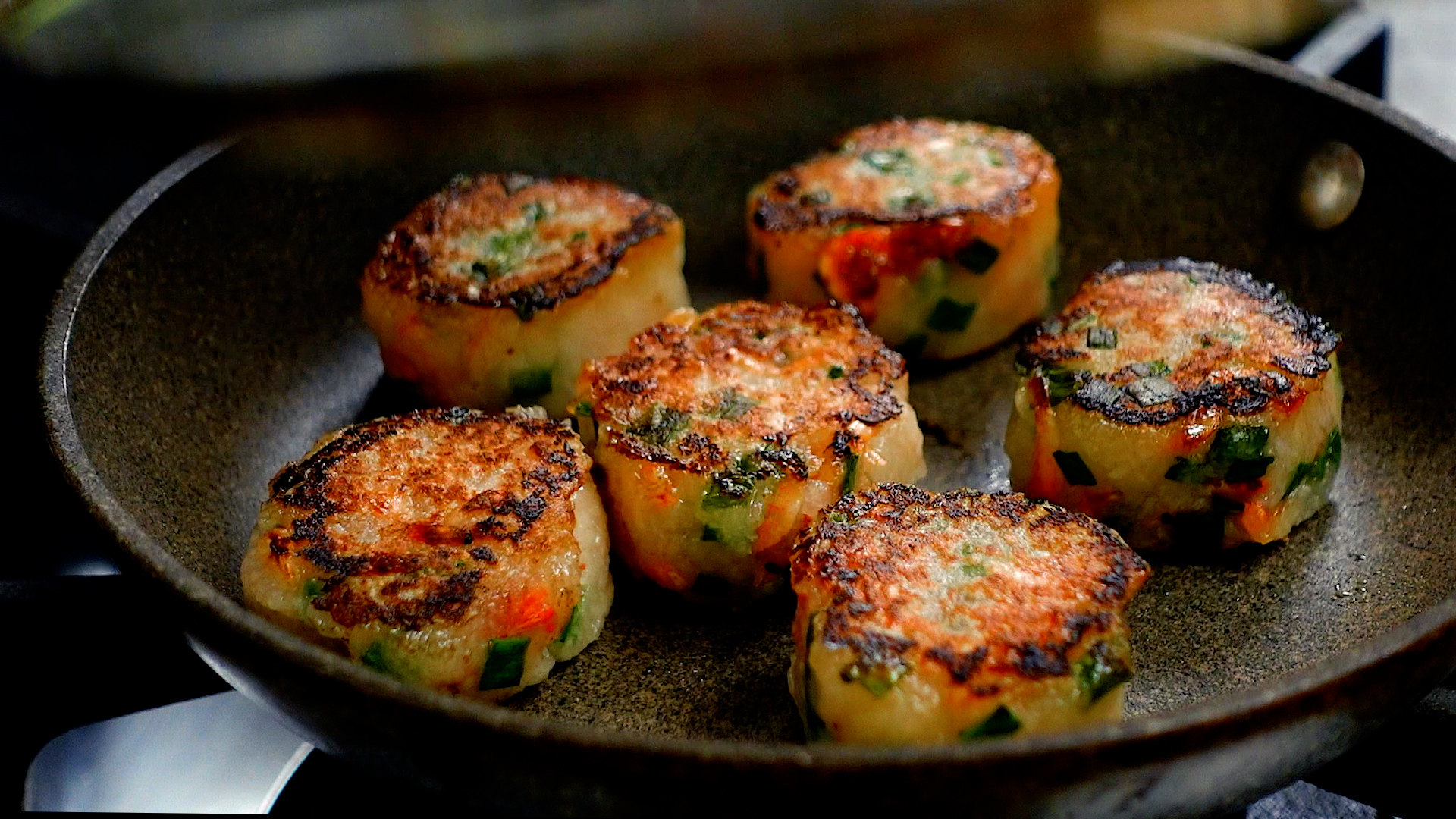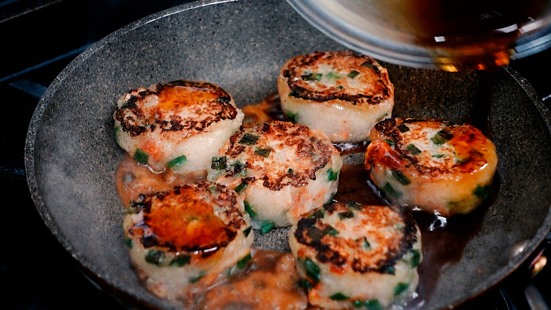 片栗粉を混ぜ合わせ、フライパンでこんがり焼きタレを絡めれば、もちもち食感がクセになる大根餅の完成!