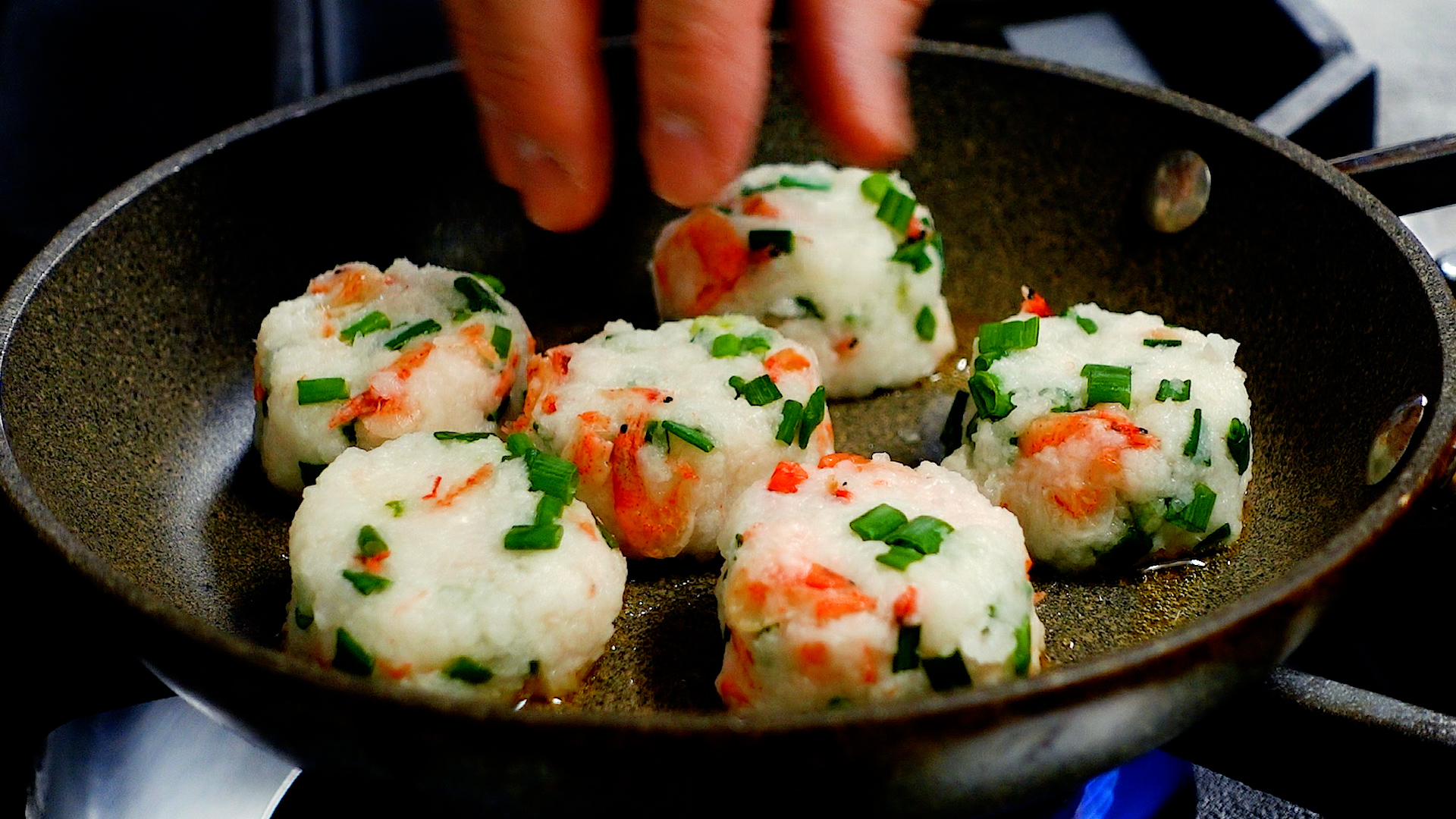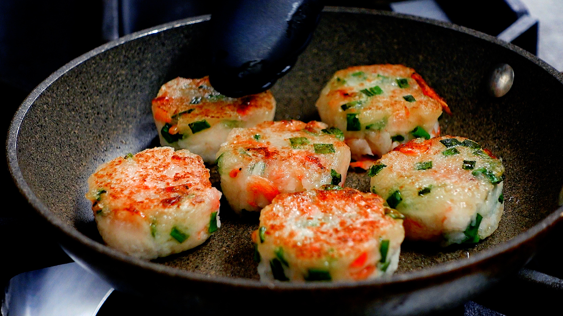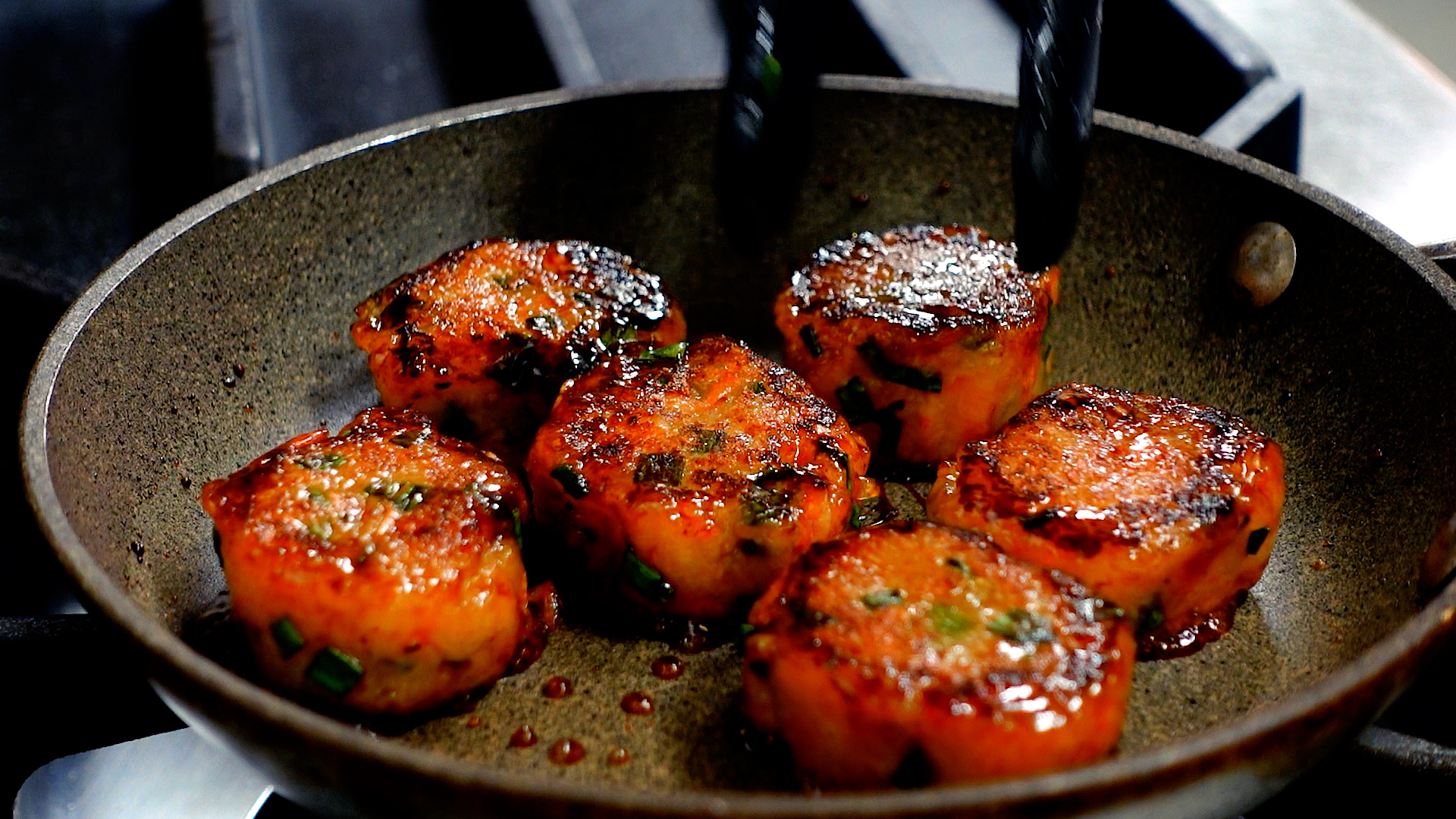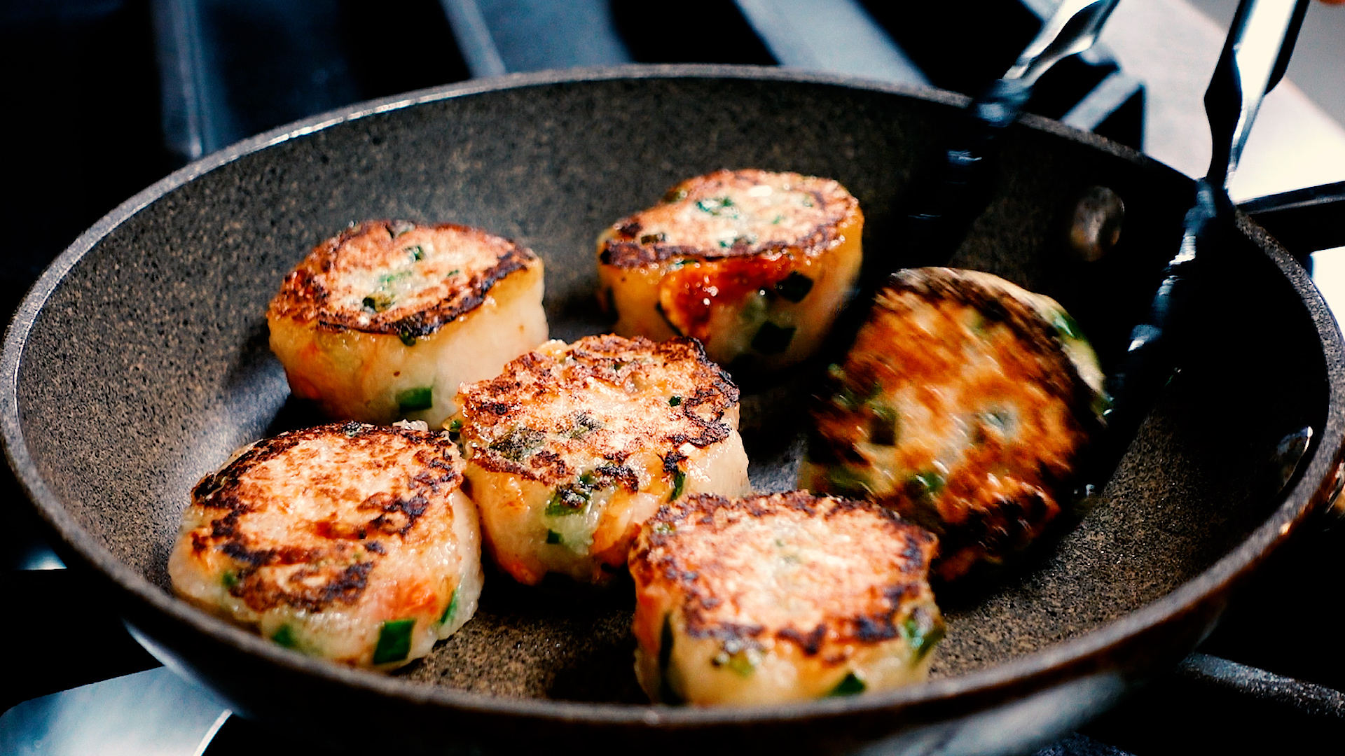 片栗粉を混ぜ合わせ、フライパンでこんがり焼きタレを絡めれば、もちもち食感がクセになる大根餅の完成!