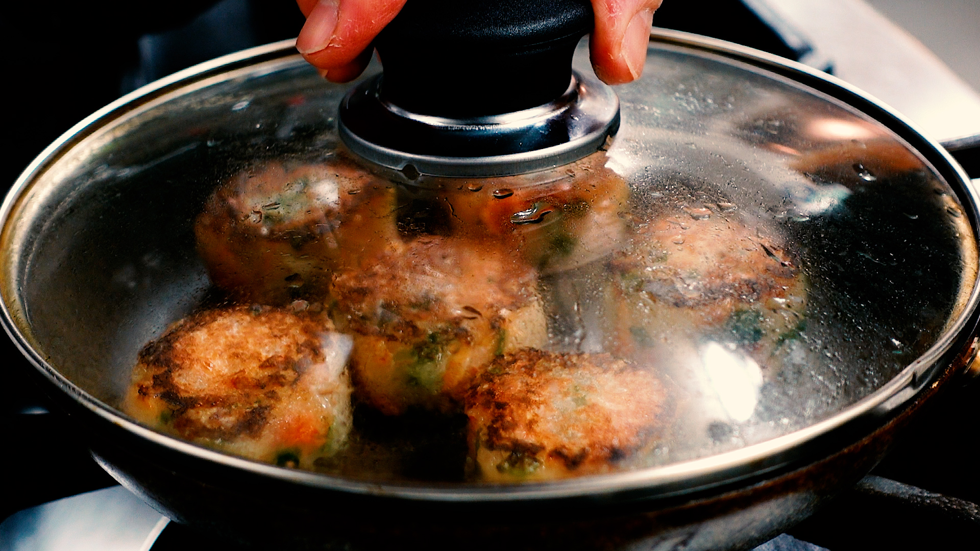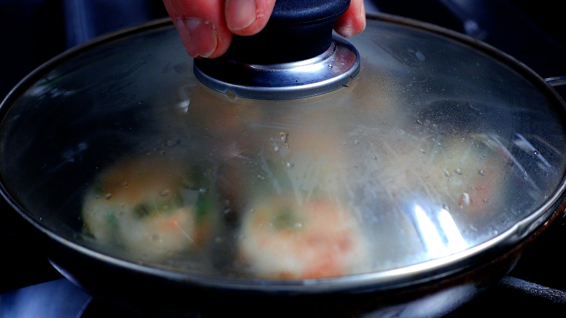 焼き目がついたら料理酒を加え、蓋をして3分蒸し焼きにする(途中、一度ひっくり返す)。