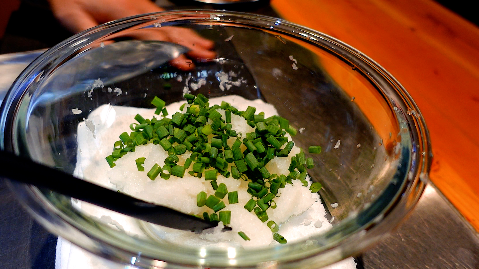 大根をすりおろして、干しエビと青ネギを加えてアクセントに。