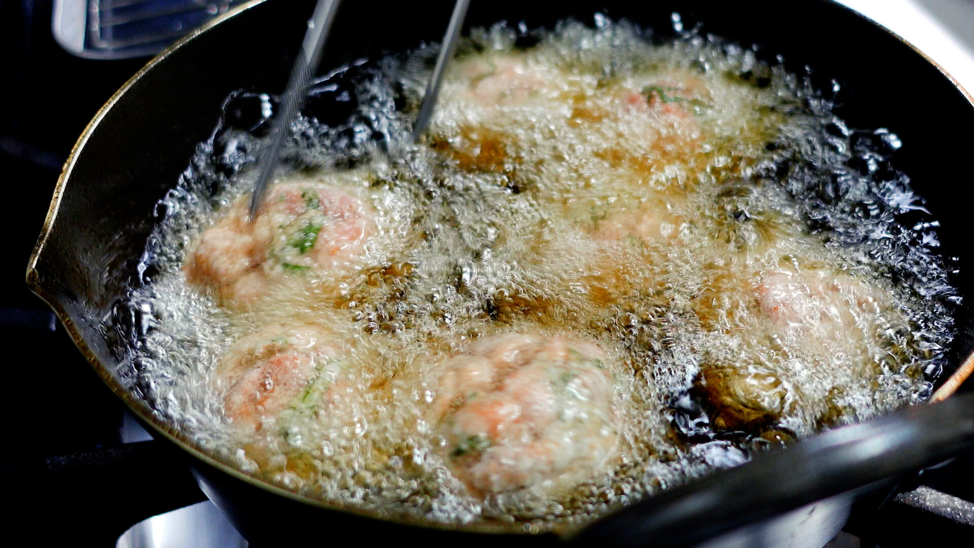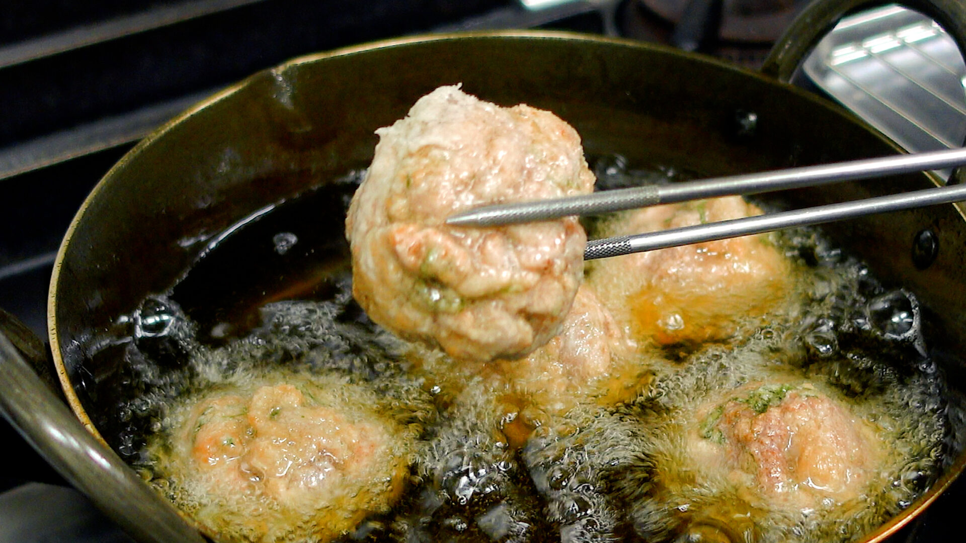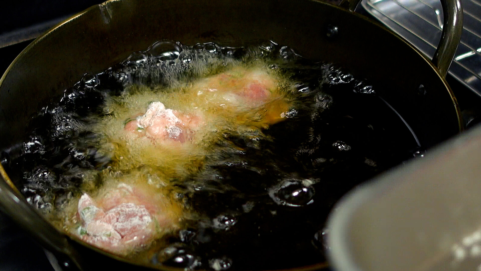 170℃の揚げ油で2度揚げをする。まずは3分、上下を入れ替えながら揚げる。3分後とりだし、3分休ませる。