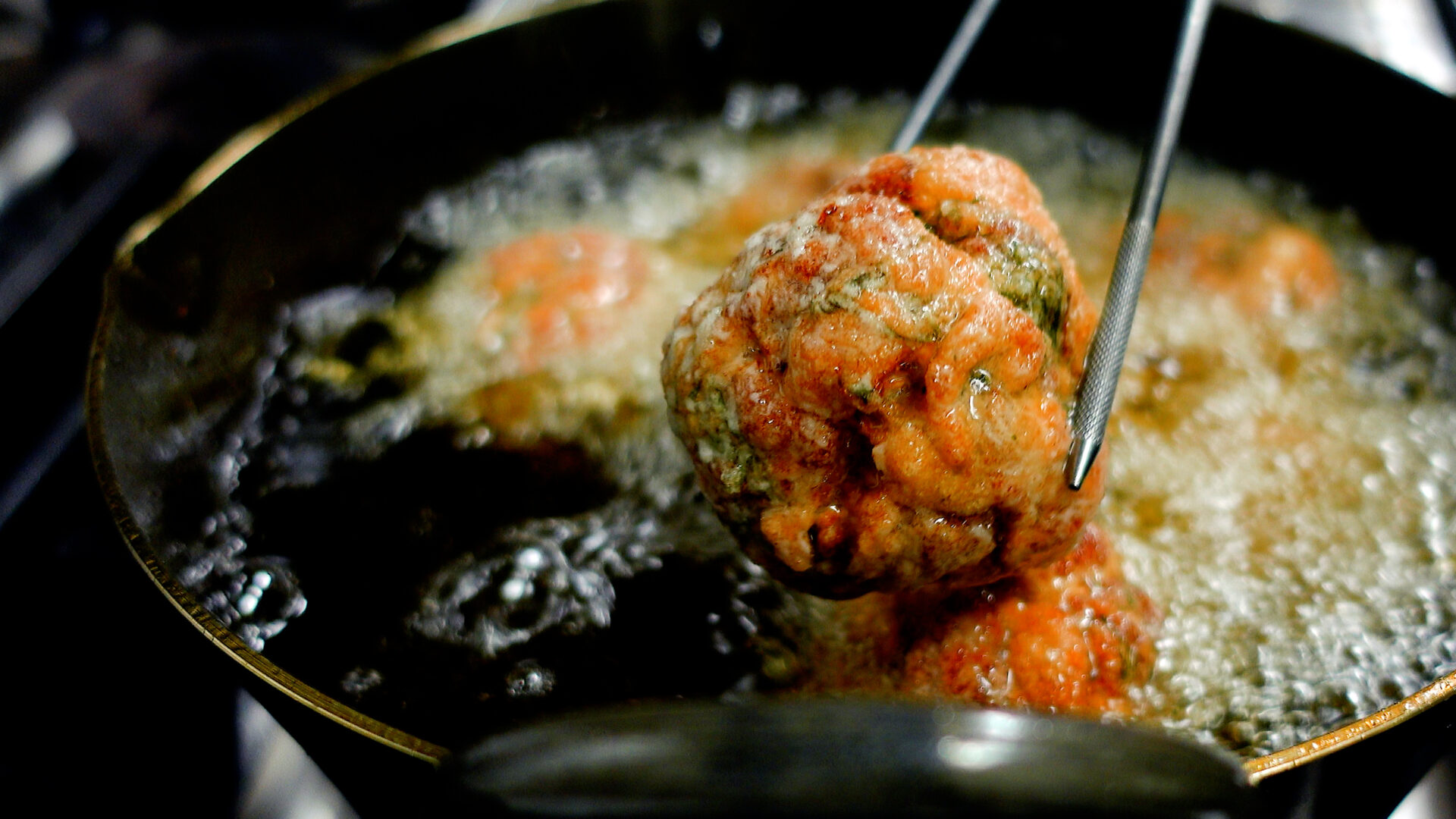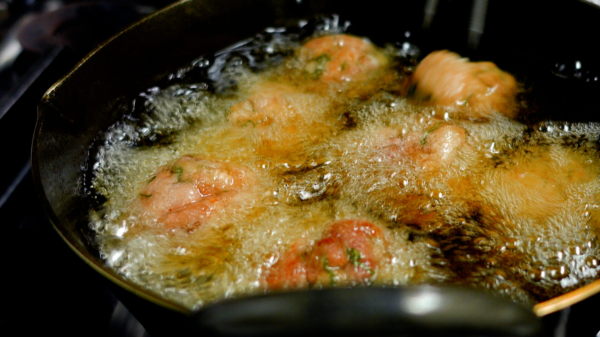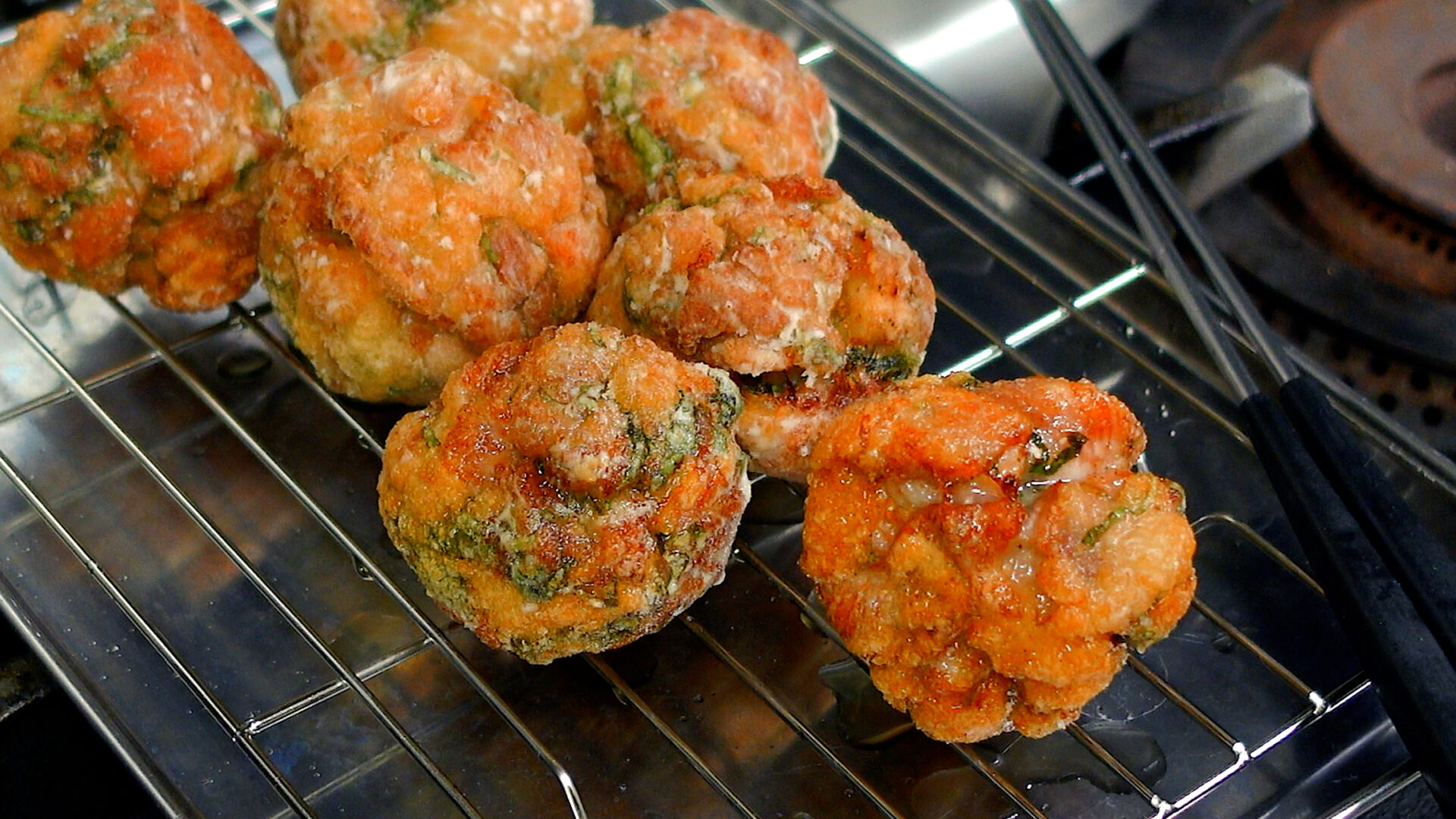 170℃の揚げ油で2度揚げをする。まずは3分、上下を入れ替えながら揚げる。3分後とりだし、3分休ませる。