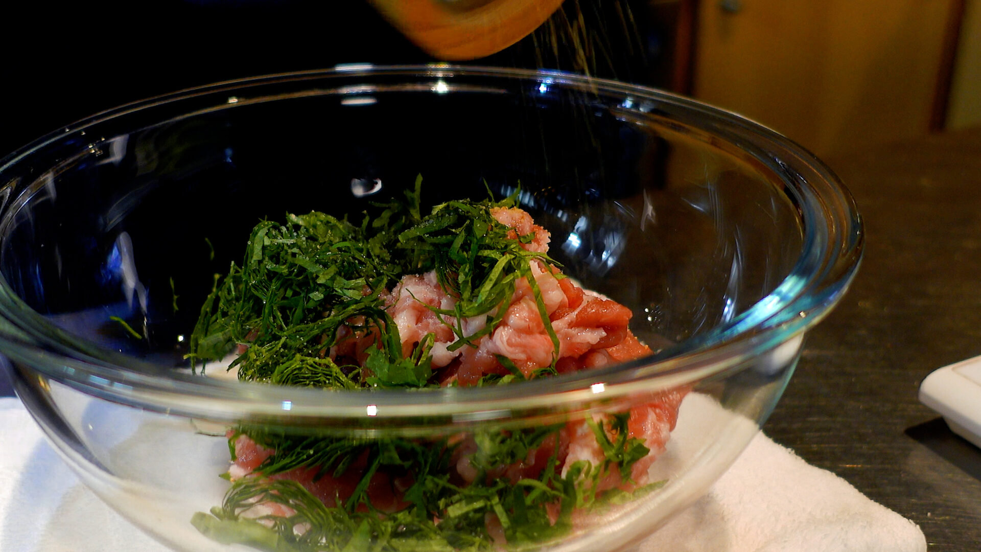 ボウルに豚肉、大葉、◆塩 1つまみ、こしょう 少々、めんつゆ 大さじ1、料理酒 大さじ1、おろしにんにく・生姜 各小さじ1/2、薄力粉 大さじ1、片栗粉 大さじ2を加え、手でしっかりと練り上げる。