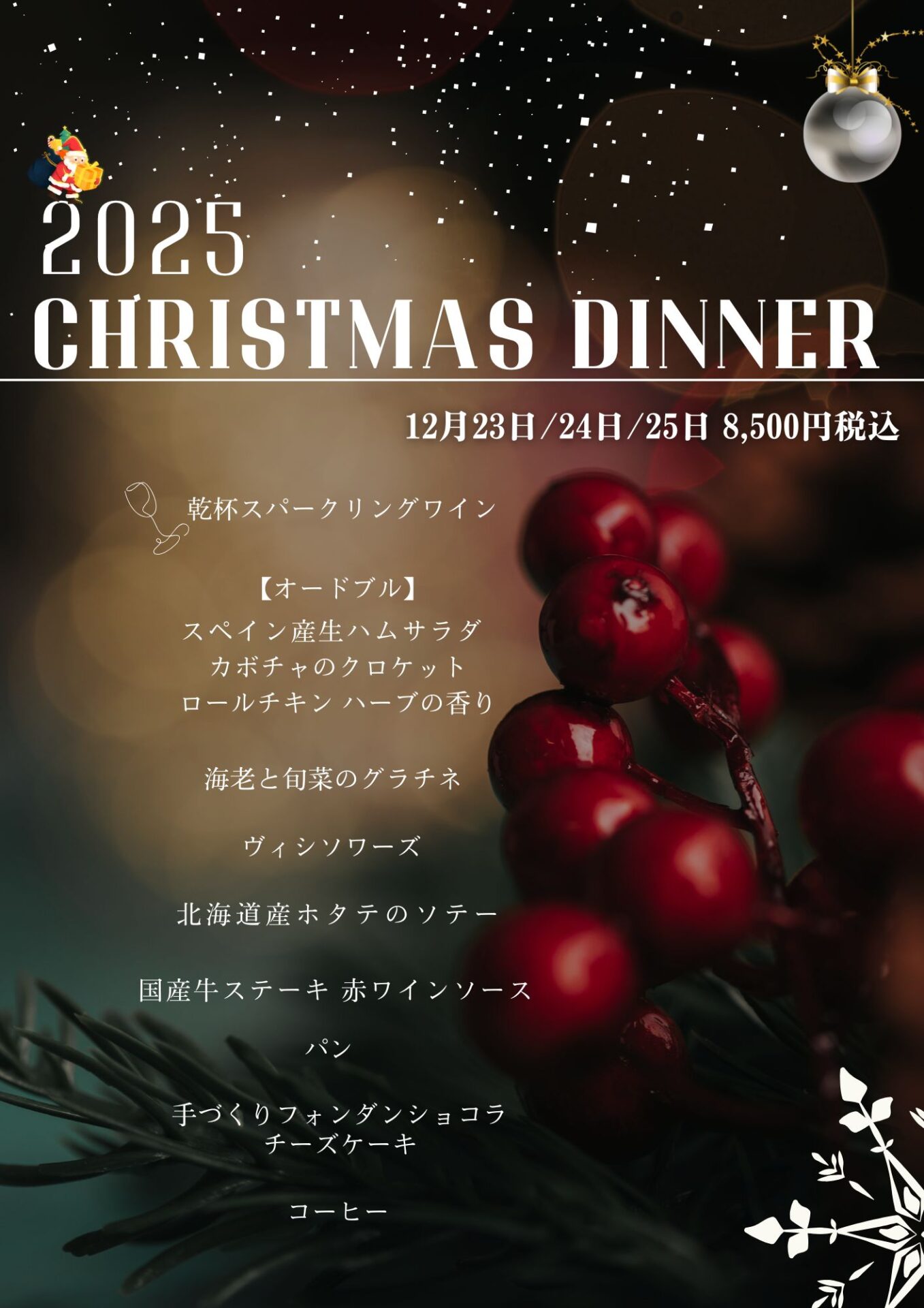 カジュアルなクリスマスディナーをご用意しております。特別な日を大切な人とごゆっくりお過ごしください。