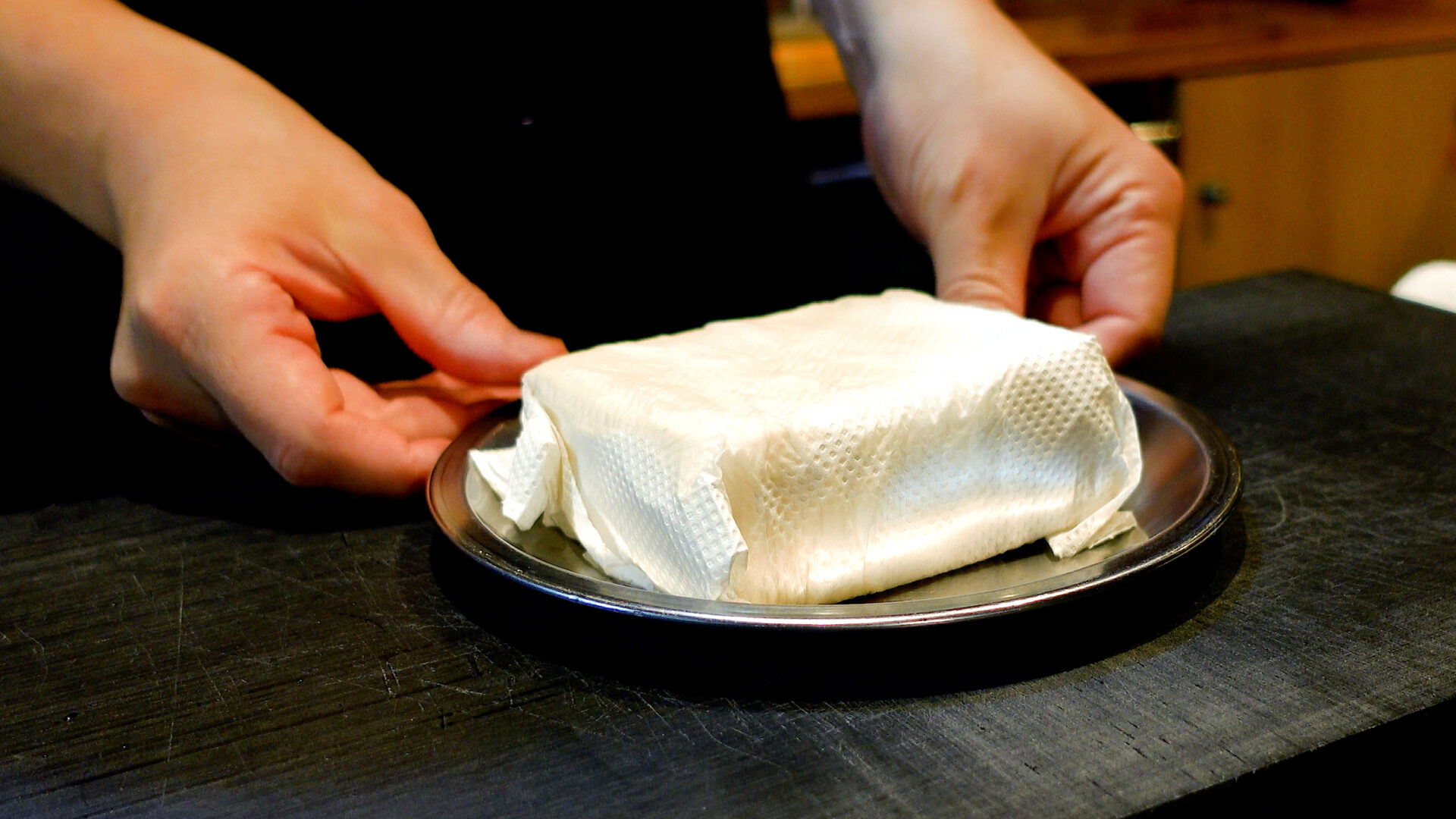 木綿豆腐はペーパーで包み、水切りをしておく。