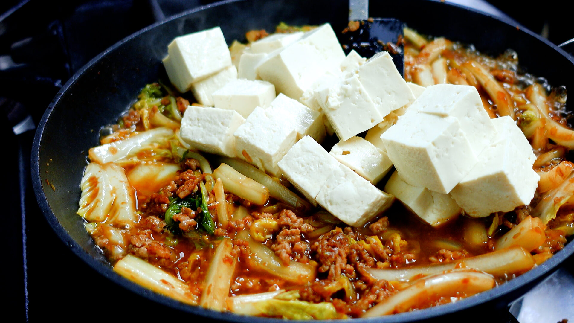豆腐を加えサッと混ぜ、ひと煮立ちしたら弱火にし約3分煮込む(途中かるく混ぜる)。