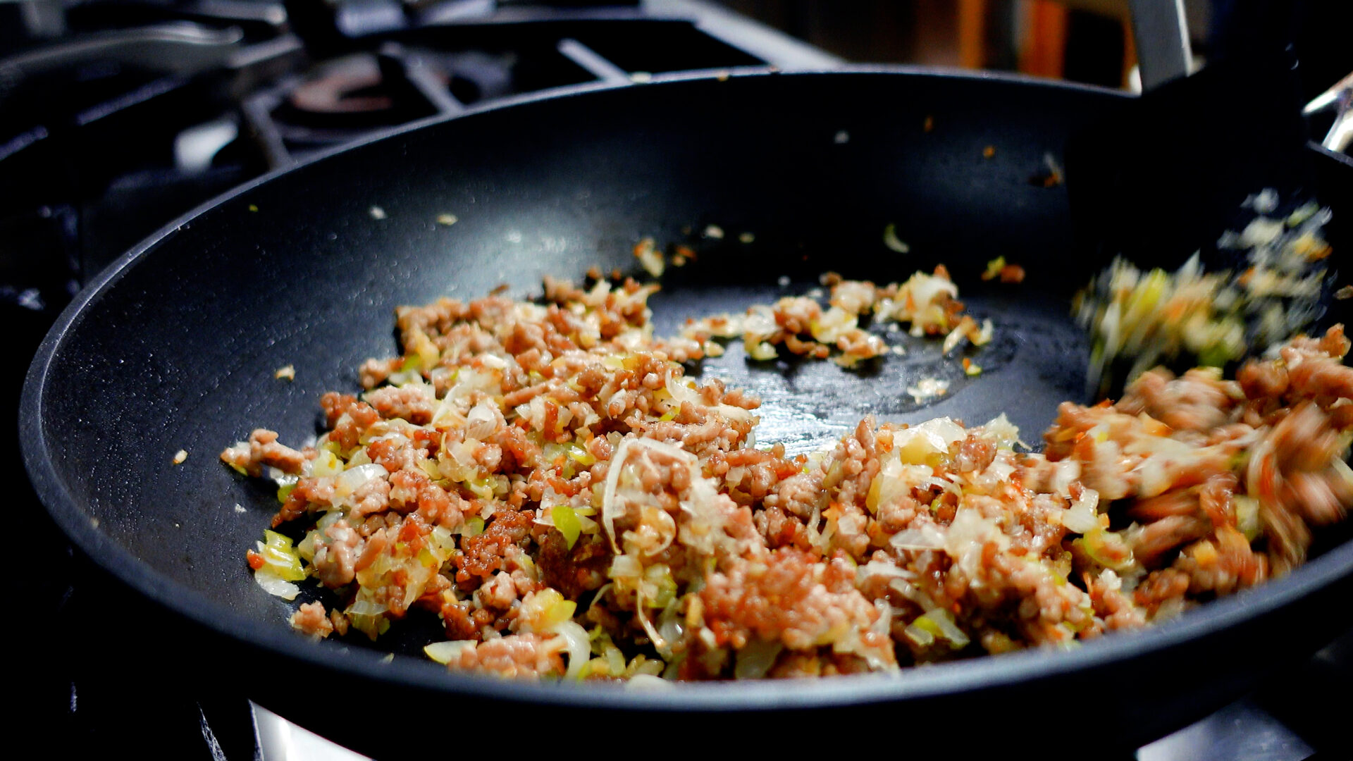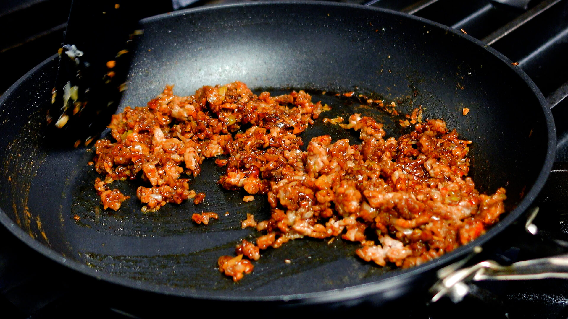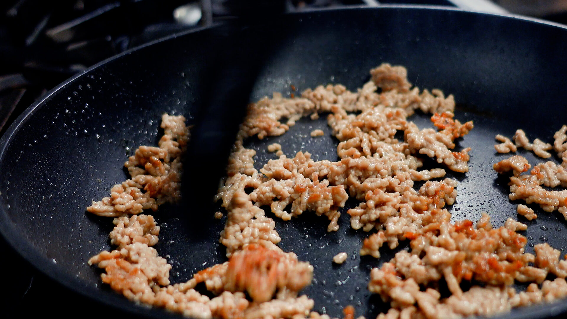 豚ひき肉はじっくり炒めて臭みを消し、うま味を引き出します。