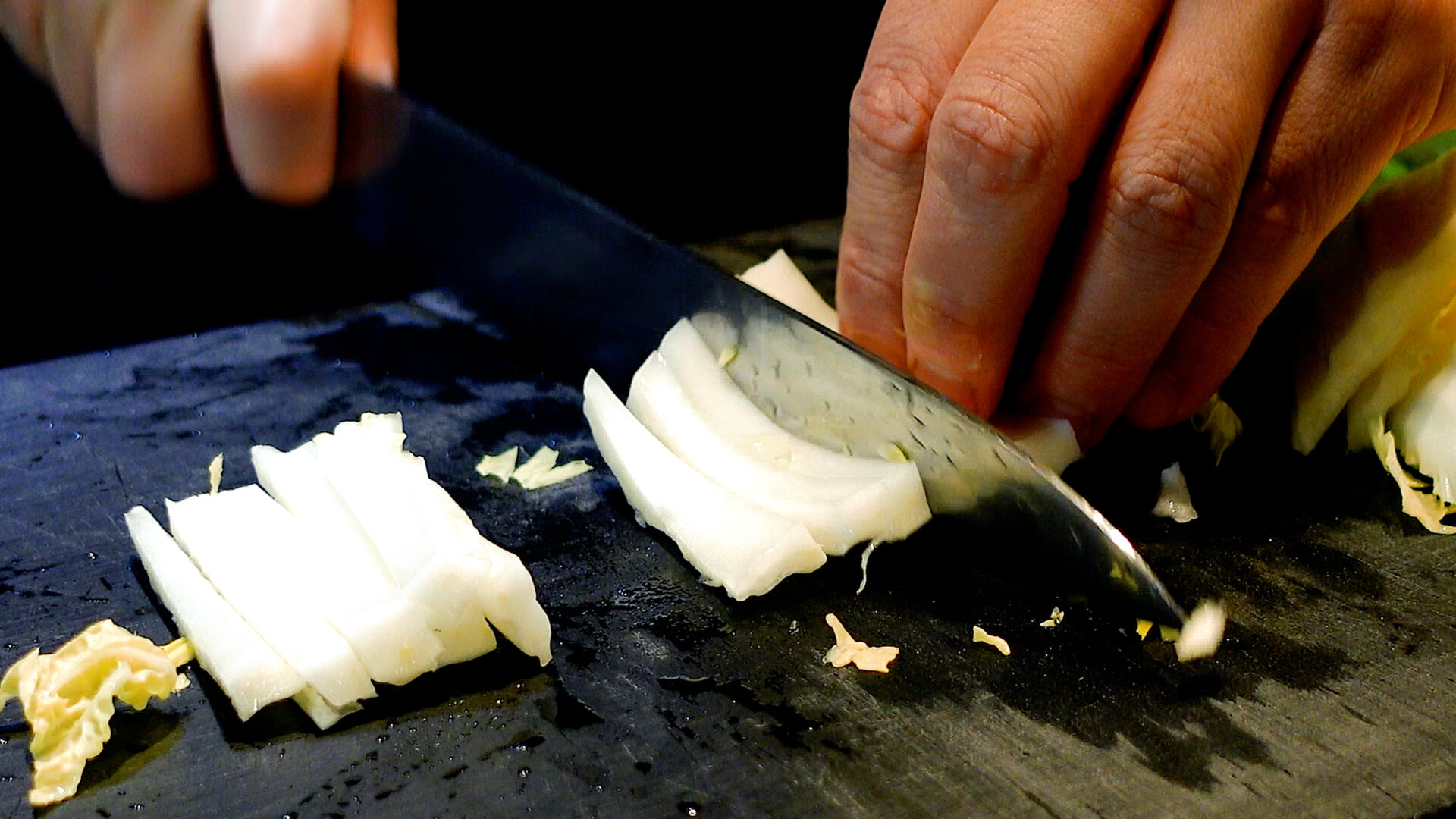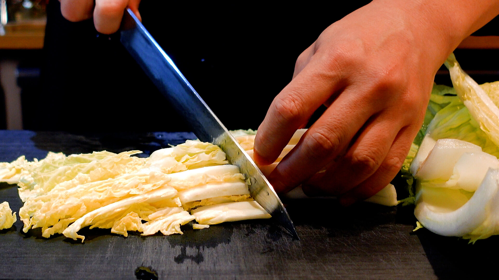 白菜は洗い、葉の部分はざく切り、芯の部分は細切りにする。