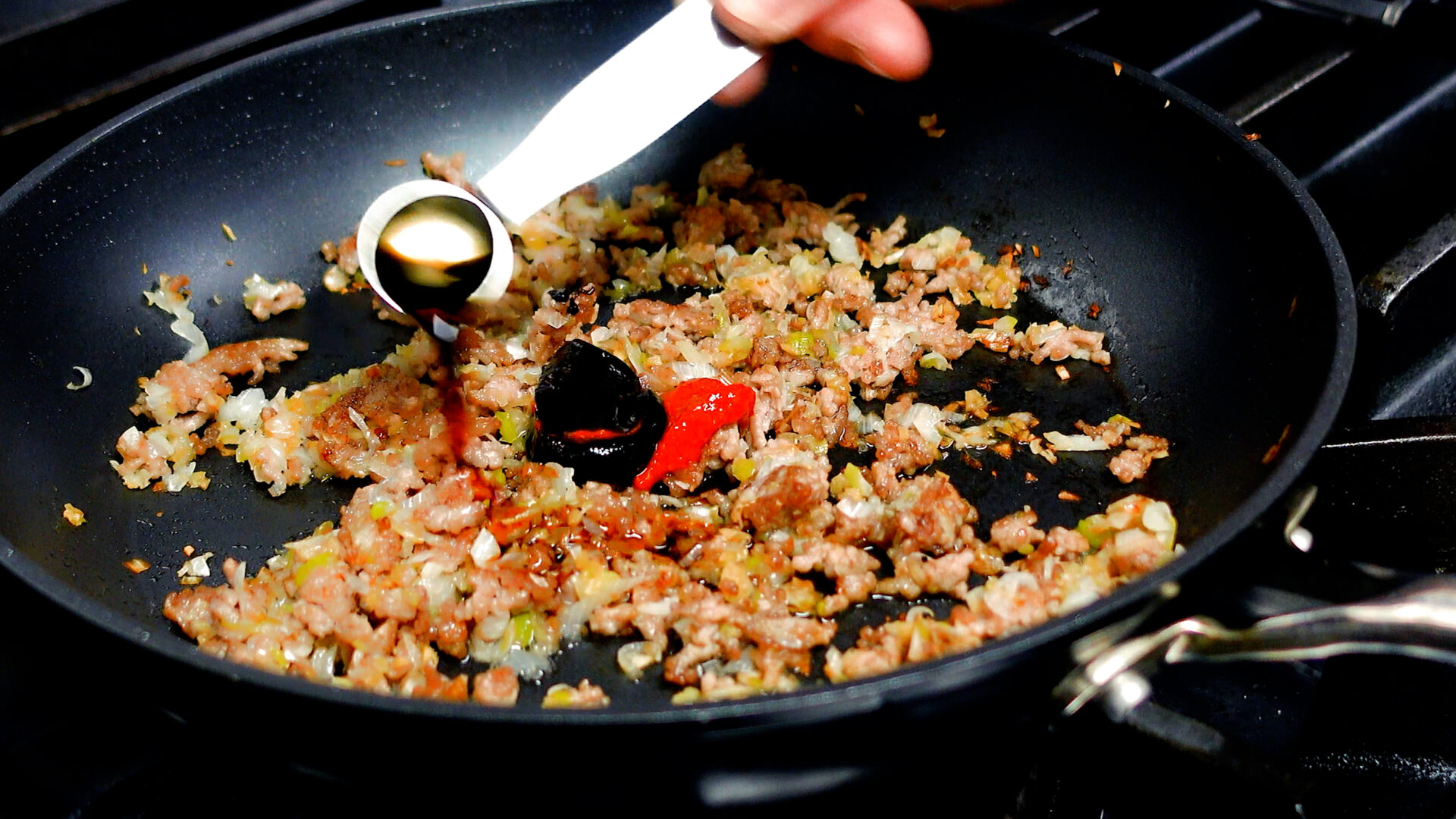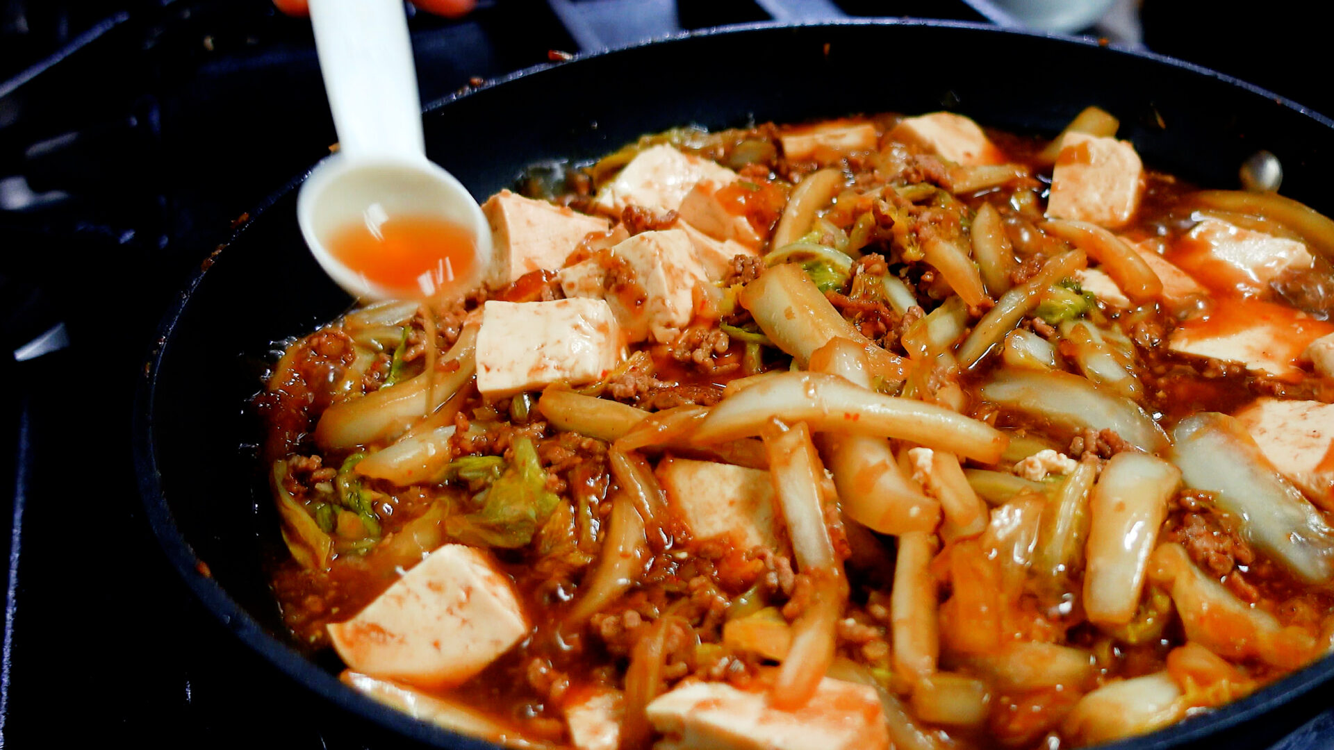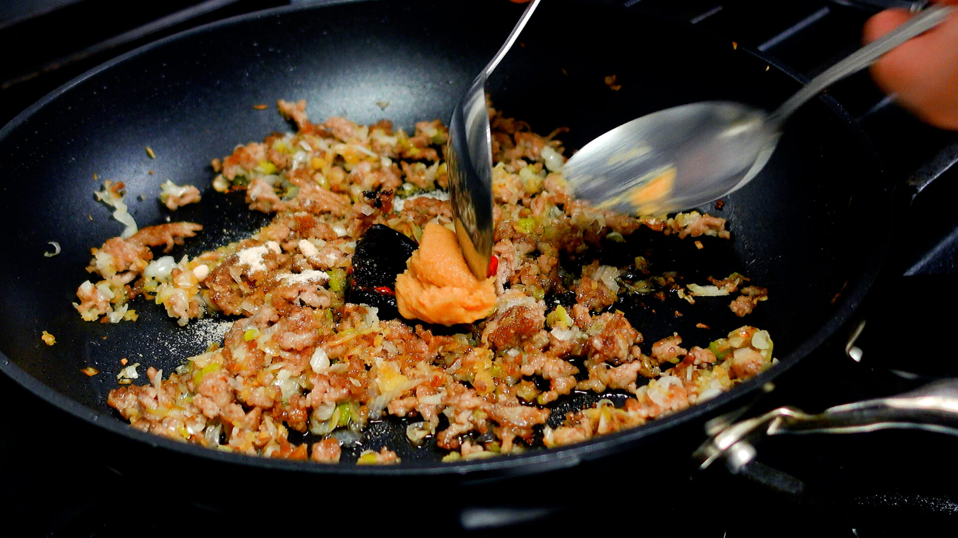◆豆板醤 小さじ1~2、甜麺醤・酒 各大さじ1、醤油・砂糖・合わせみそ 各小さじ1を加え中火にかけ、調味料と具材をしっかりと炒め合わせる。