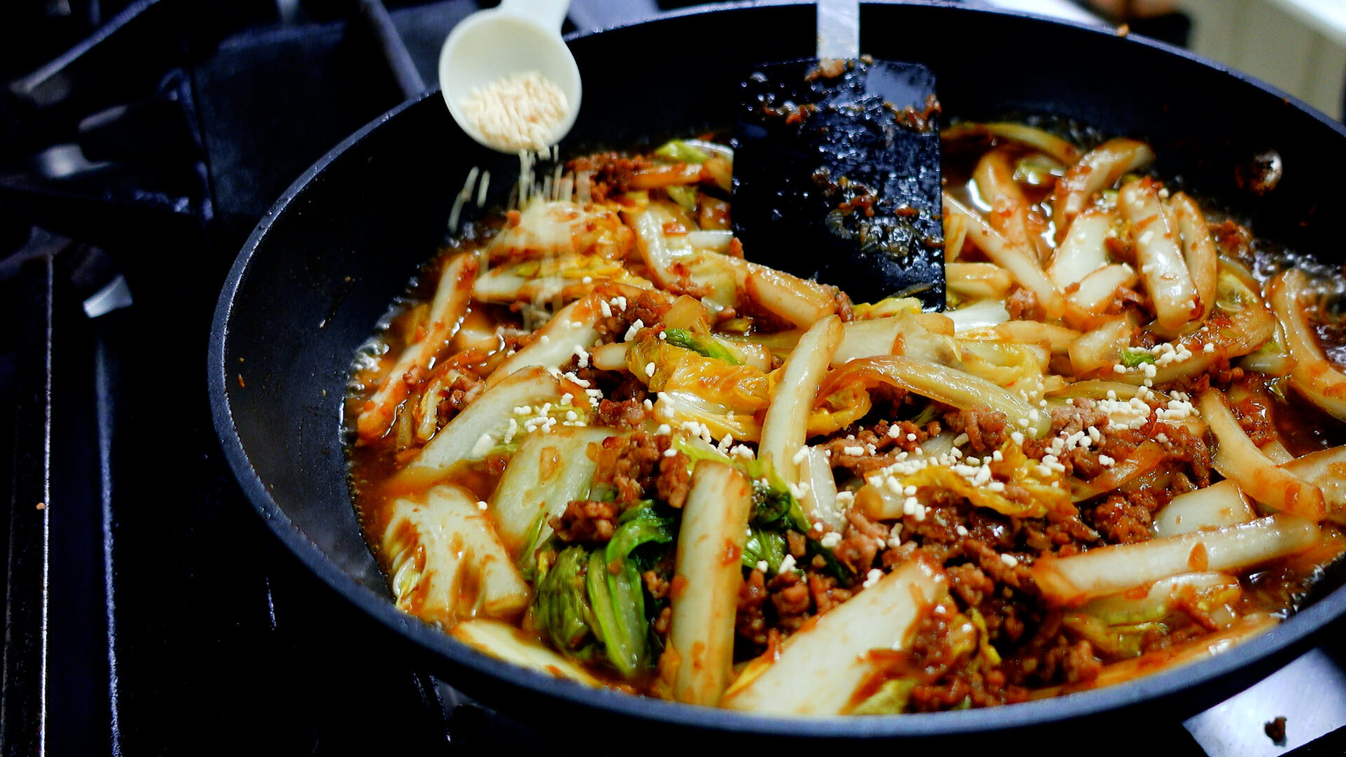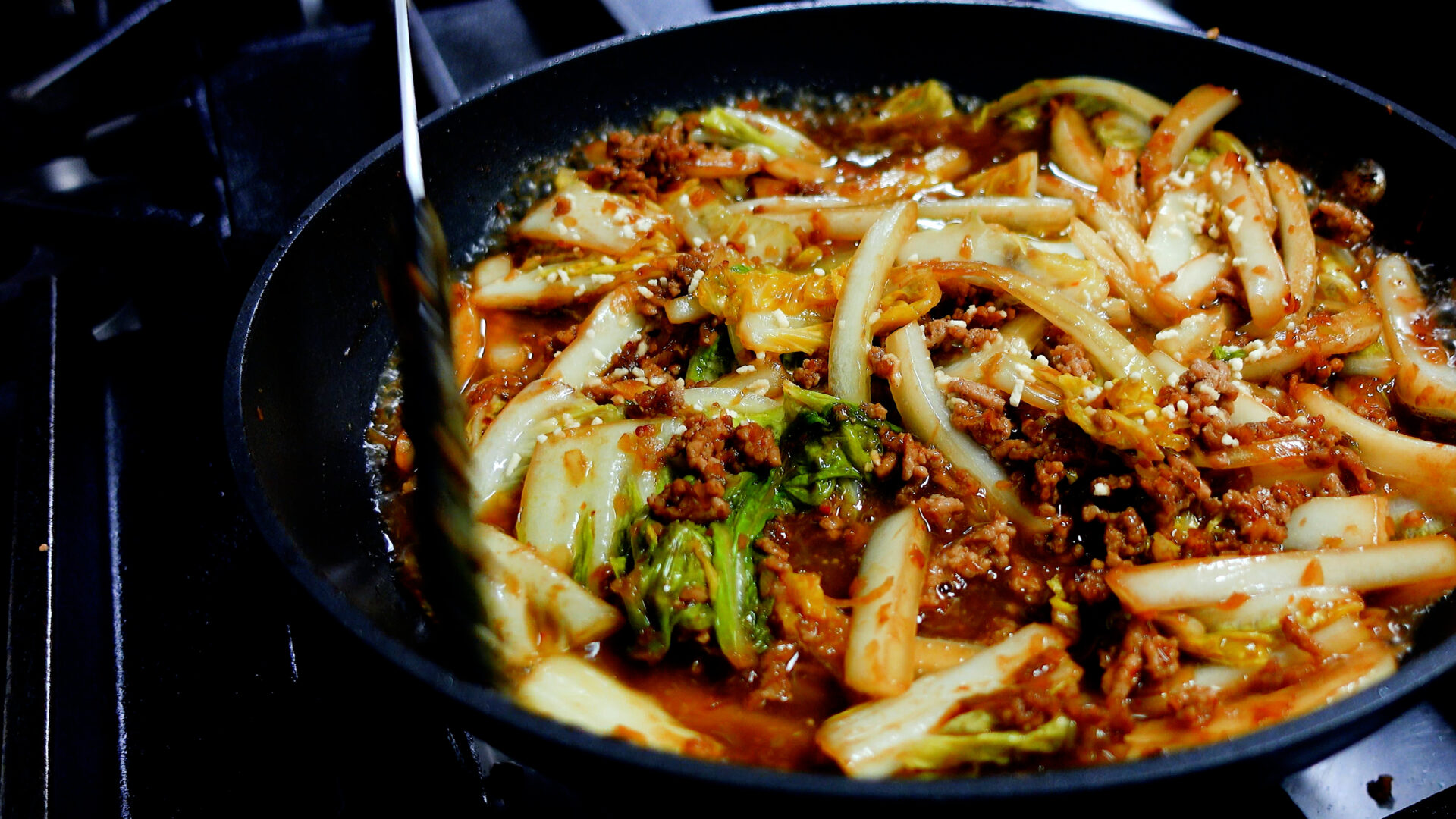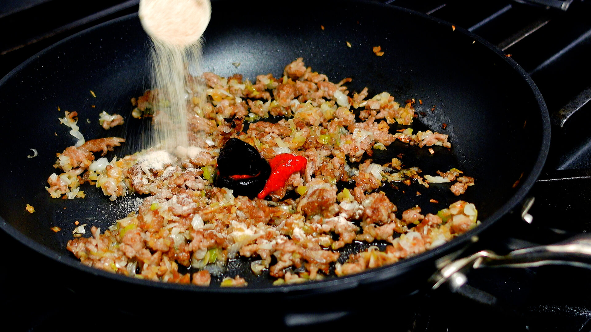 ◆豆板醤 小さじ1~2、甜麺醤・酒 各大さじ1、醤油・砂糖・合わせみそ 各小さじ1を加え中火にかけ、調味料と具材をしっかりと炒め合わせる。