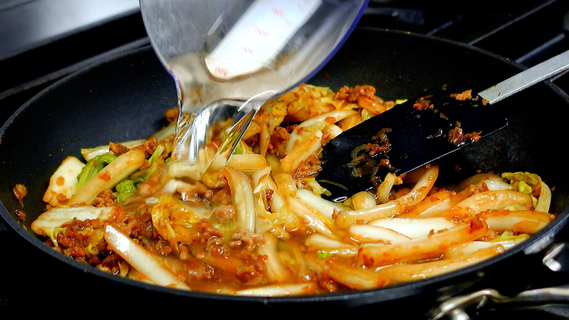 白菜がしんなりしてきたら◇水 200ml、鶏ガラスープの素 小さじ1を加え混ぜ合わせる。