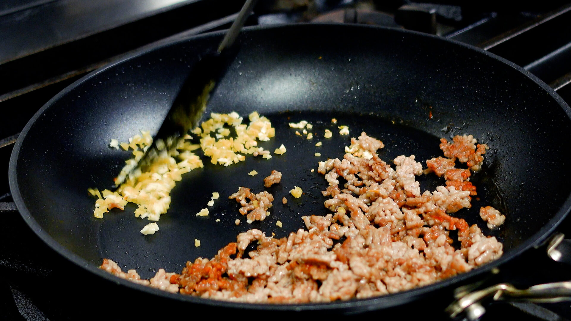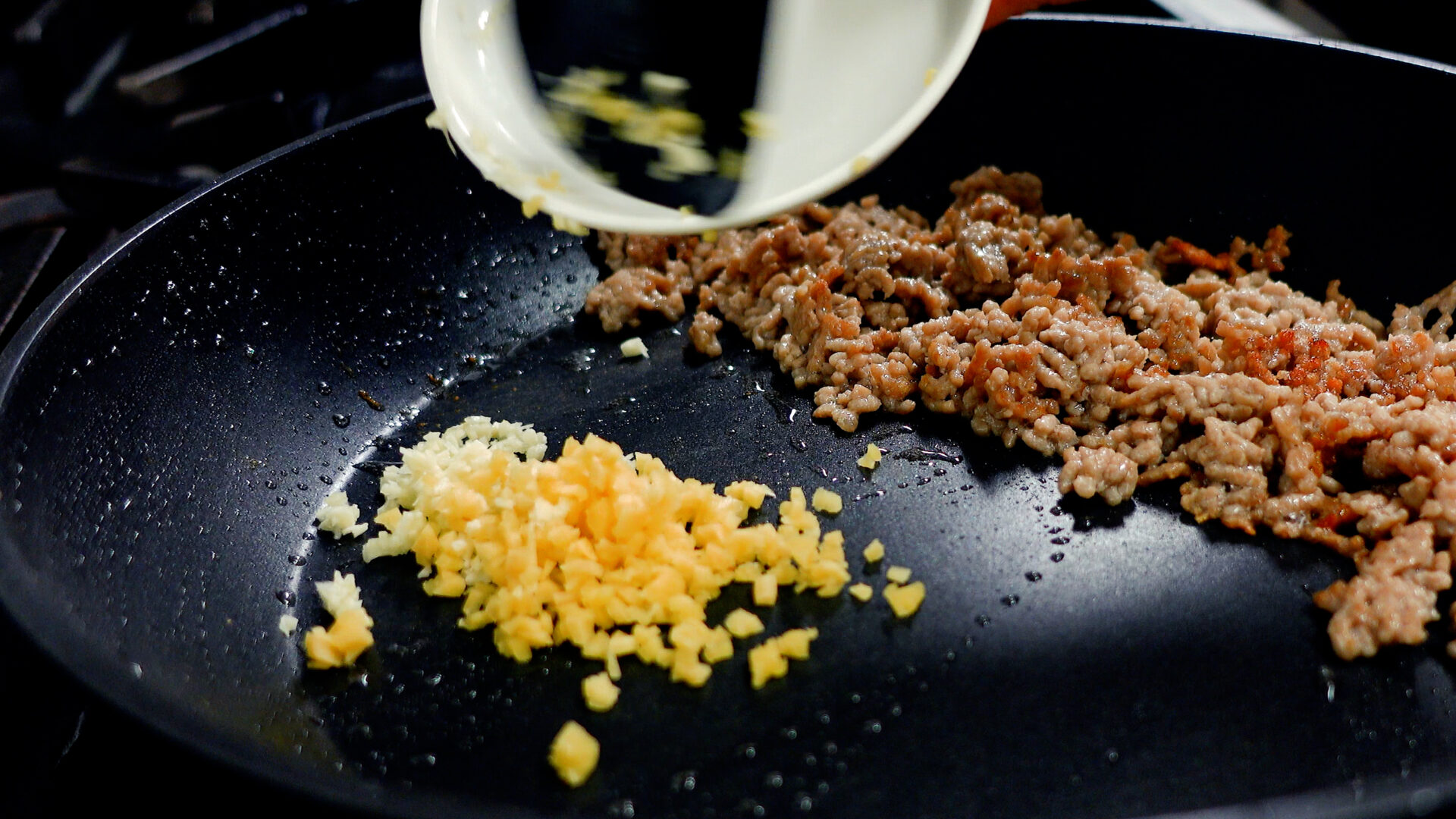 フライパンにスペースをあけ、にんにく、しょうがを加え炒める。香りが出たらひき肉と合わせ炒める。