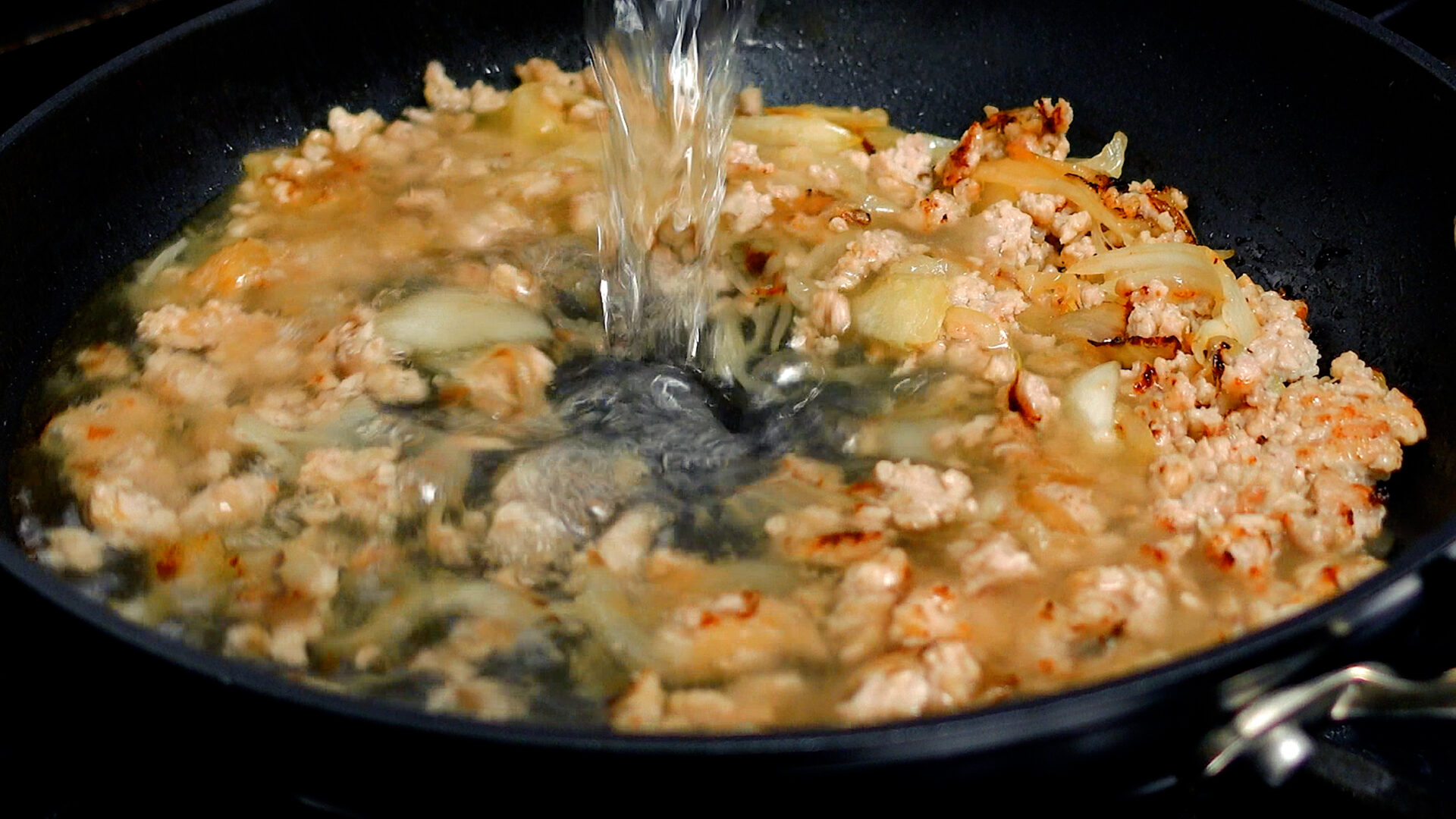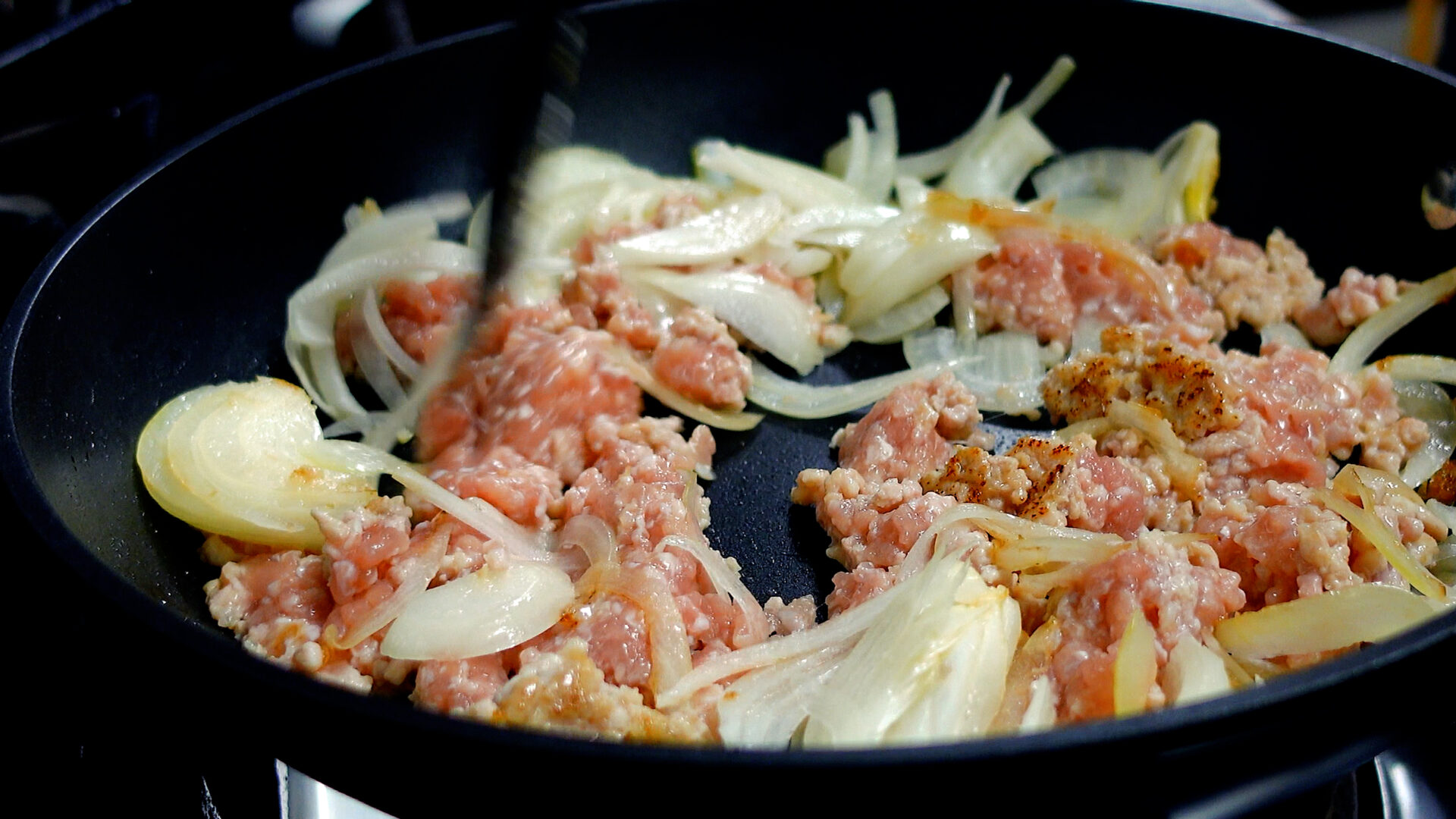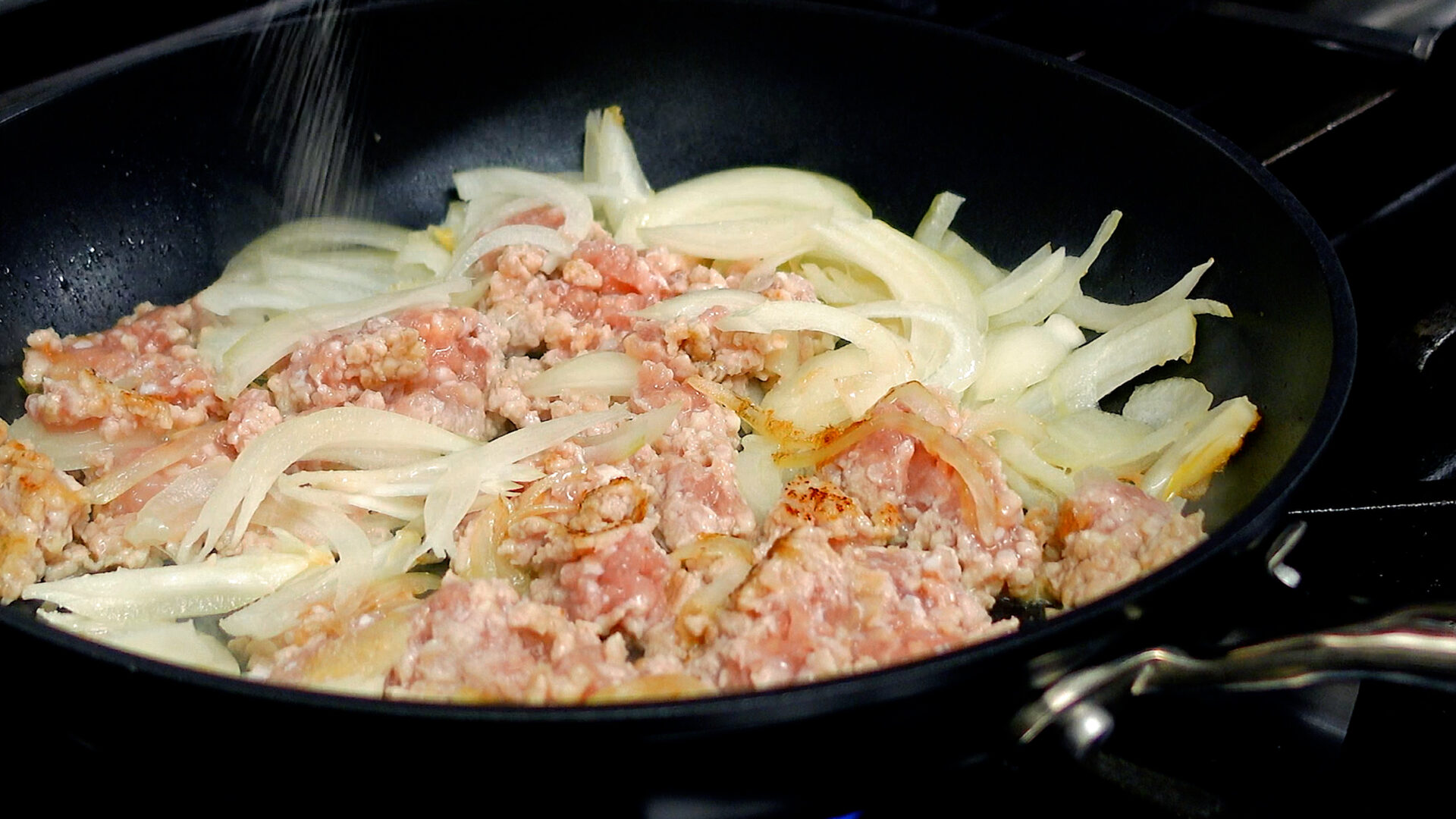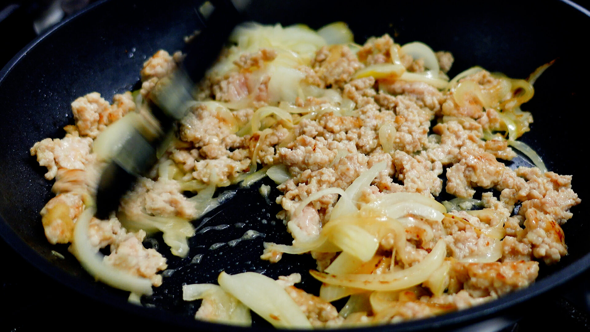 玉ねぎ、鶏ももひき肉を加え、ほぐすように炒める。途中塩をし、さらに炒める。