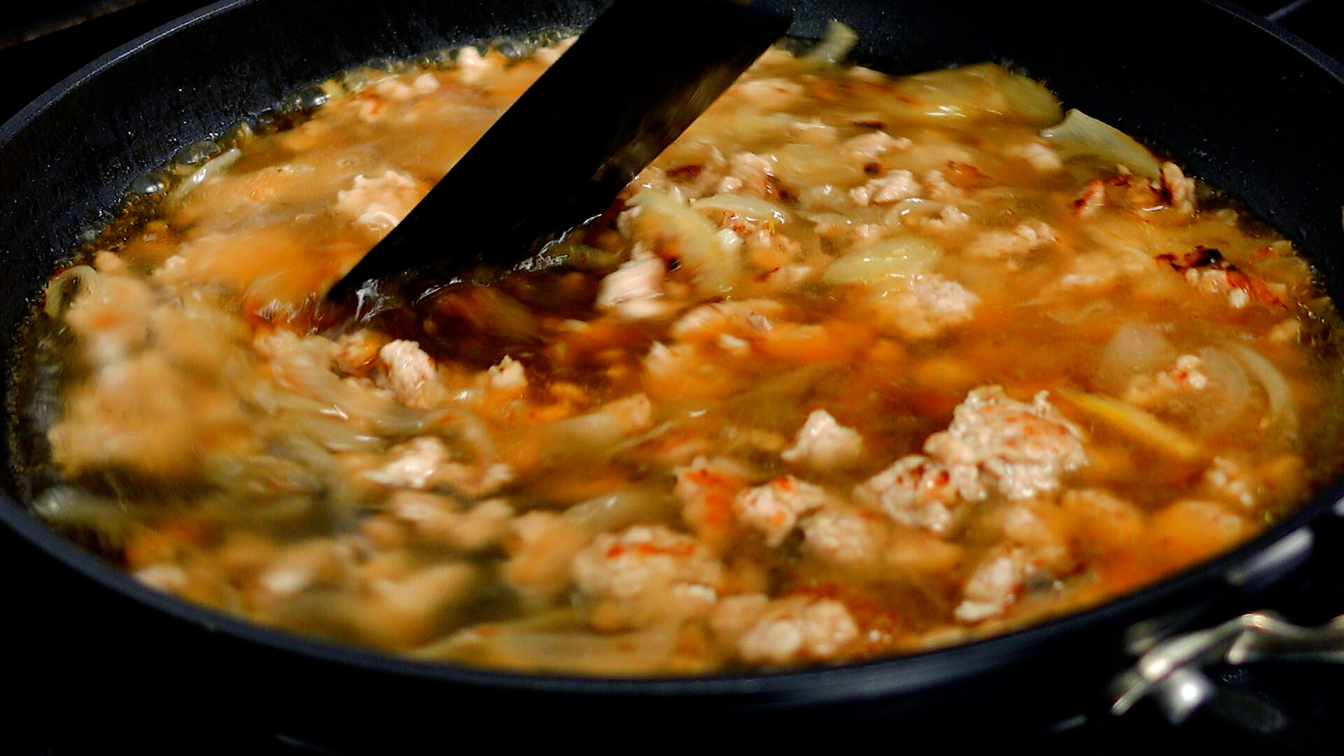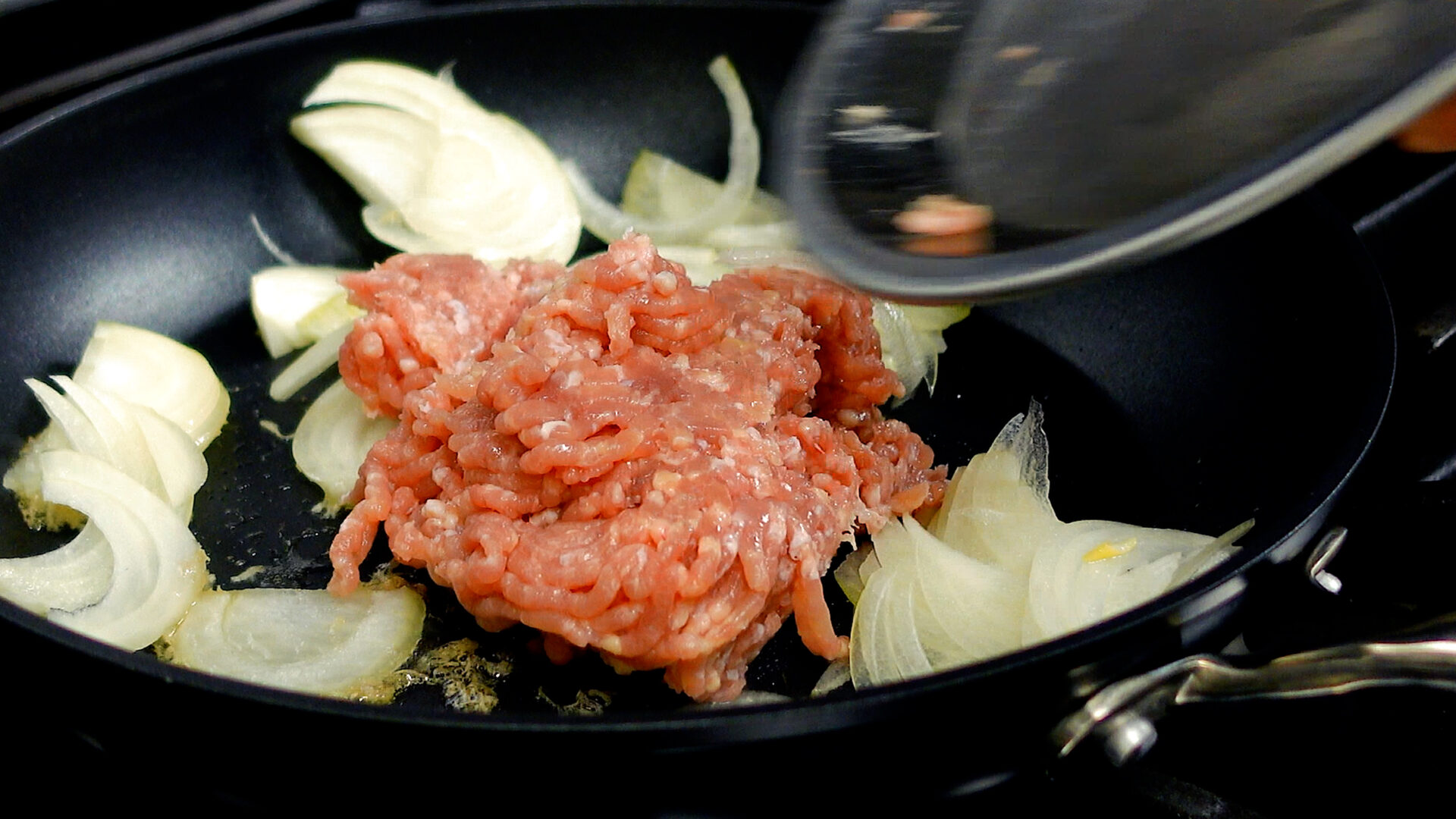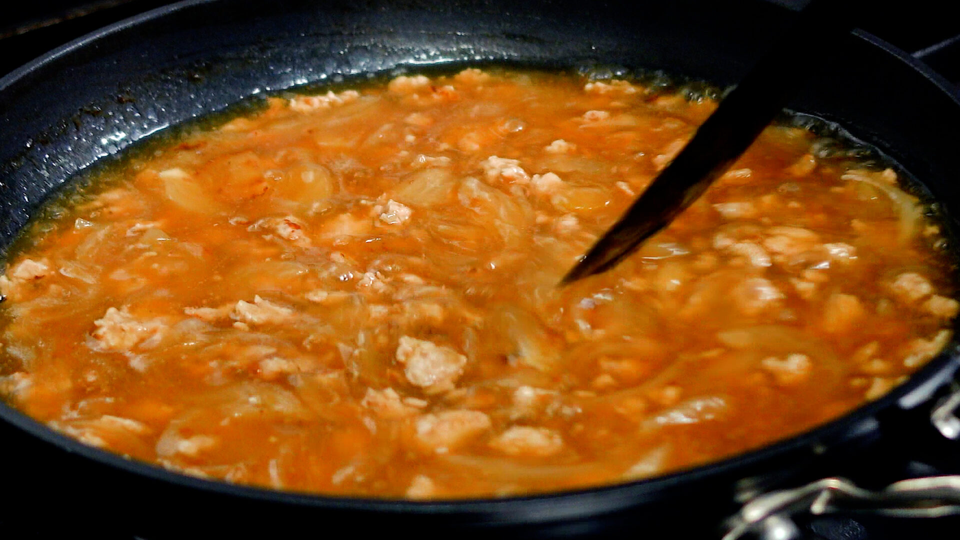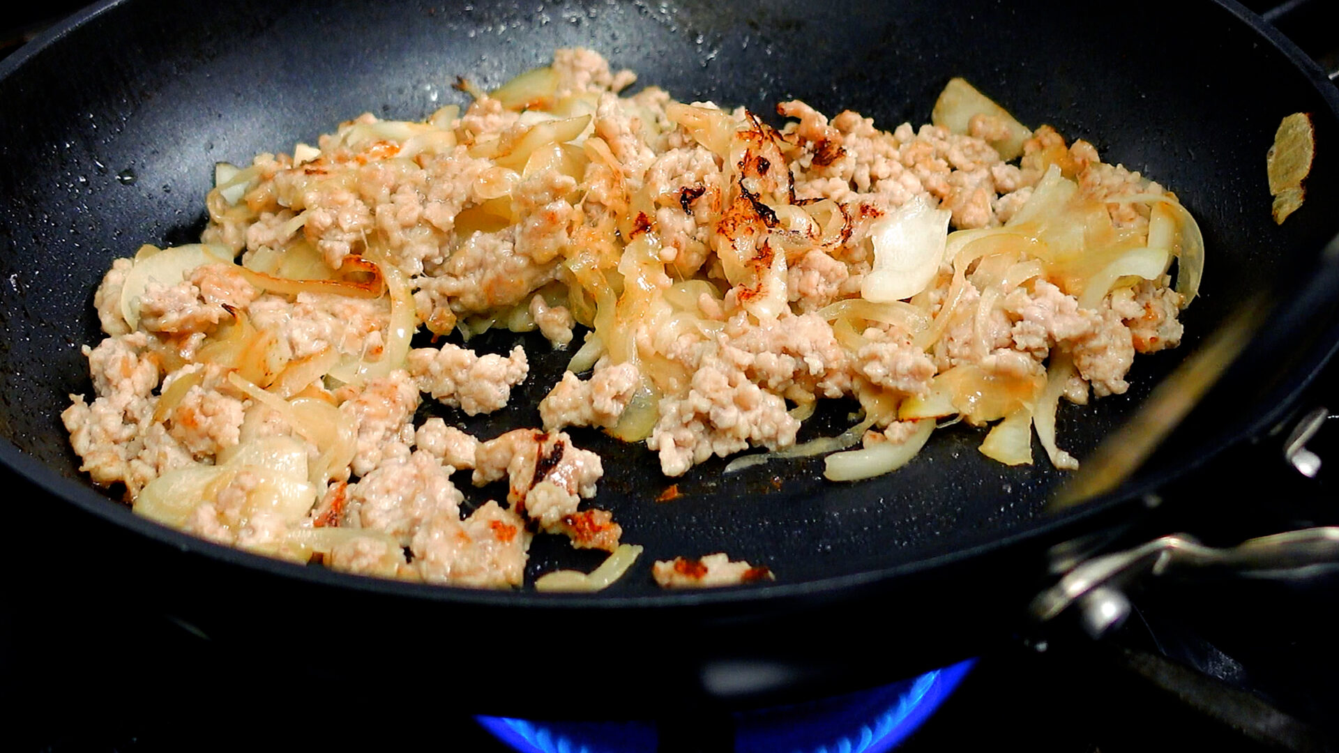 玉ねぎ、鶏ももひき肉を加え、ほぐすように炒める。途中塩をし、さらに炒める。
