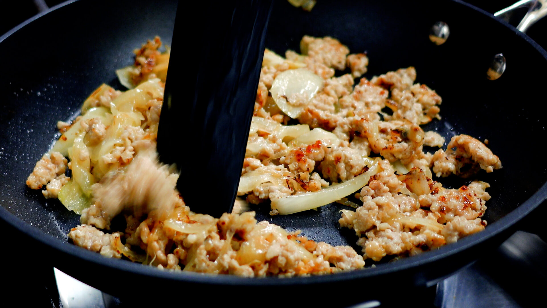 ひき肉がほぐれたら動かさずに焼き目をつけ、焼き目がついたらサッと炒める。