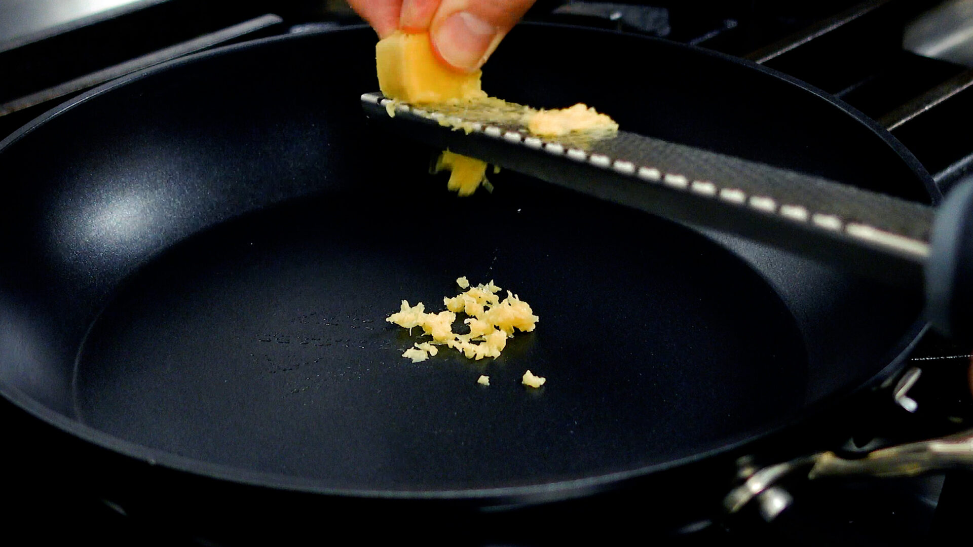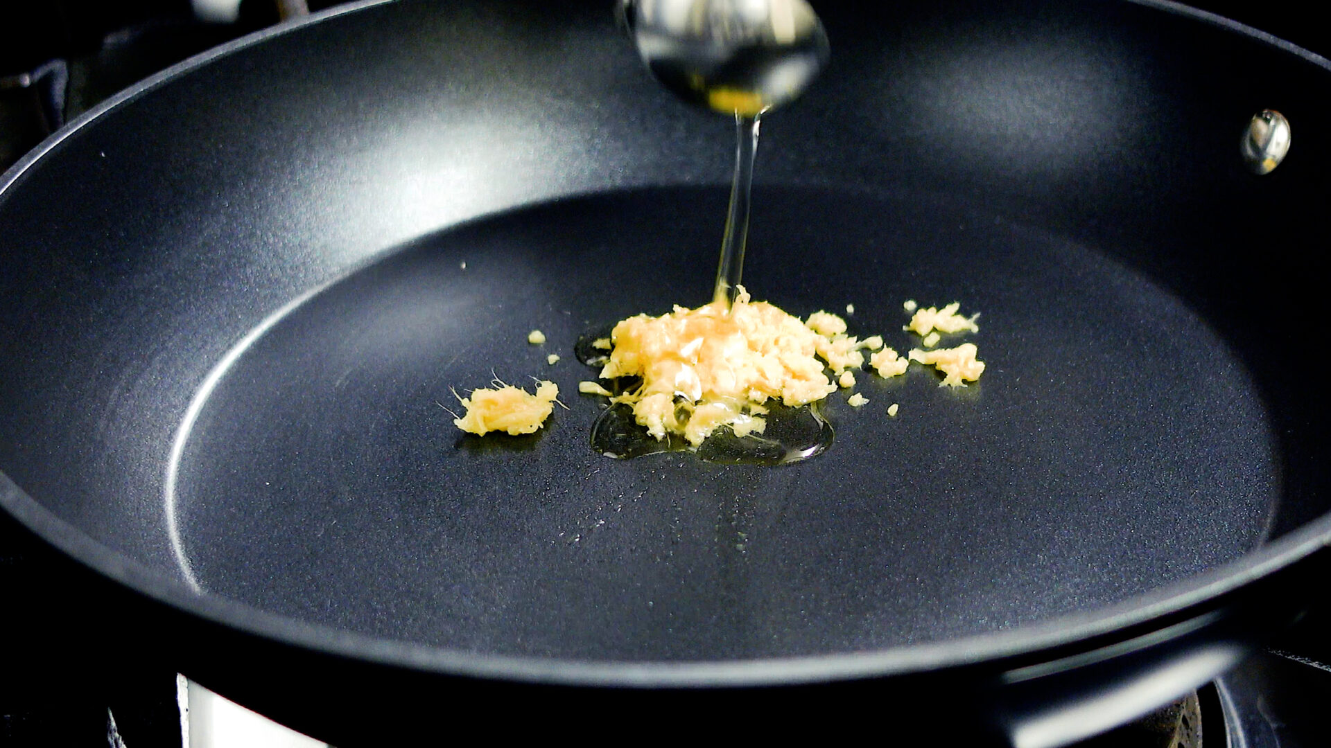 フライパンにしょうがをすりおろし、サラダ油を加え中火にかける。焼き目がつくまでじっくりと炒め香りを出す。
