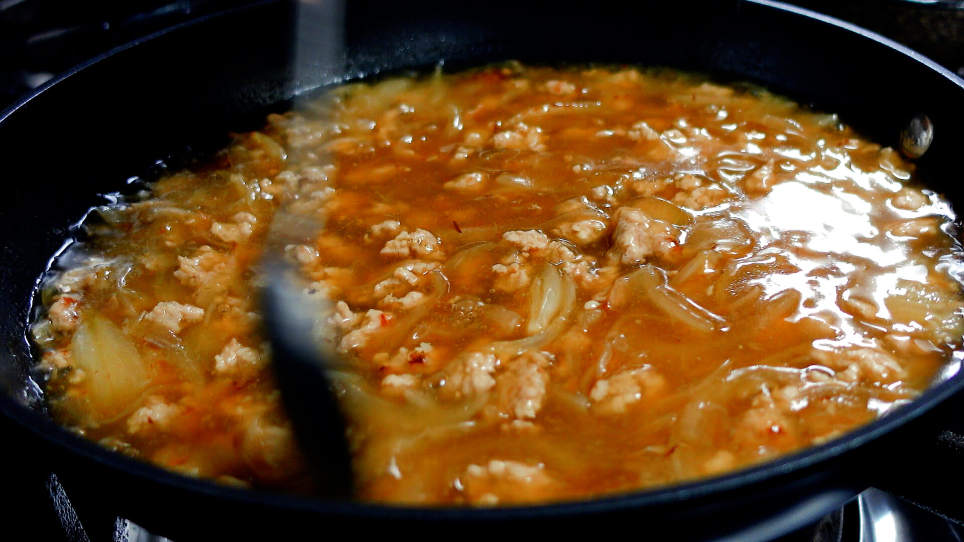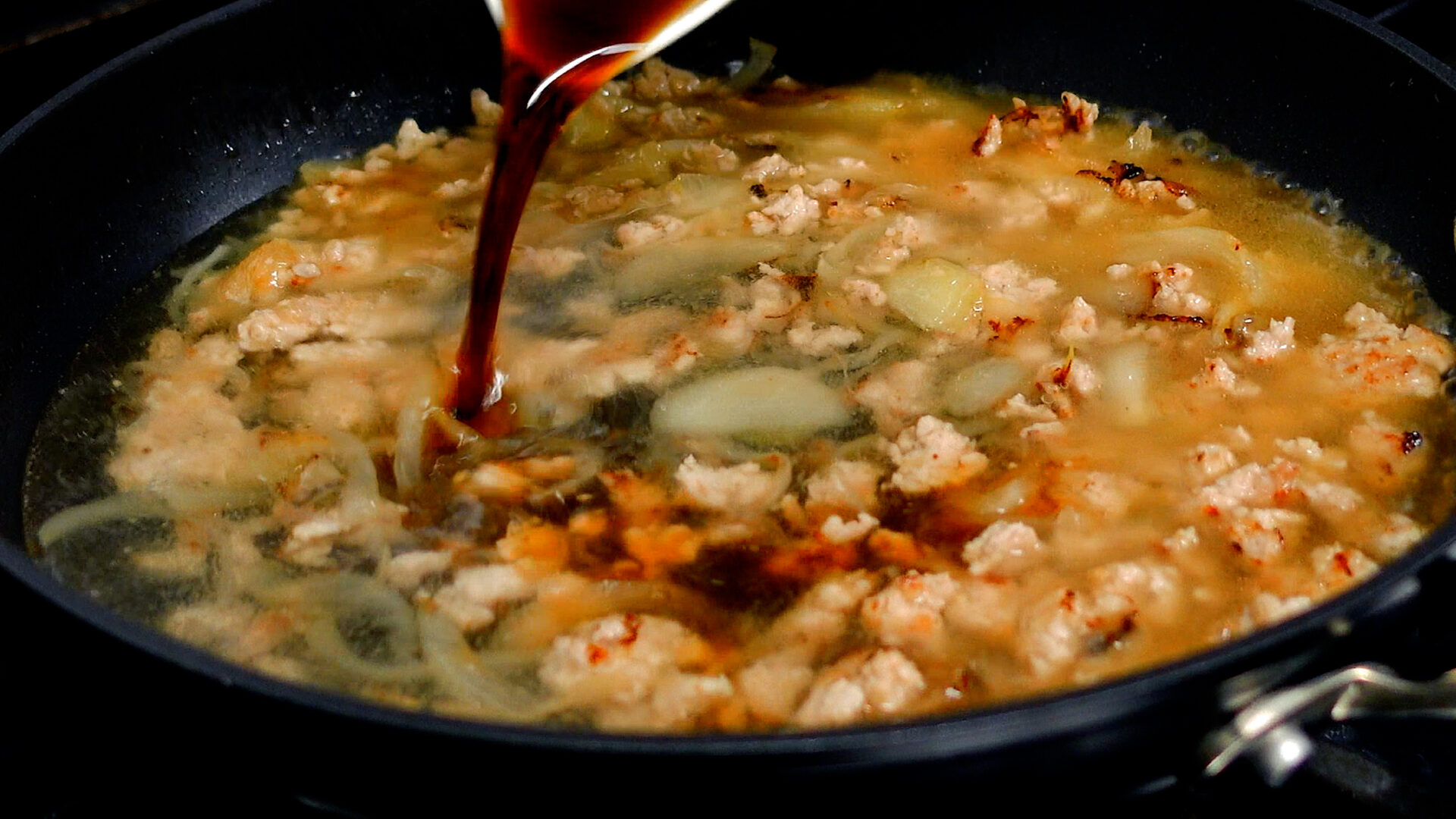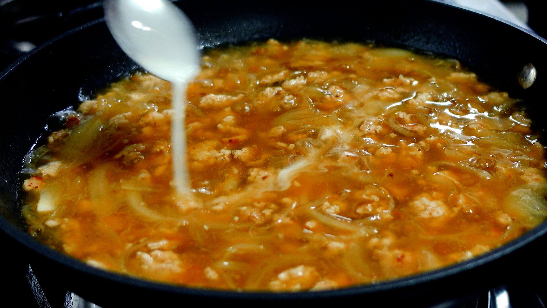 💡水溶き片栗粉は弱火で少量ずつ加えましょう。火加減強めで一気に加えてしまうとダマになりやすいので注意!今回は大さじ3ほどの水溶き片栗粉を加えています。