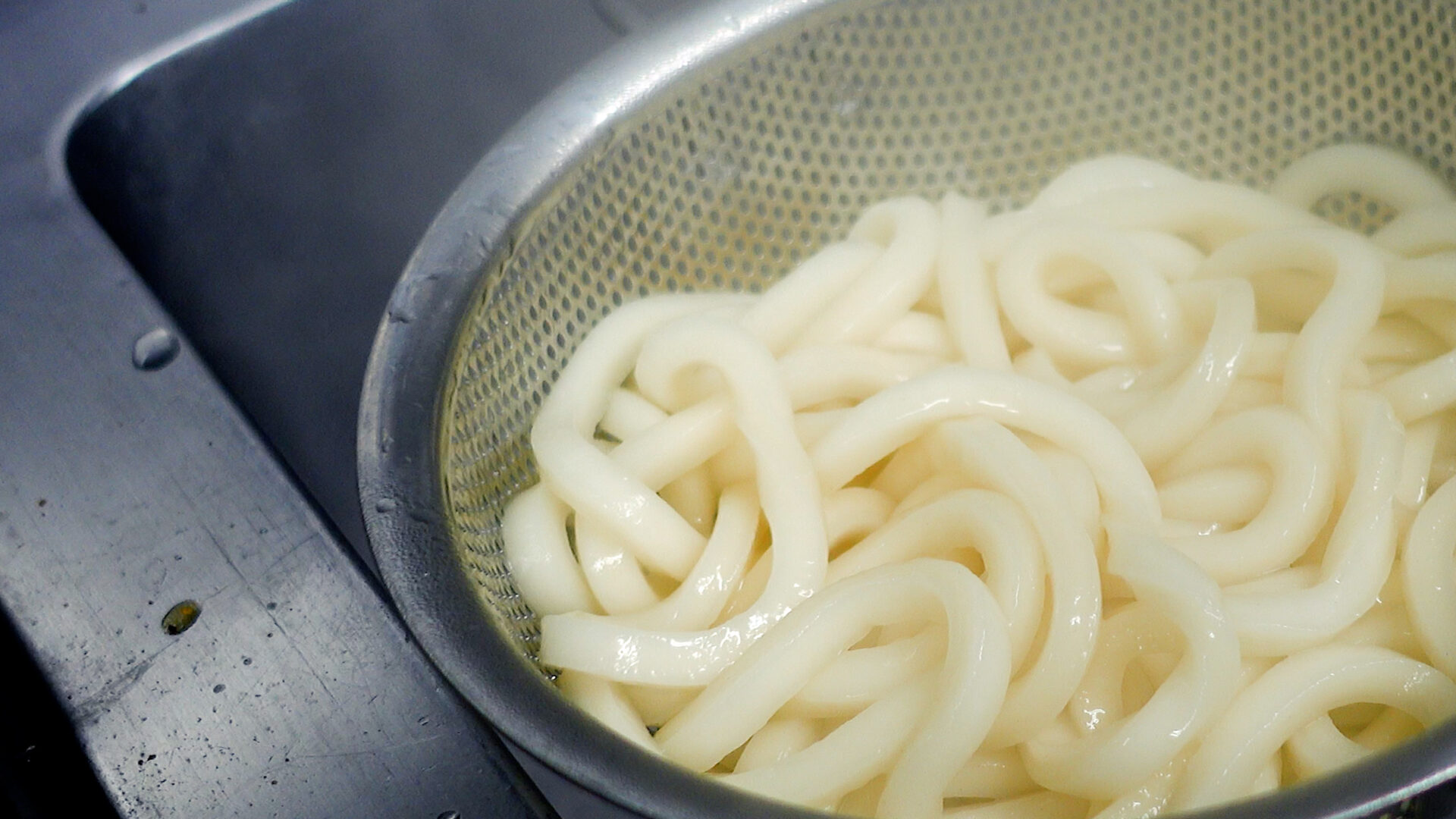 うどんは表示通りにゆで、ザルにあけ湯を切る。