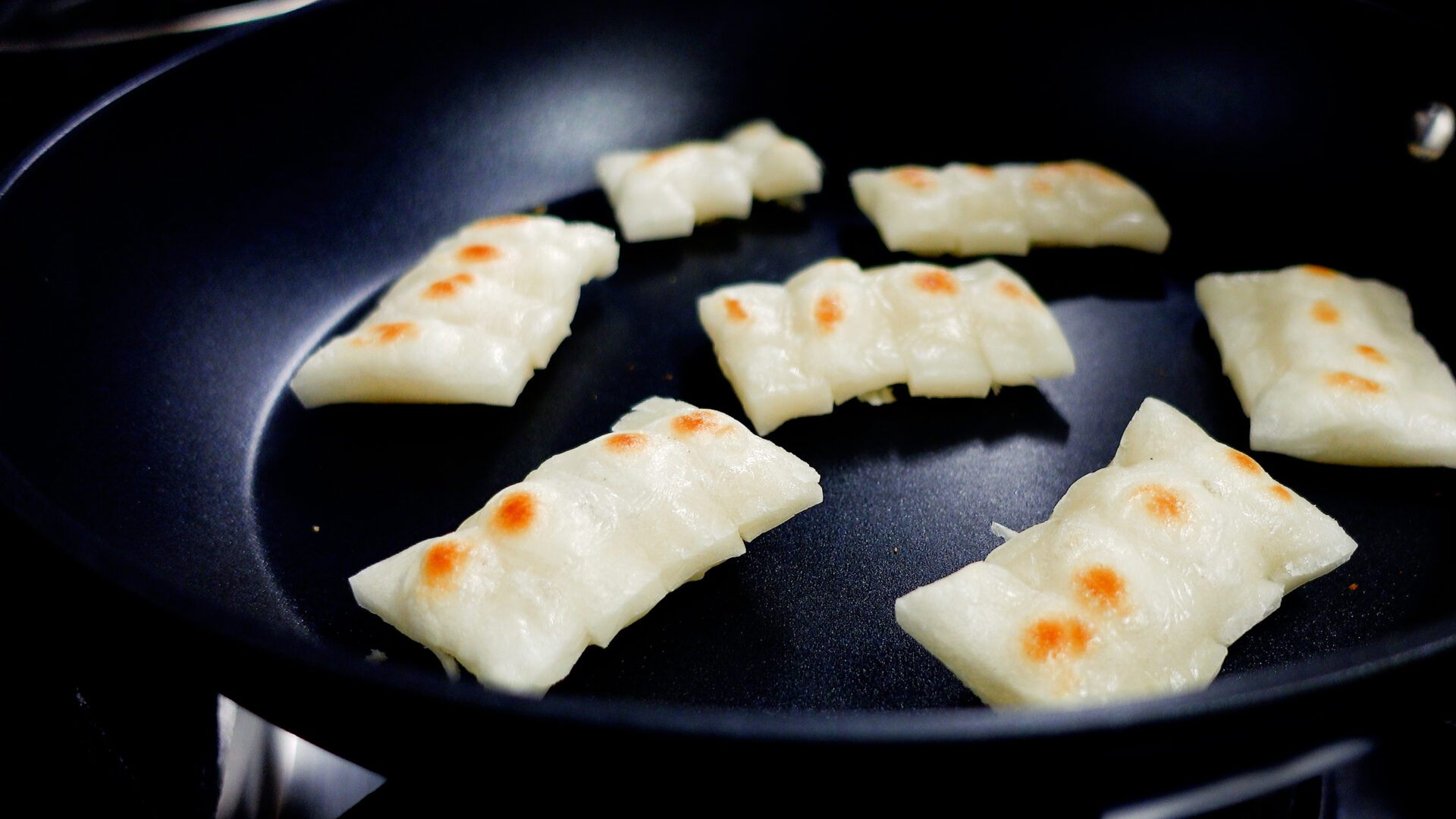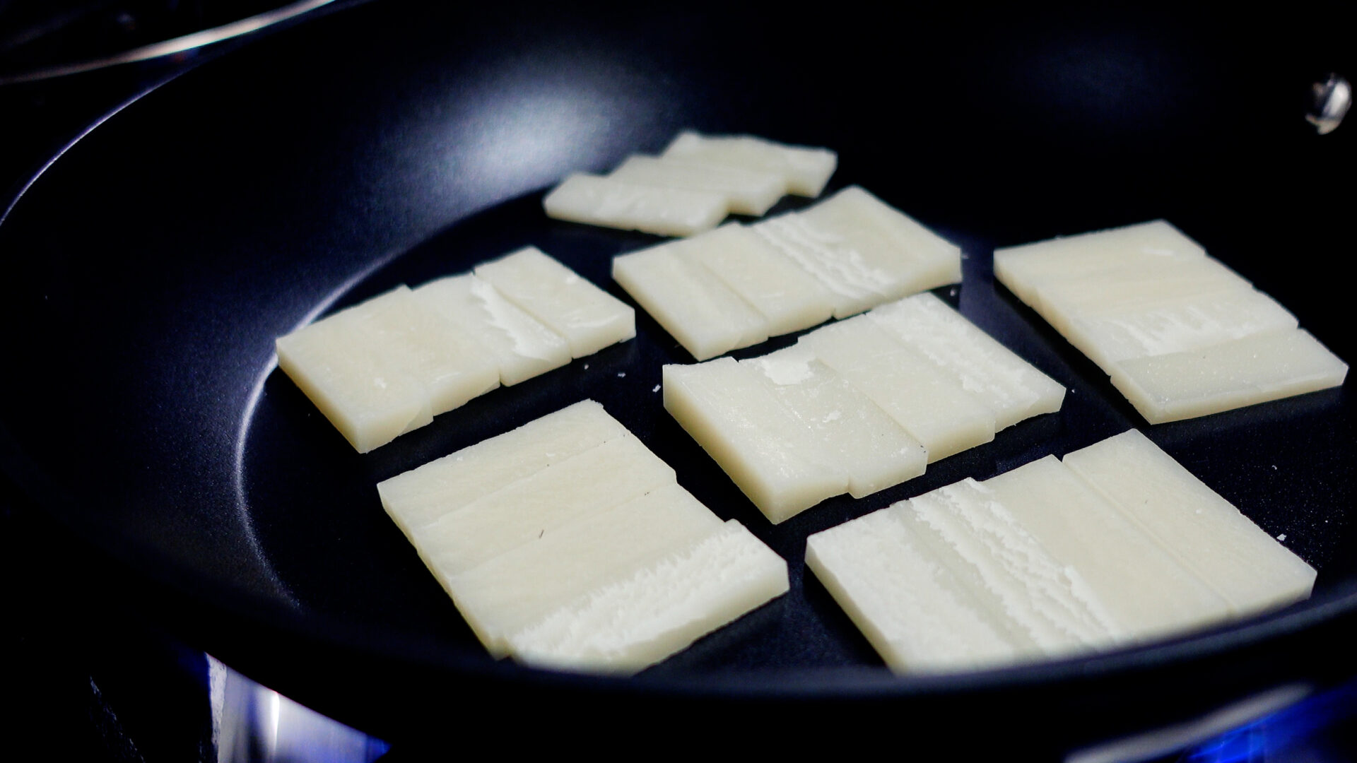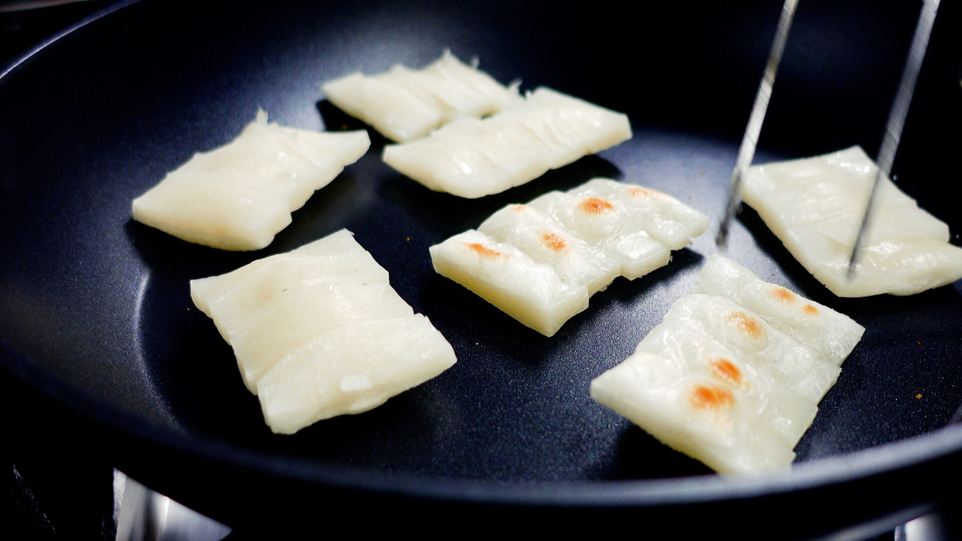 フッ素樹脂加工のフライパンに3~4枚を1セットで並べ、弱火にかける。
