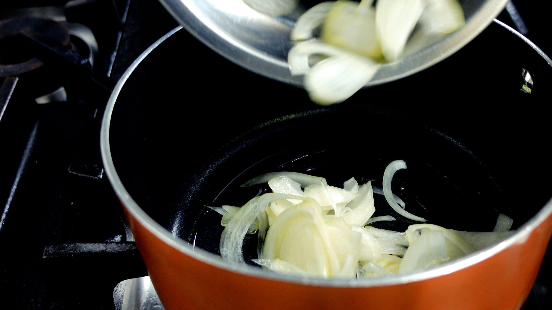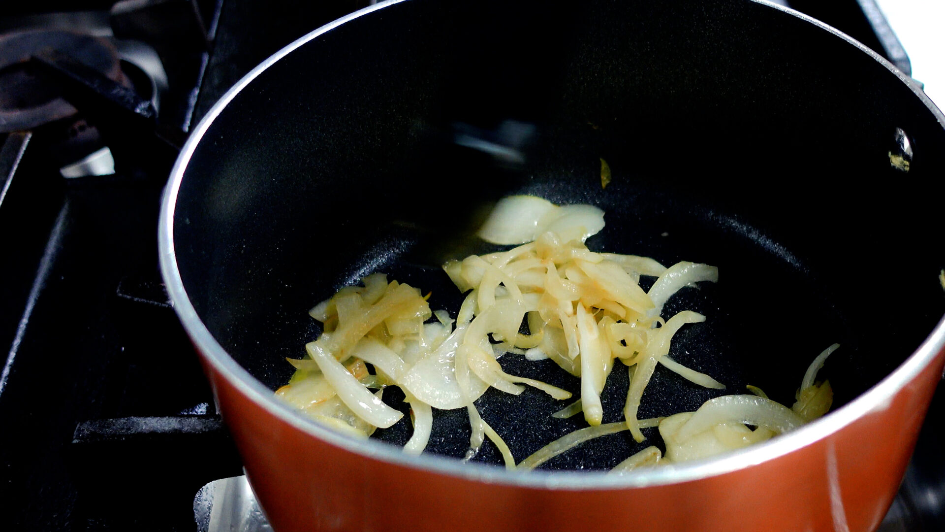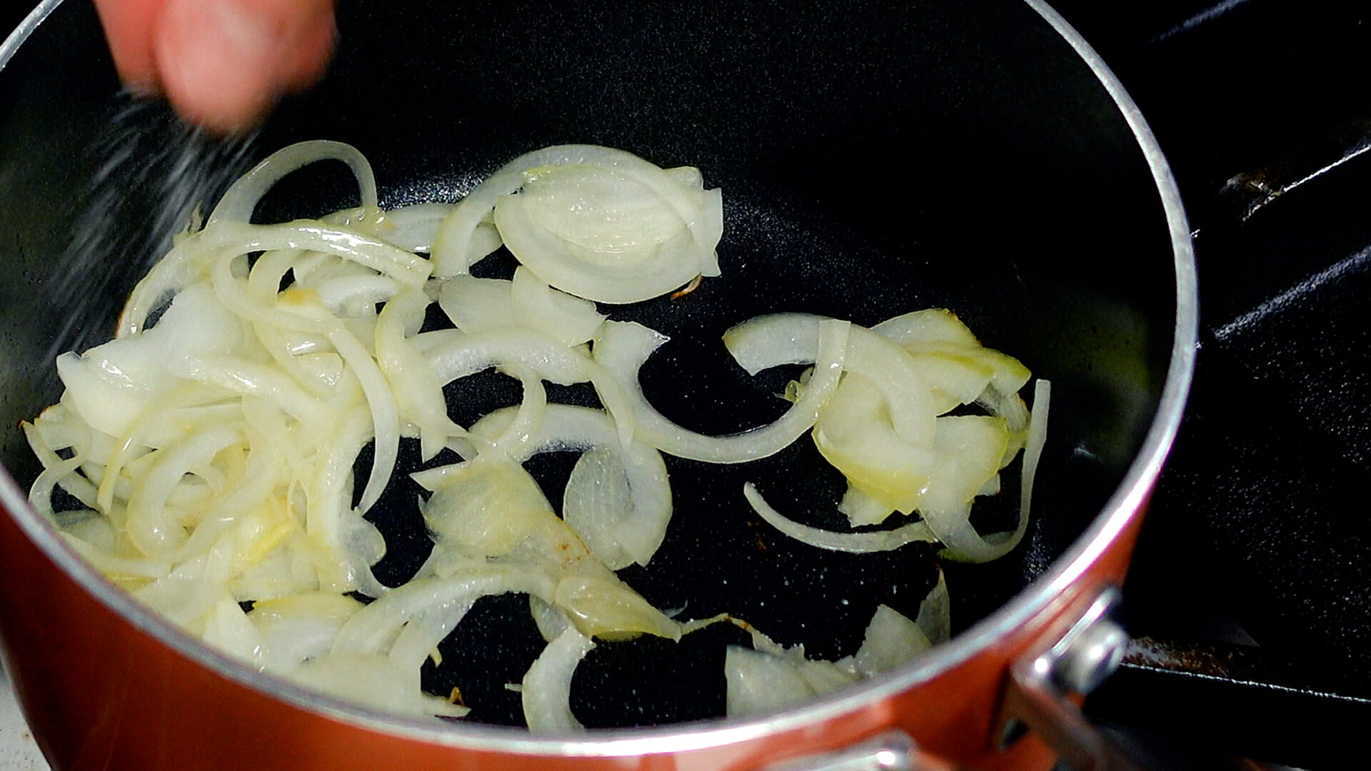 鍋にオリーブ油を引き中火にかける。温まったら玉ねぎを加え炒める。油がなじんだら塩 1つまみをし、さらに炒める。