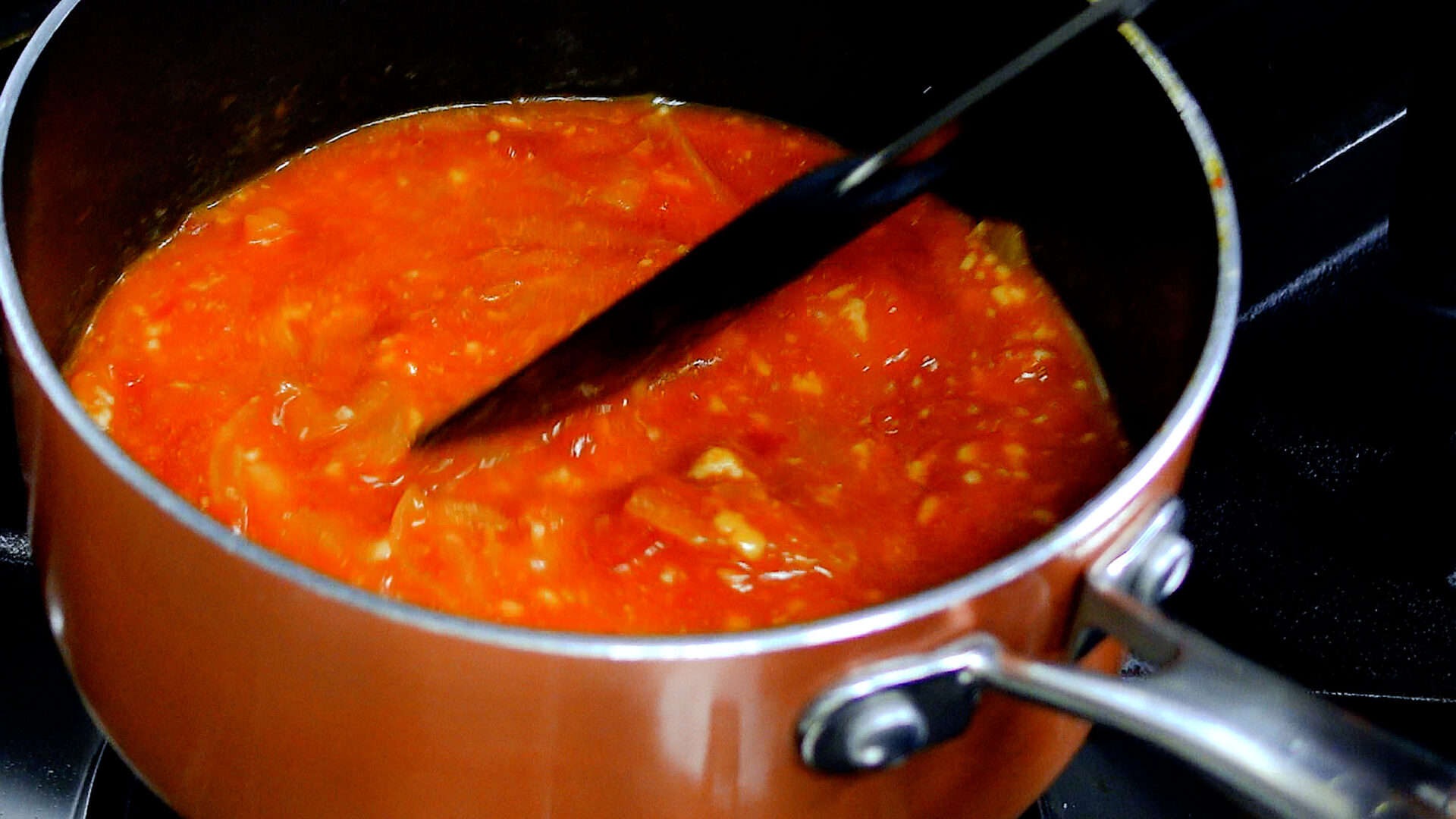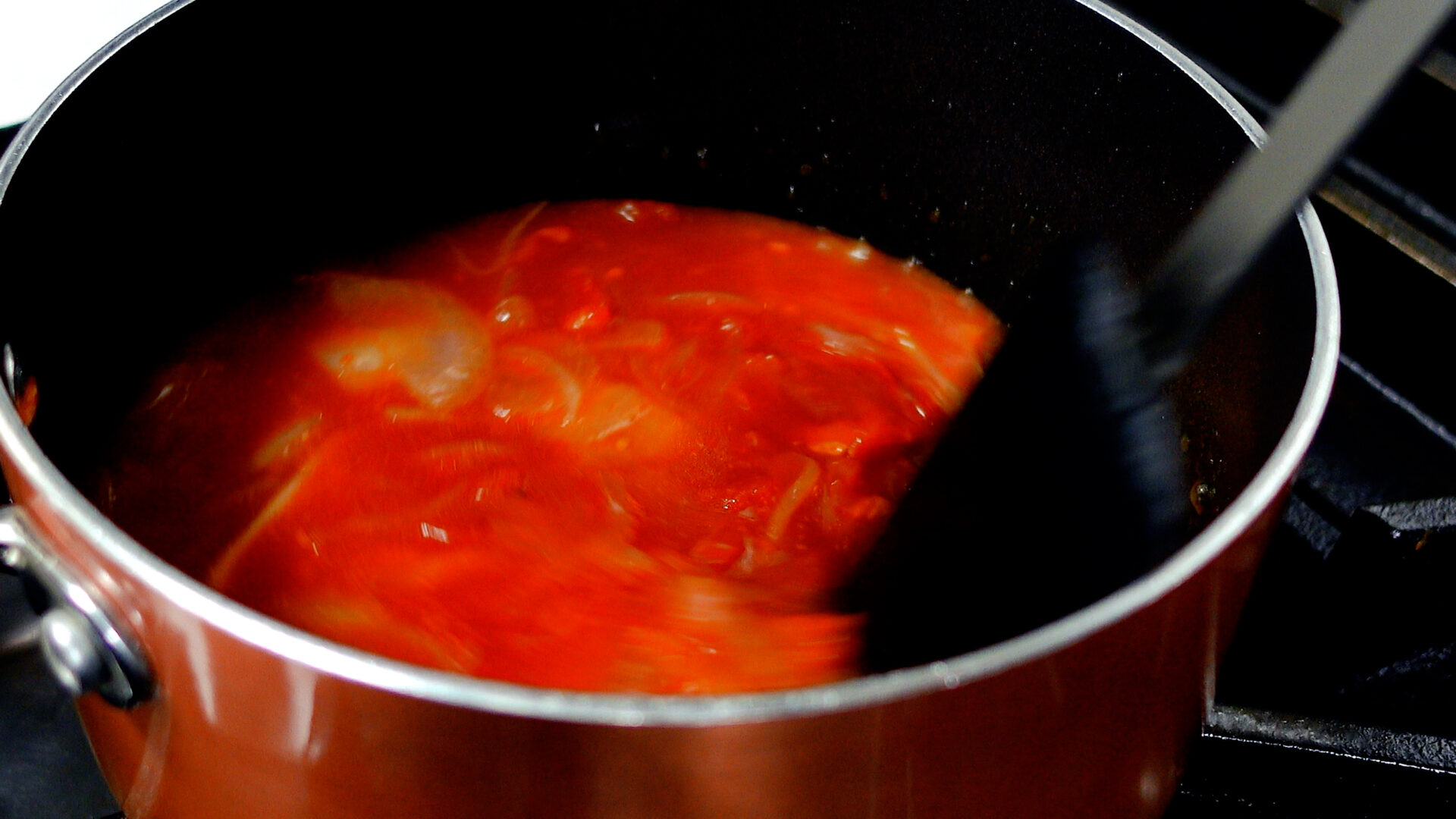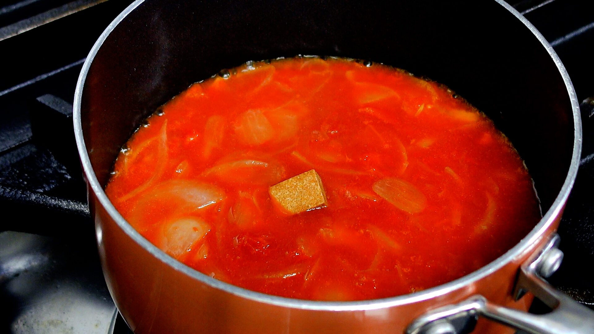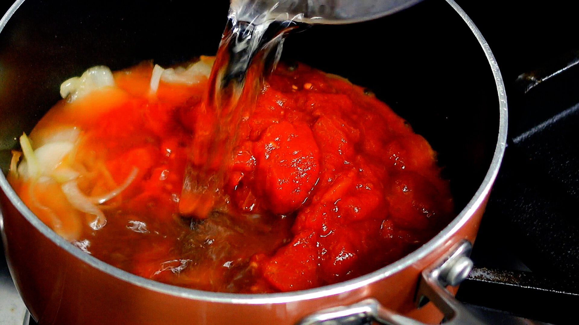玉ねぎが茶色くなり、しんなりしてきたらカットトマト缶、水を加える。混ぜ合わせながらひと煮立ちさせる。