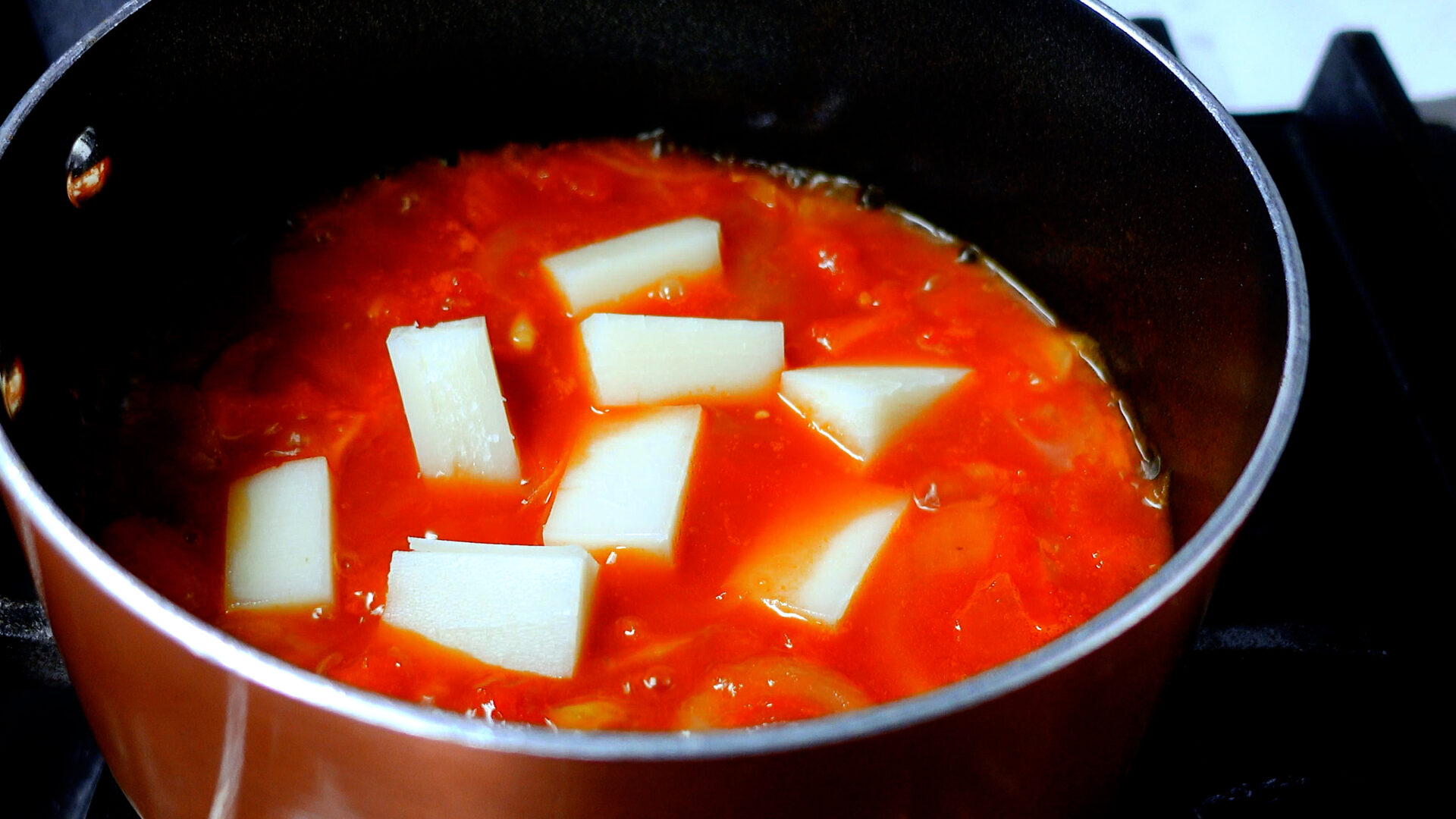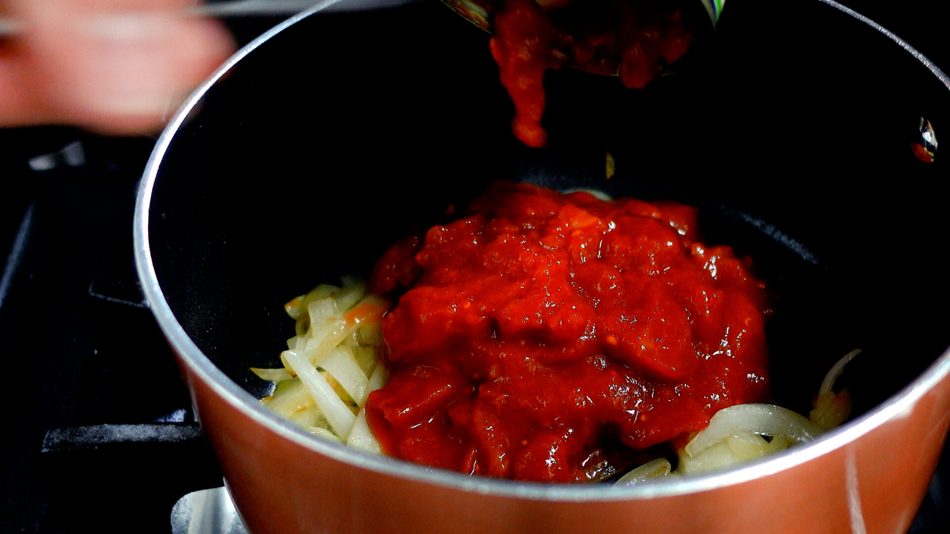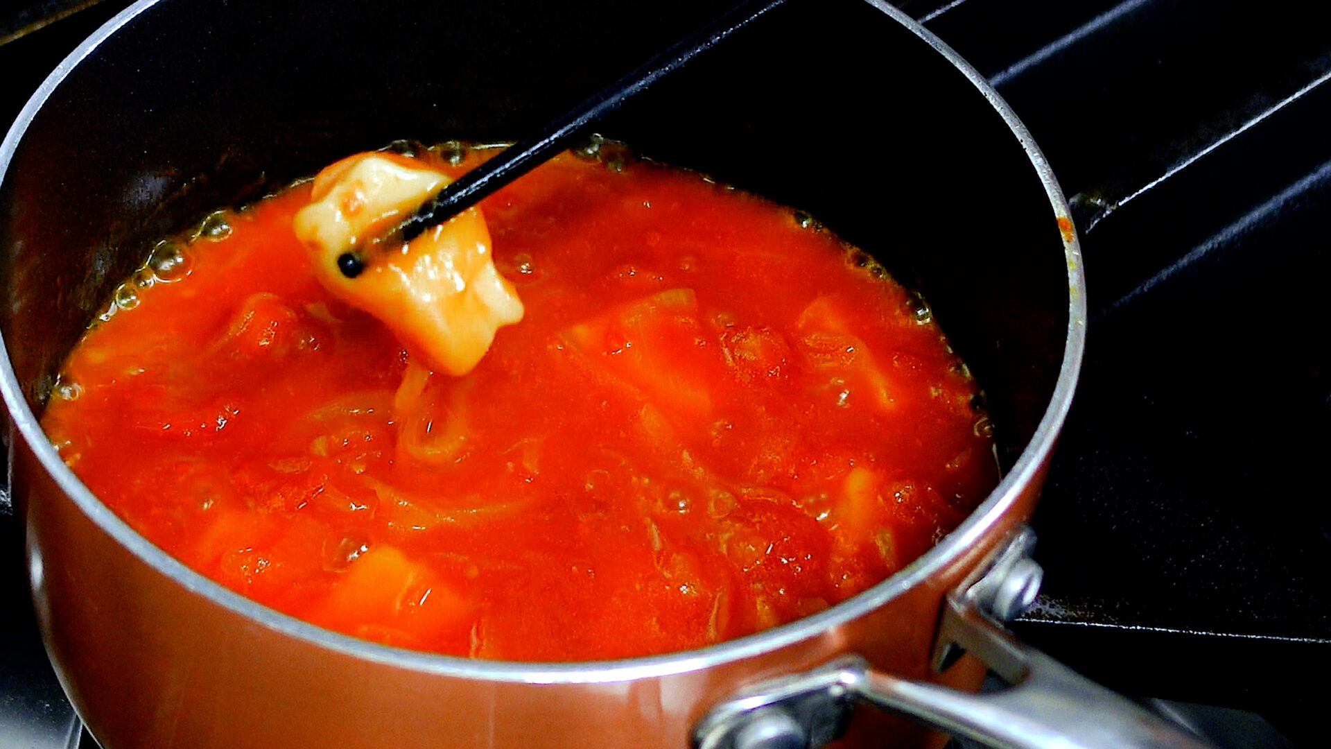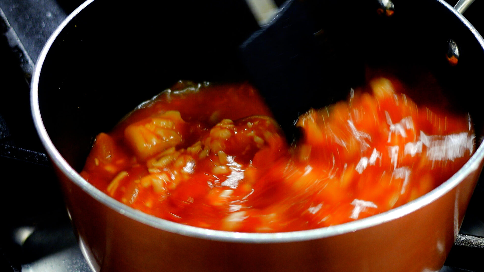 玉ねぎが茶色くなり、しんなりしてきたらカットトマト缶、水を加える。混ぜ合わせながらひと煮立ちさせる。