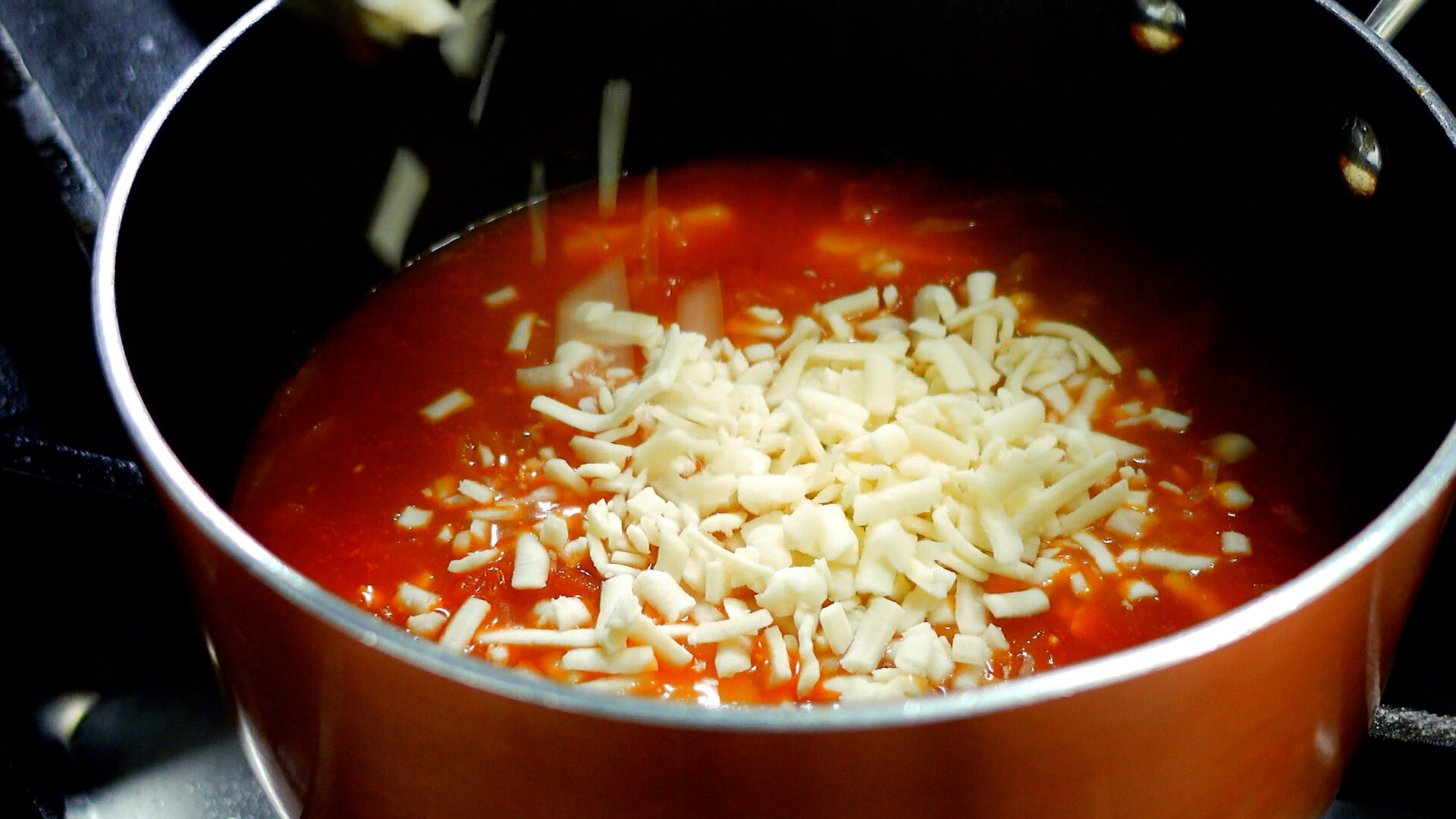 火をとめ、ミックスチーズを加える。混ぜ合わせチーズをある程度溶かす。