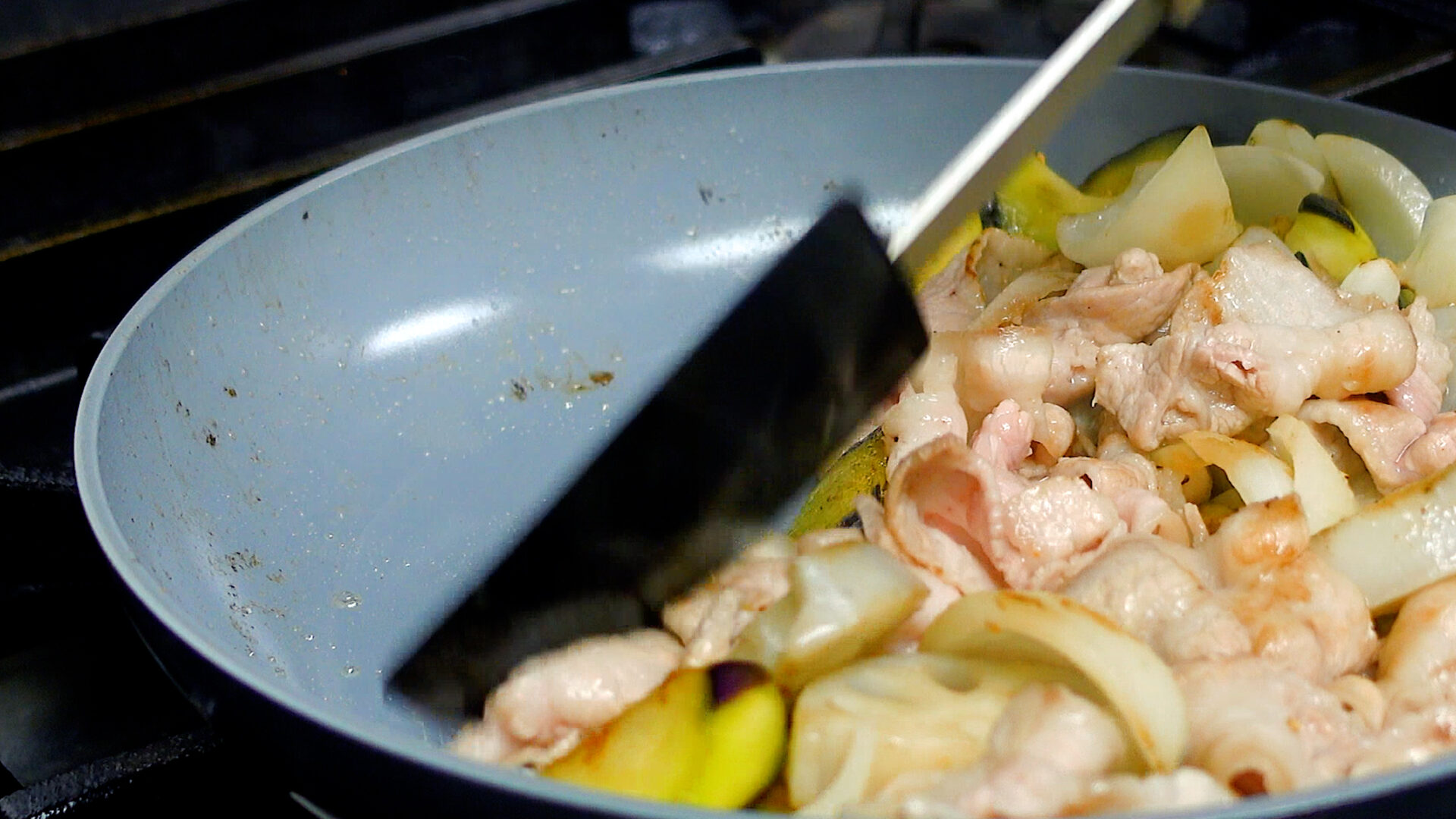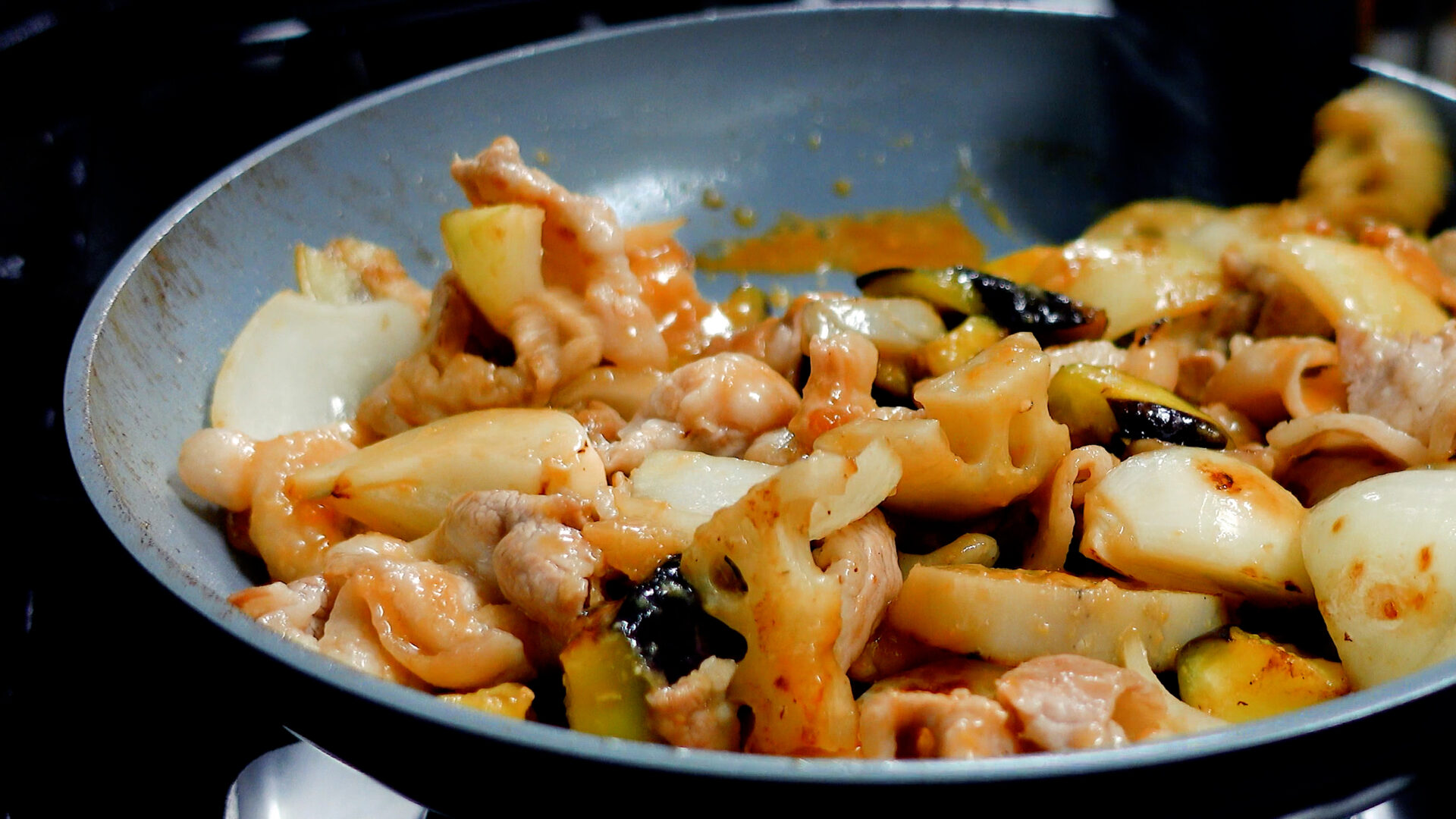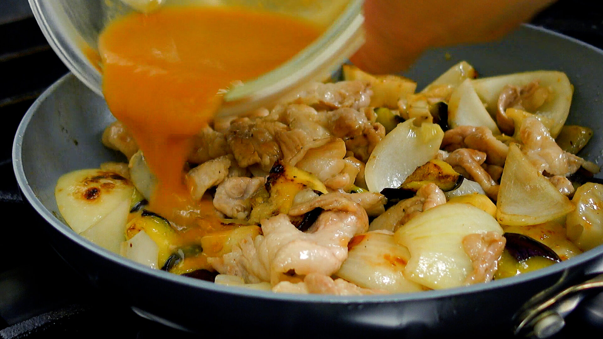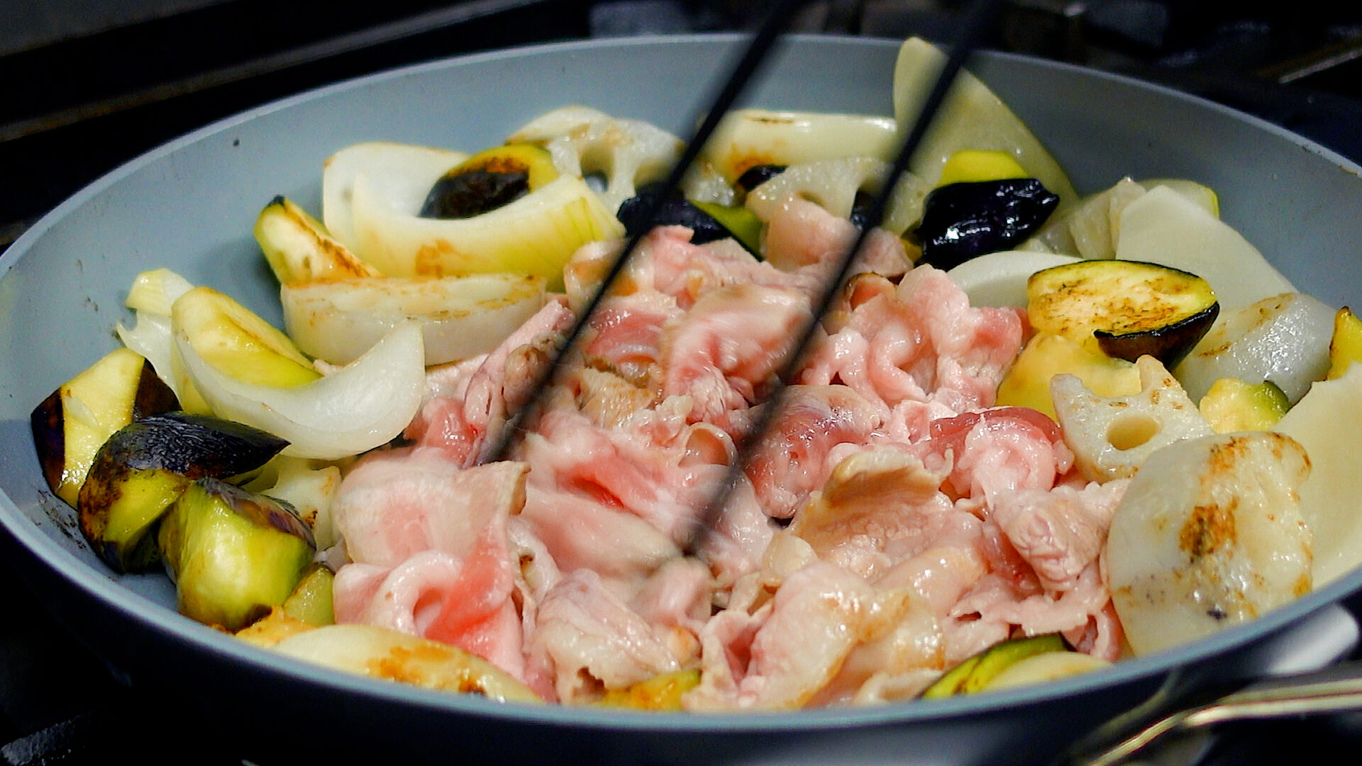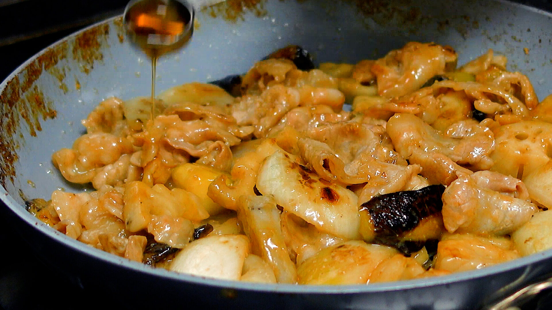 豚肉は8割ほど火が通ったところでタレを加えると柔らかジューシーに仕上がります。