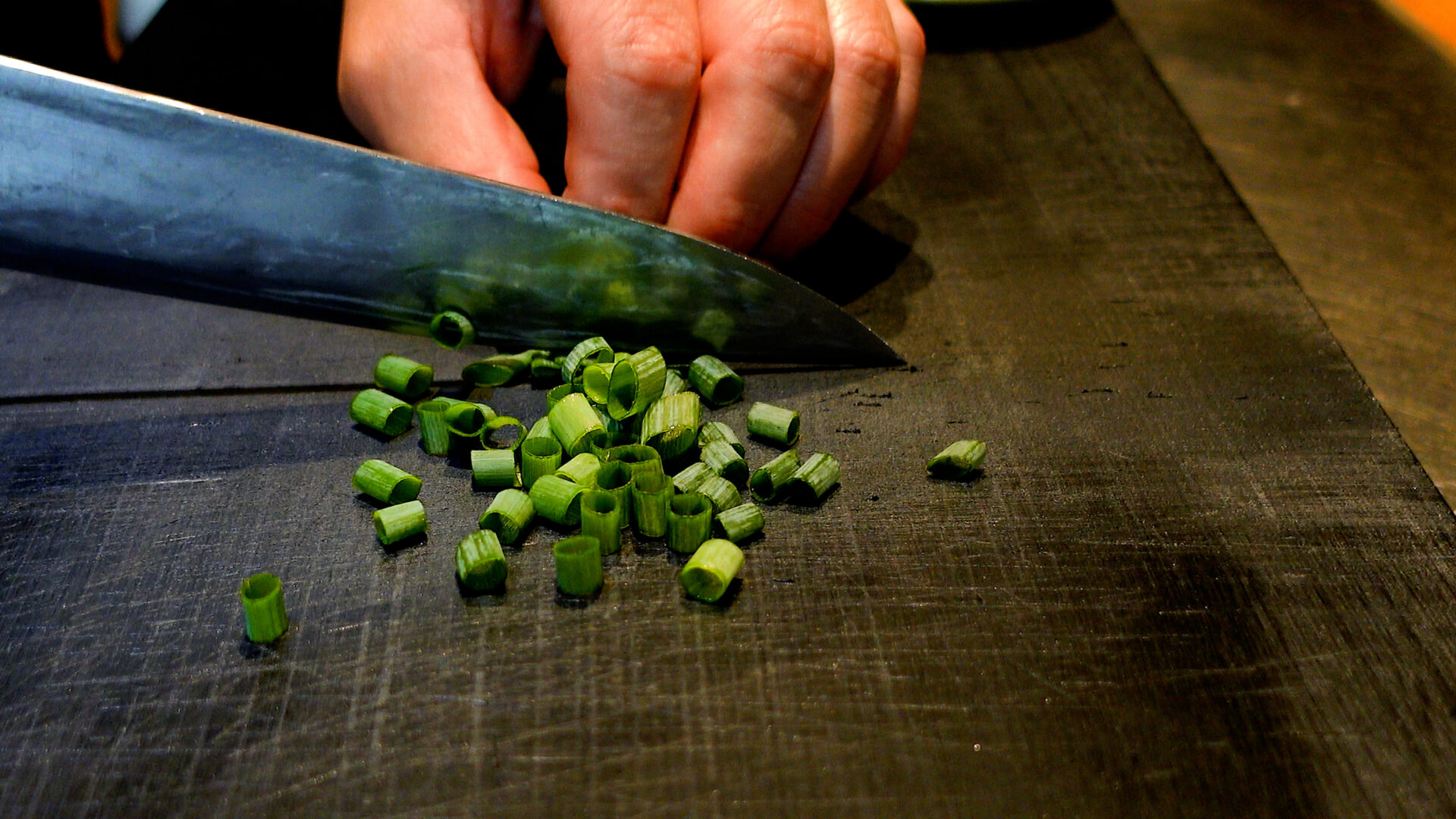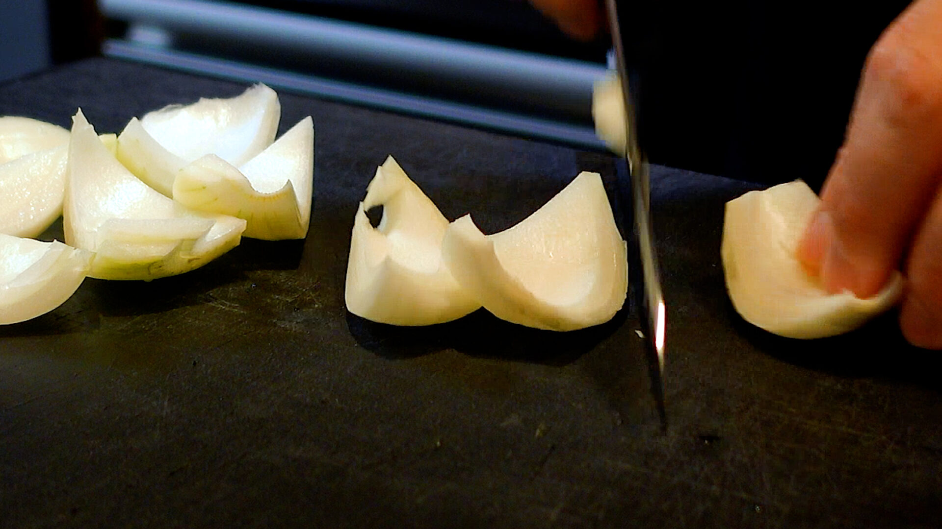 玉ねぎは乱切り、青ネギは小口切りにする。