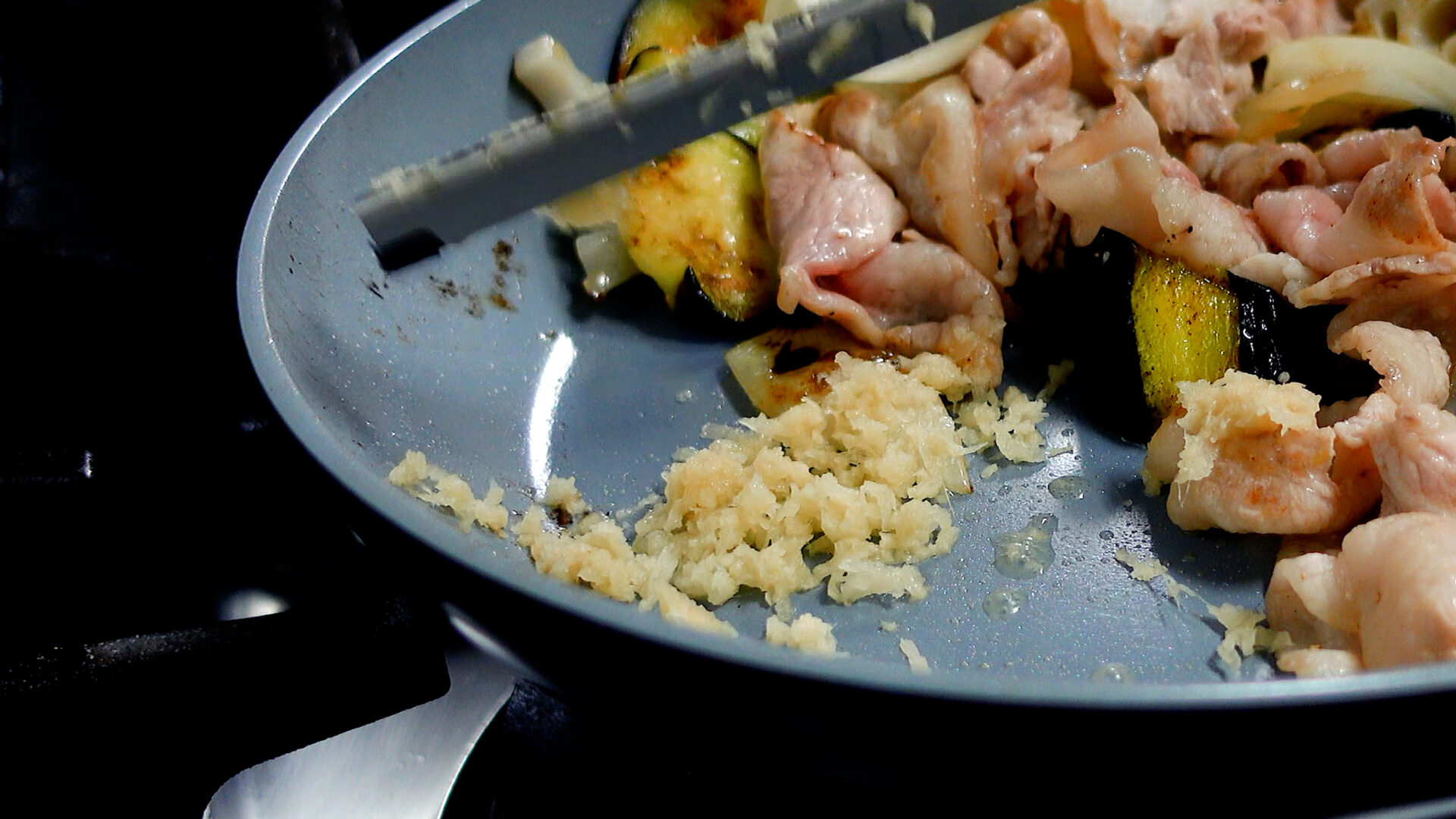 フライパンにスペースをあけ、生姜をおろして加える。弱火にかけ生姜を炒めて香りを出す。香りが出てきたら中火にし、具材と合わせる。