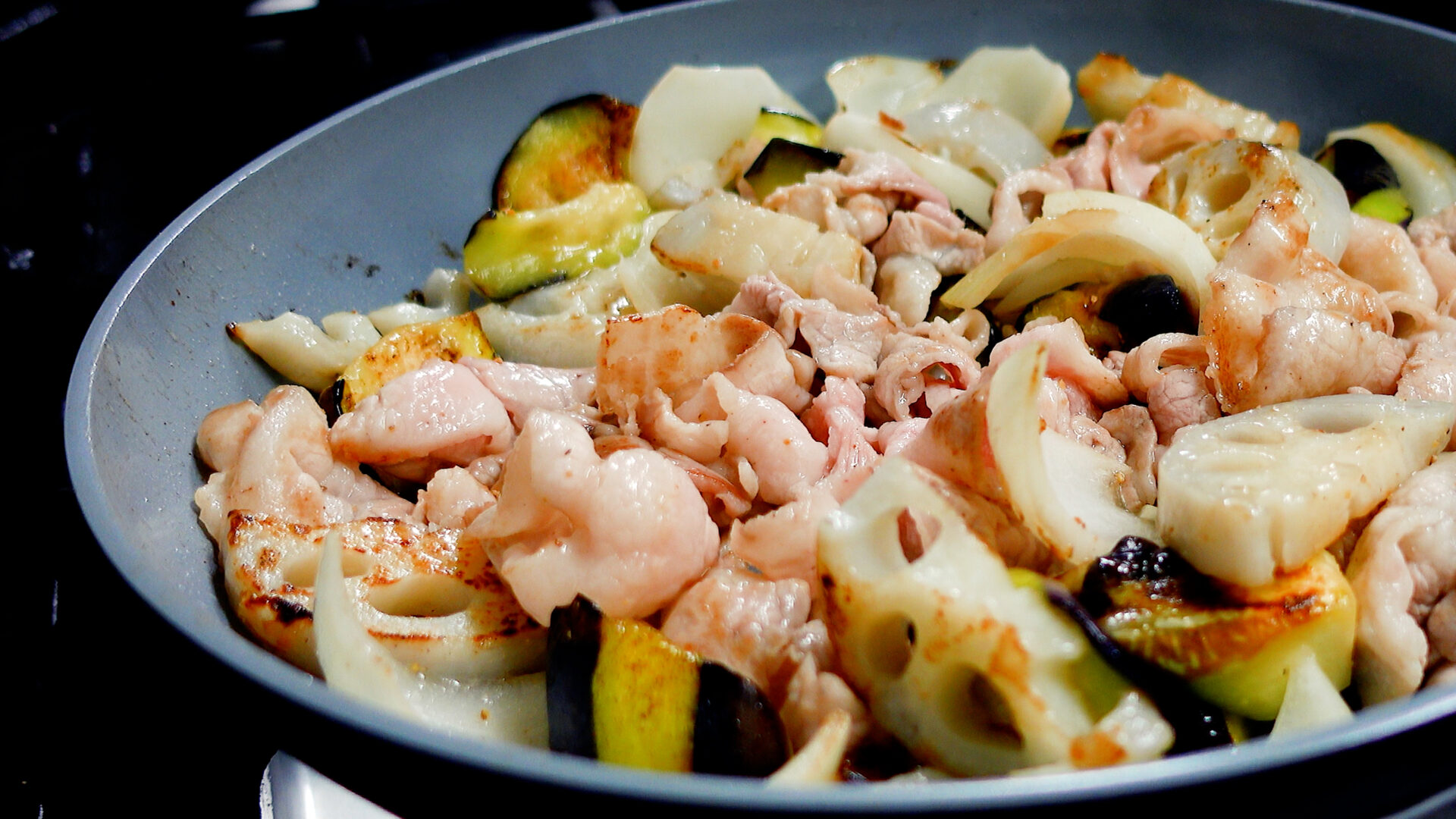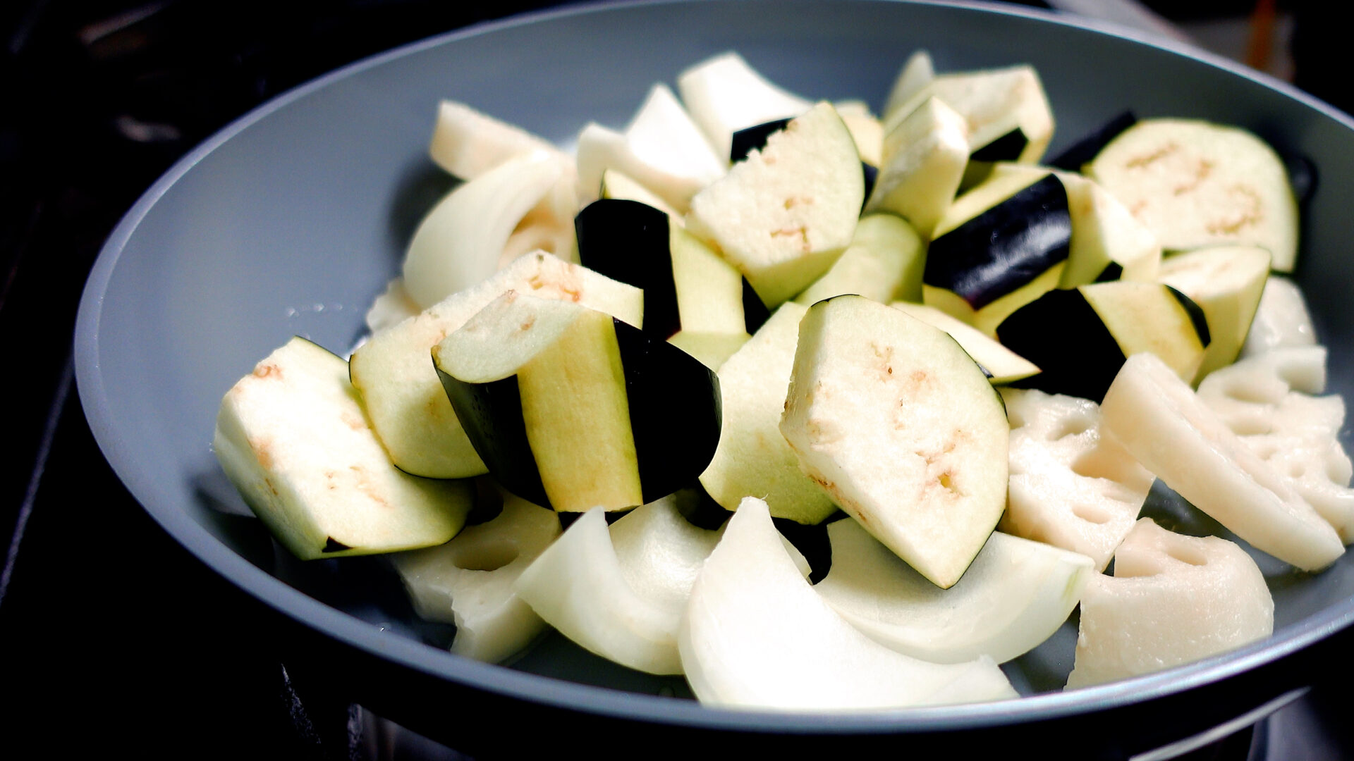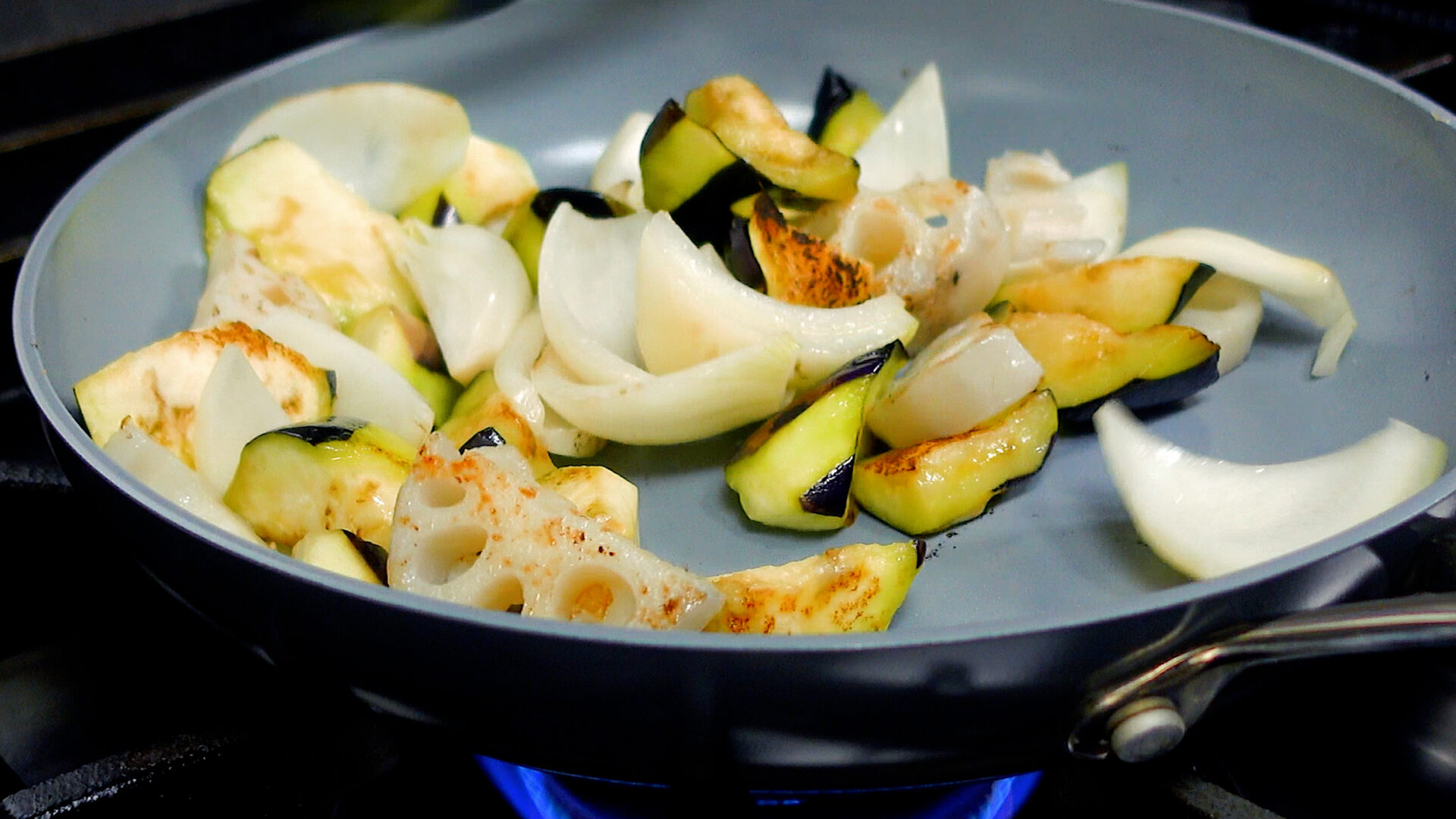 フライパンにサラダ油をひき中火にかける。あたたまったられんこん、玉ねぎ、なすを加え、焼き目がつき、なすがしんなりするまで炒める。