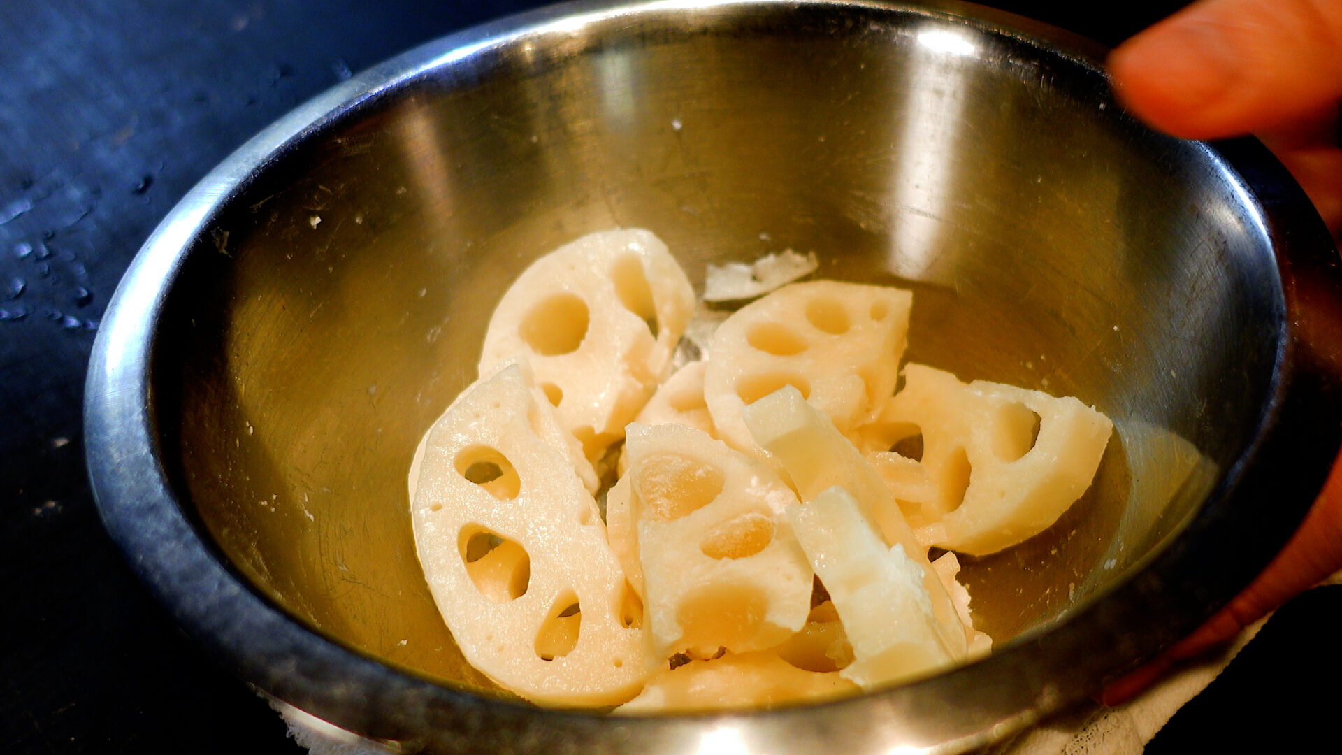 れんこんは1cm幅に切り、さらに半分に切る。ボウルに入れ片栗粉をまぶす。