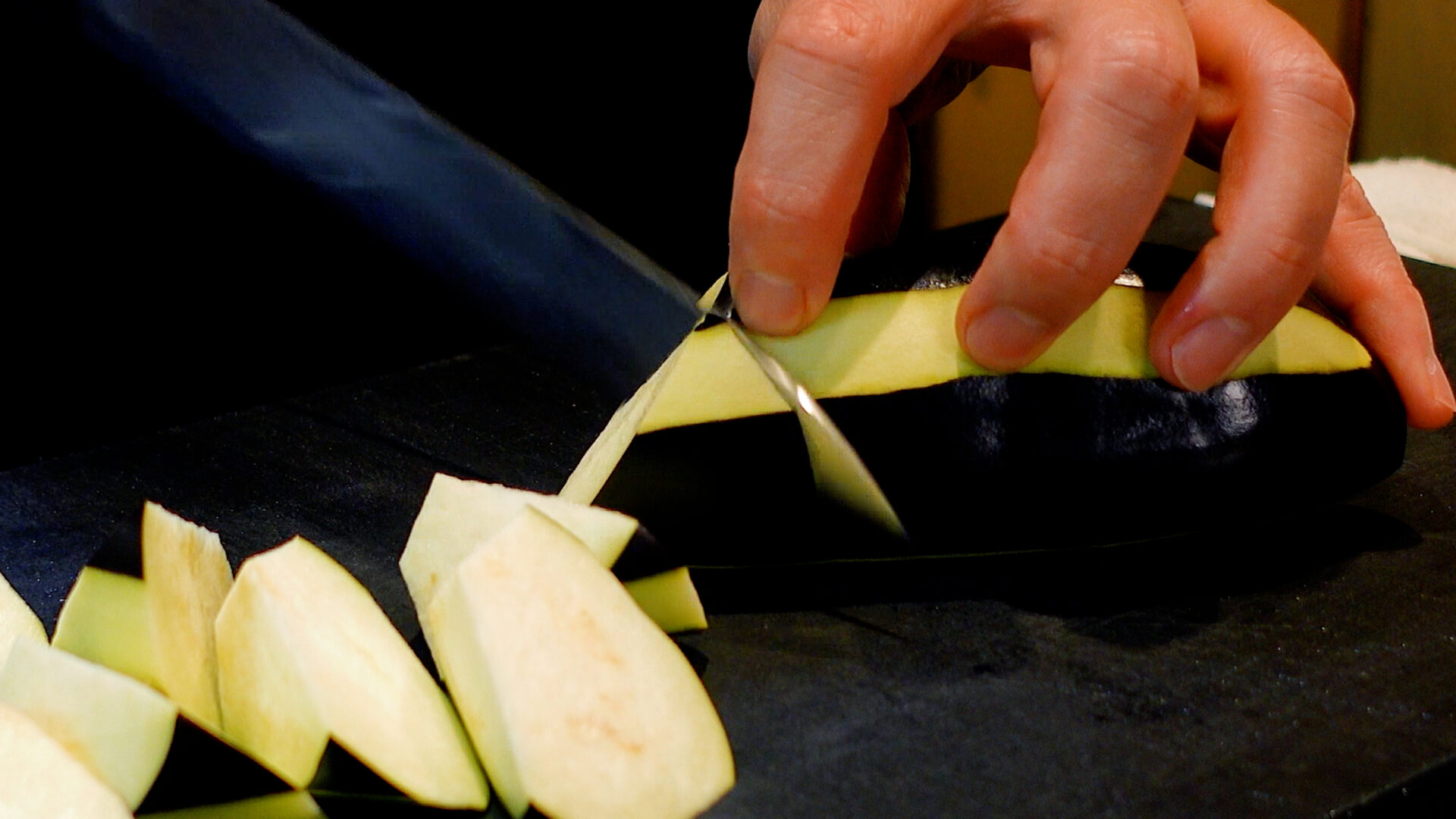 なすはヘタを切り間隔をあけピーラーで皮をむき、乱切りにする。