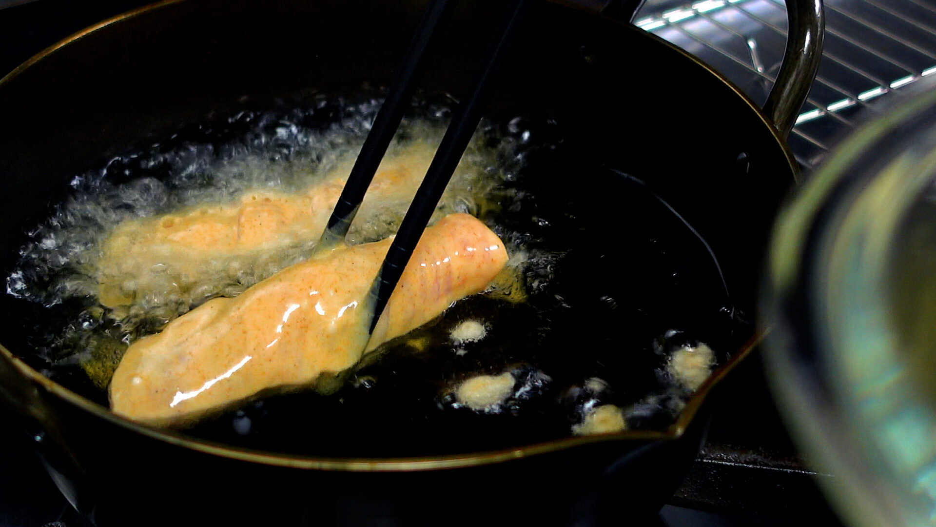 豚巻きを衣にくぐらせ、170℃の揚げ油で4~5分揚げる。揚げたら取り出し油を切る。