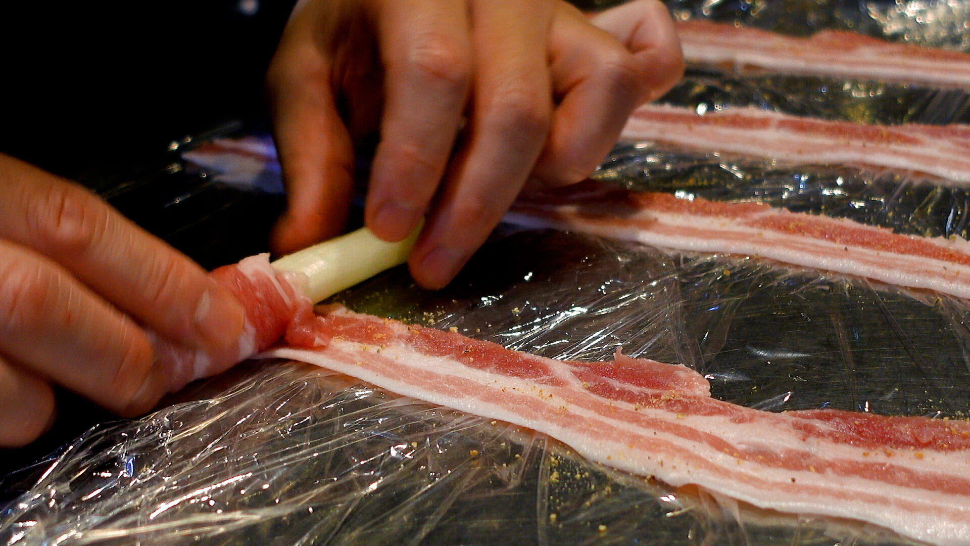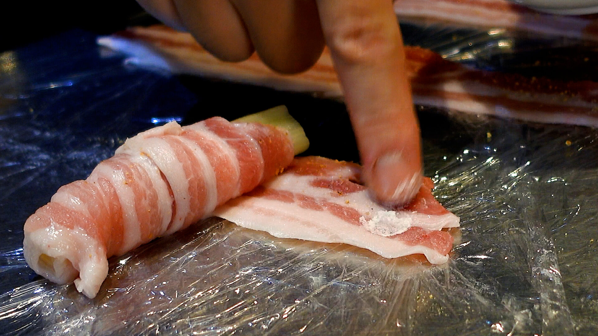 長ねぎを手前におき、豚肉をくるくると巻きつける。巻き終わりに薄力粉をぬる。