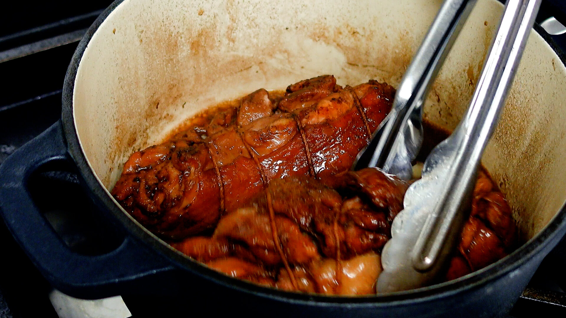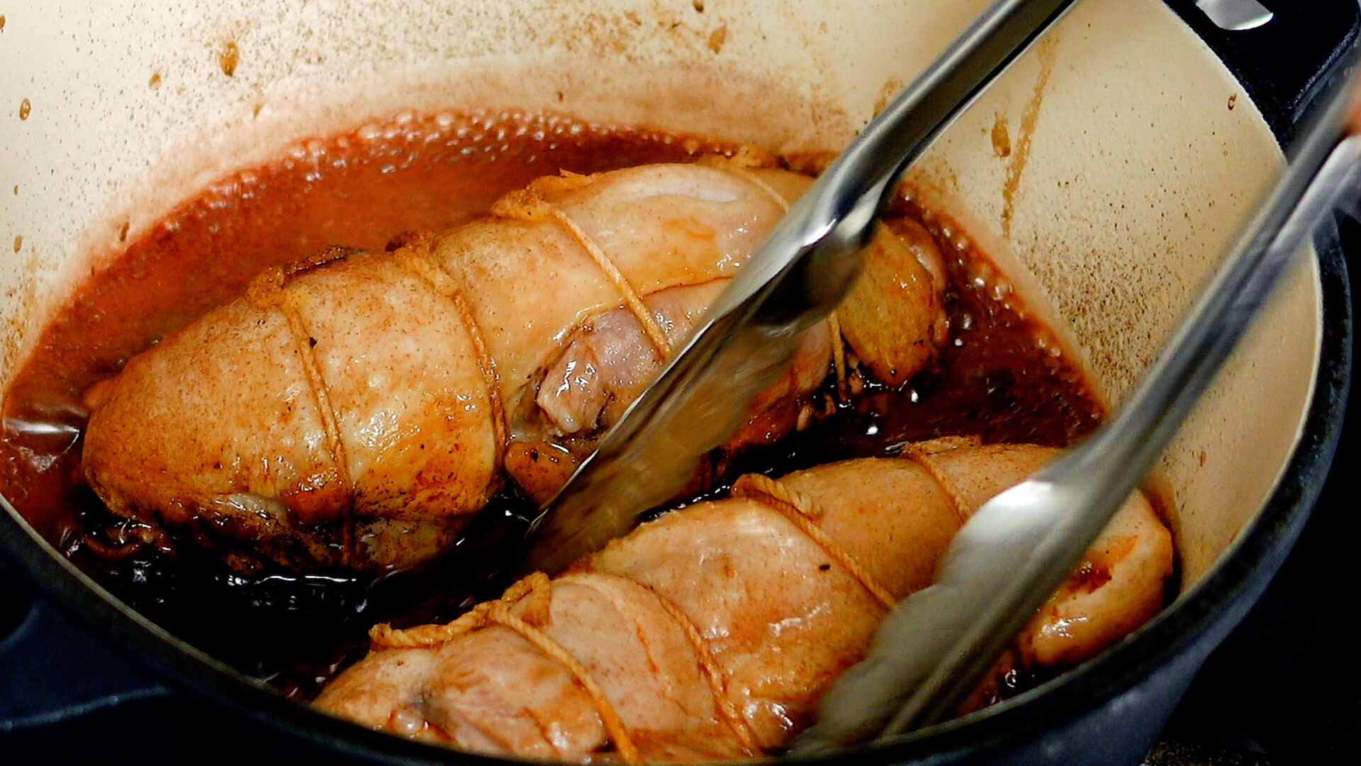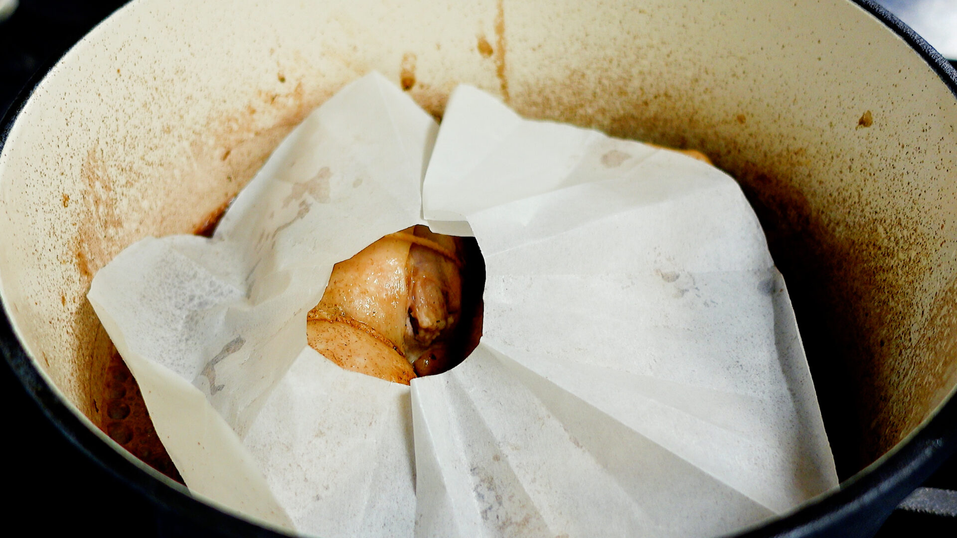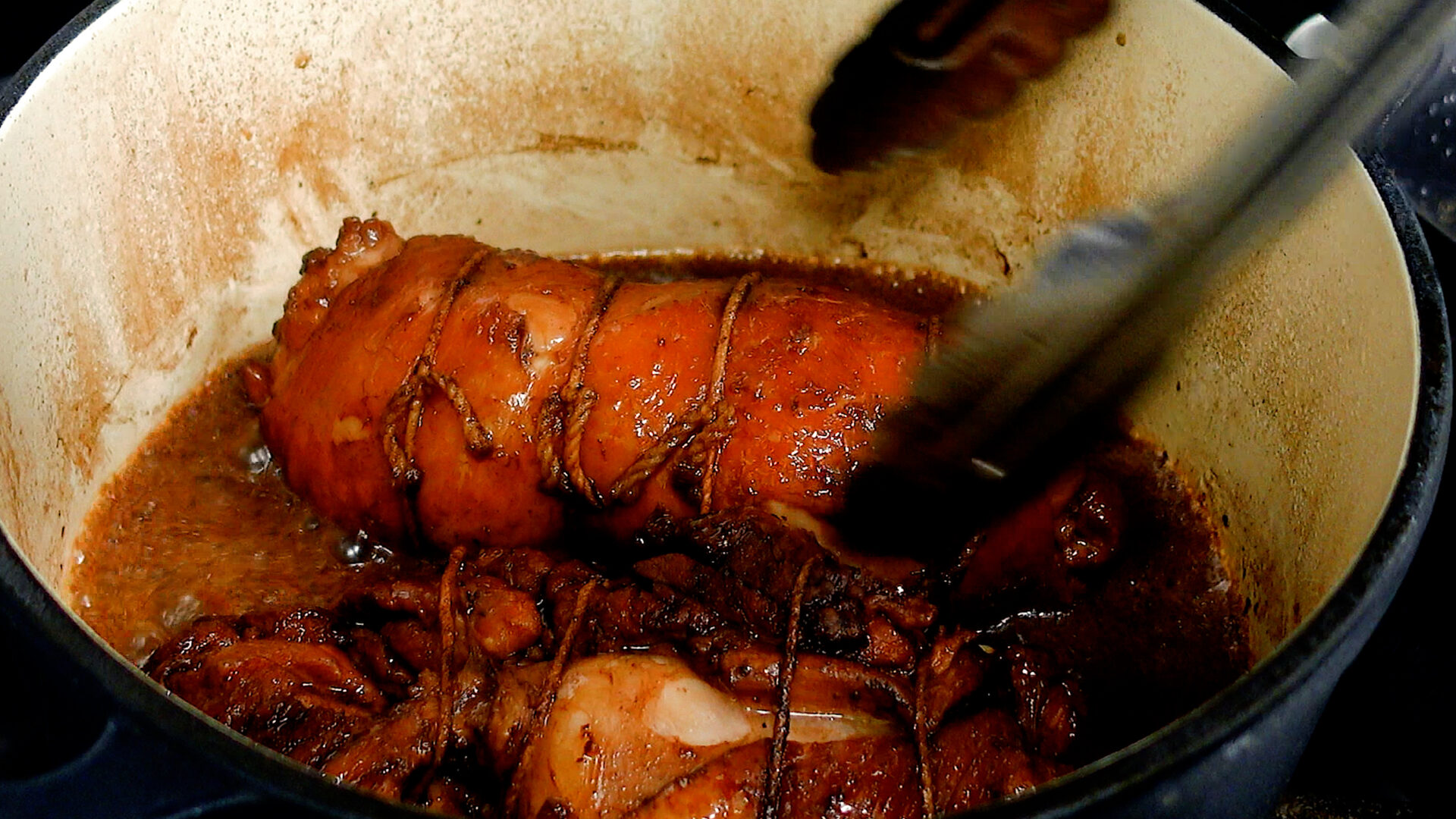 10分後、1~2分ほど転がしタレを絡めたら、もう一度落し蓋、蓋をして火をとめ、10分おく(途中5分で上下を入れ替える)。