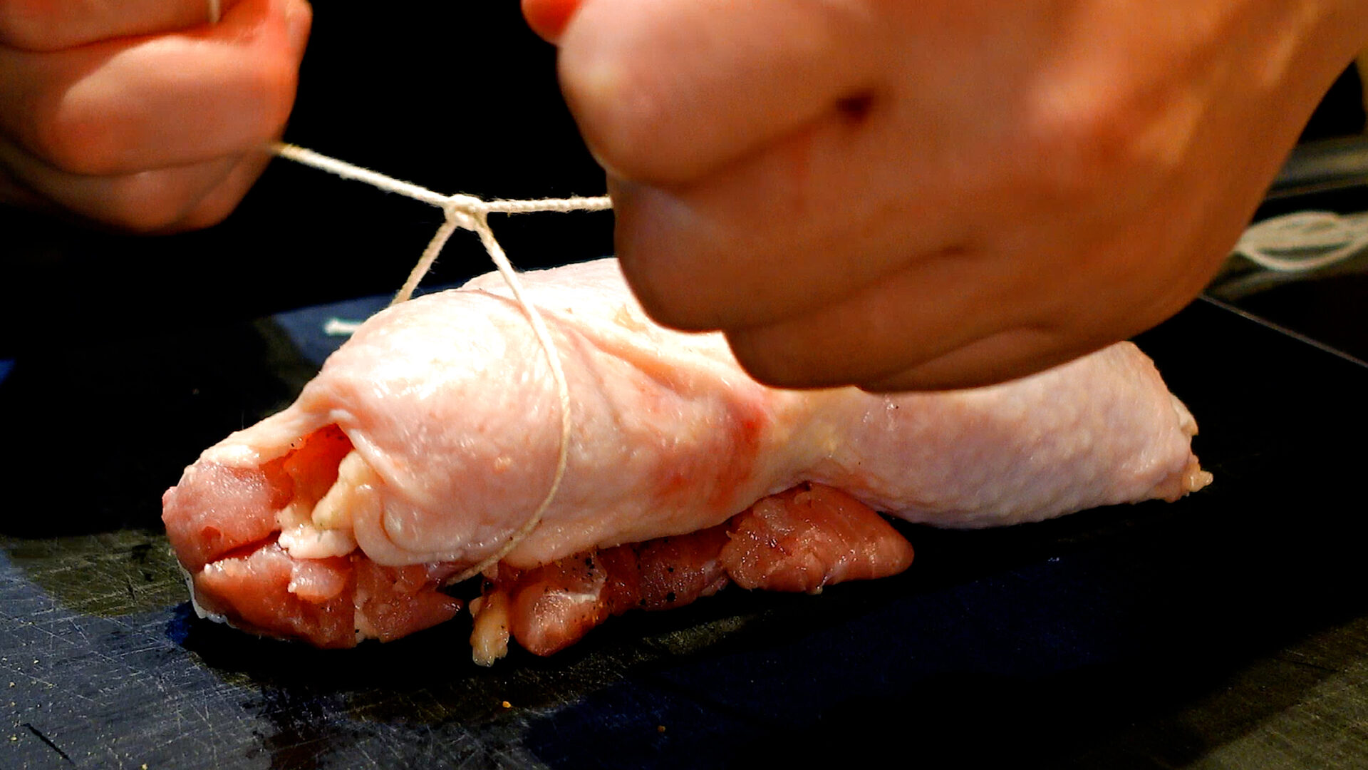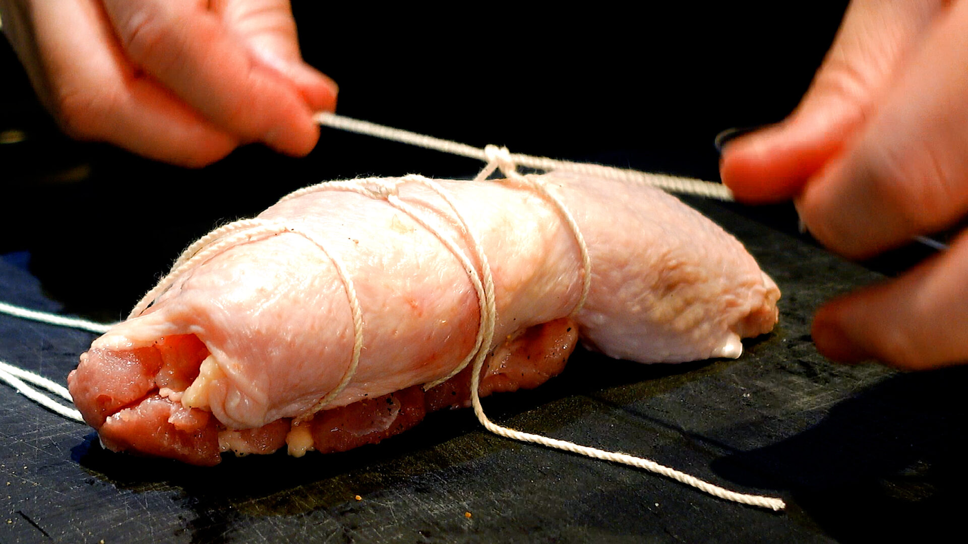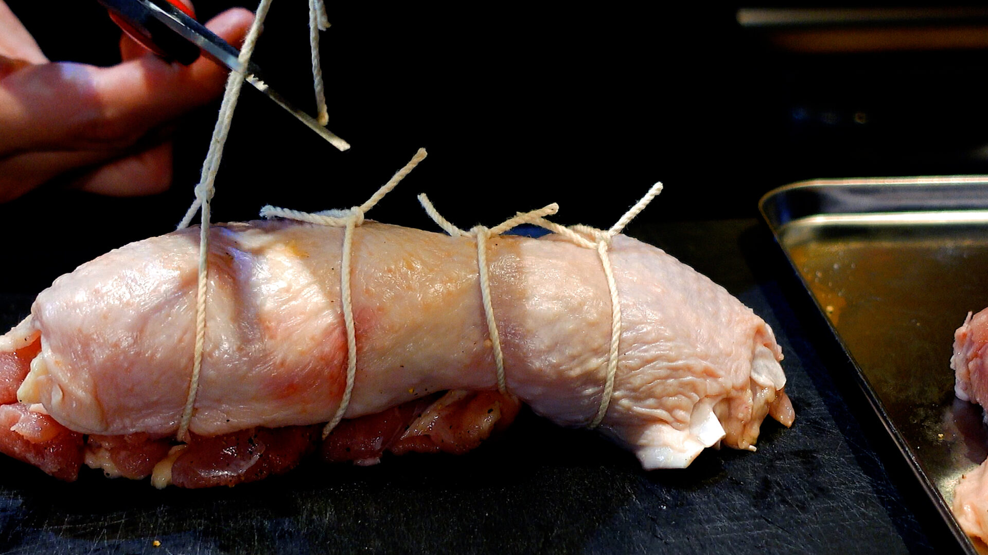 💡肉は火を通すと膨張するため、タコ糸で結ぶときは指1本入るぐらいのゆとりをもたせるのがポイント。余分なタコ糸は切っておきましょう。小さい鶏もも肉だと巻きにくいので、1枚300g以上がベター。